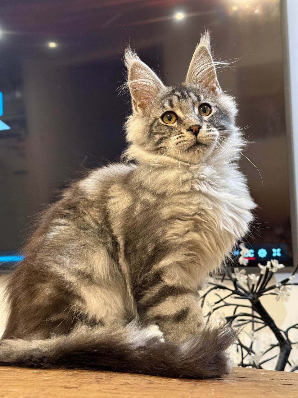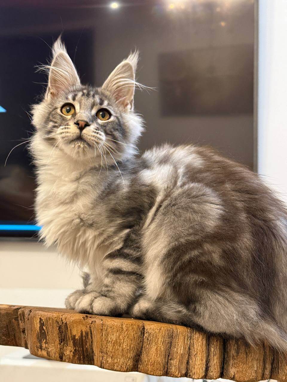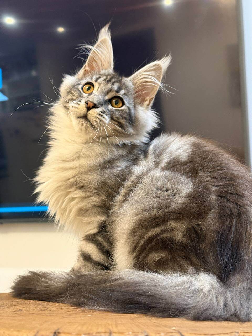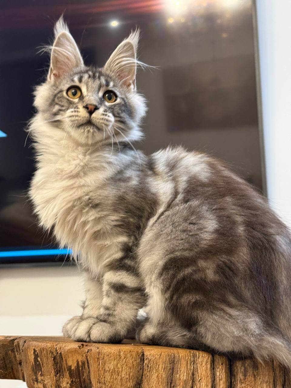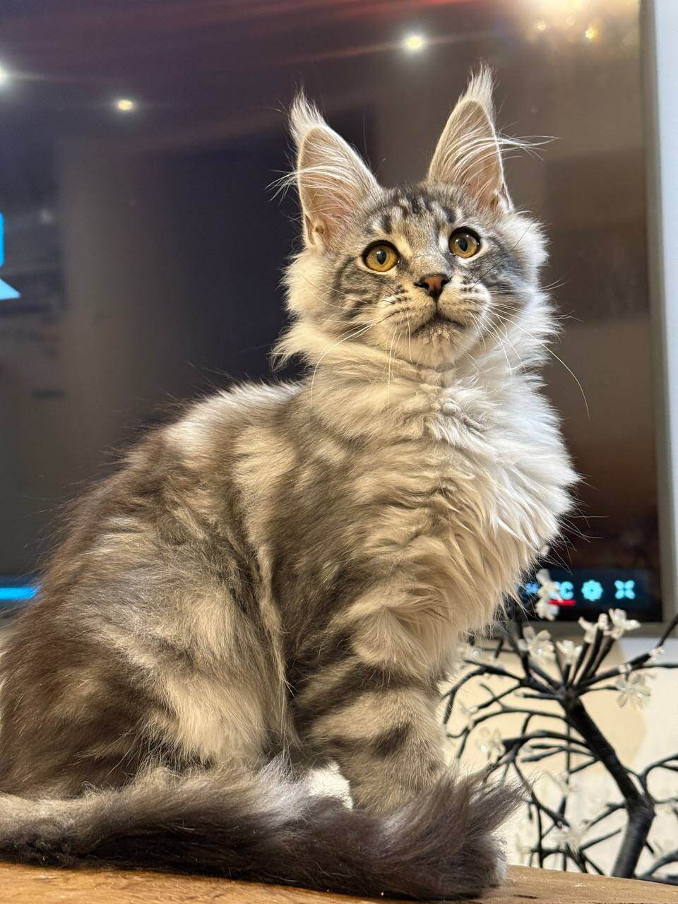 From the moment you meet Acura, a Black Silver Tabby Blotched Maine Coon kitten, you’ll be enchanted by the way her plush, feathery coat ripples under your fingers. Her stunning black and silver marbling catches the light, while those deep yellow eyes—a warm, golden harvest shade—seem to follow every movement, blinking slow trust. Holding Acura, you feel her gentle, substantial presence purring contentedly against your chest.