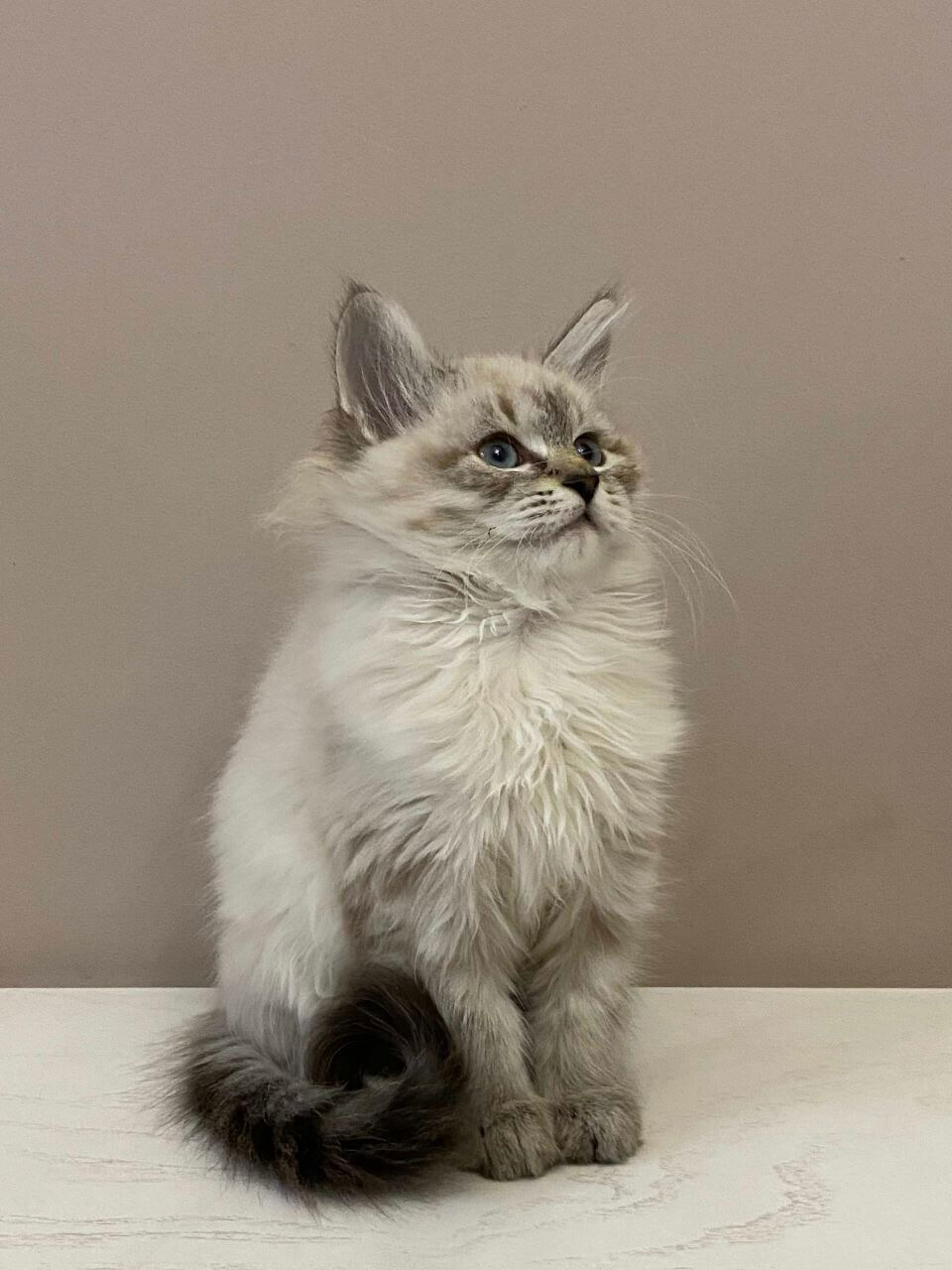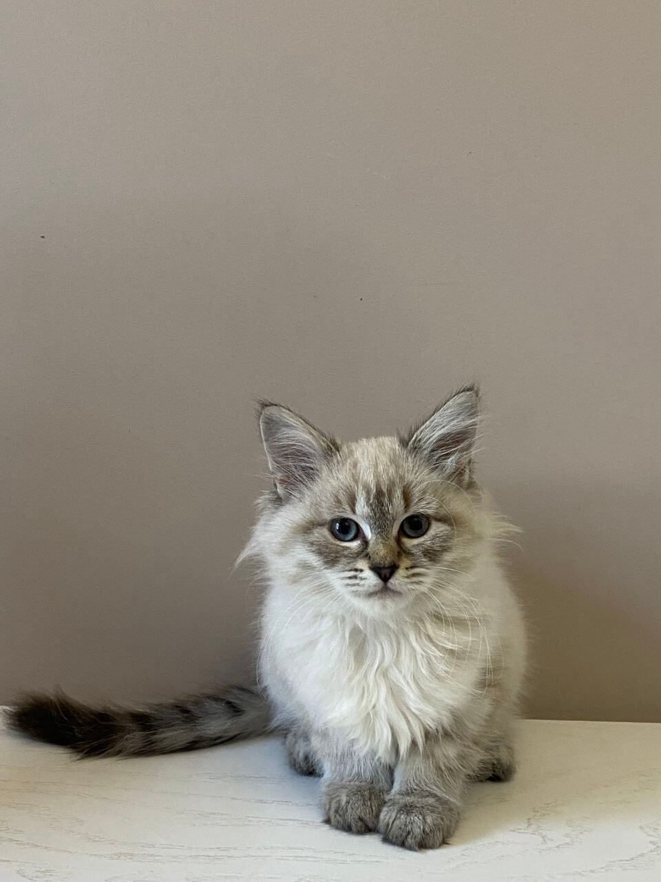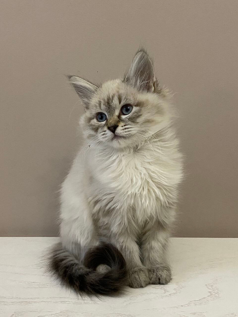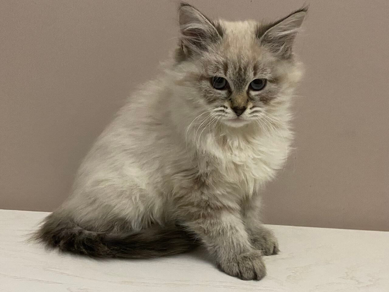 From the very first moment you gaze into Aisha’s sapphire-blue eyes, your heart will melt. This precious female Siberian kitten, with her plush seal tabby point coat and gentle purrs, is ready to bring warmth and joy into your life.
