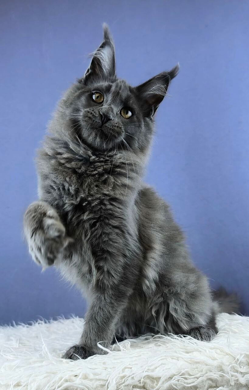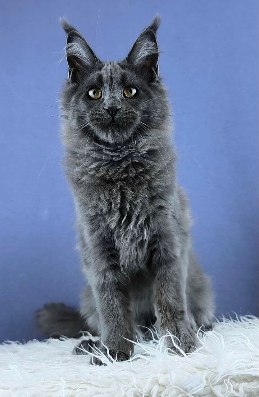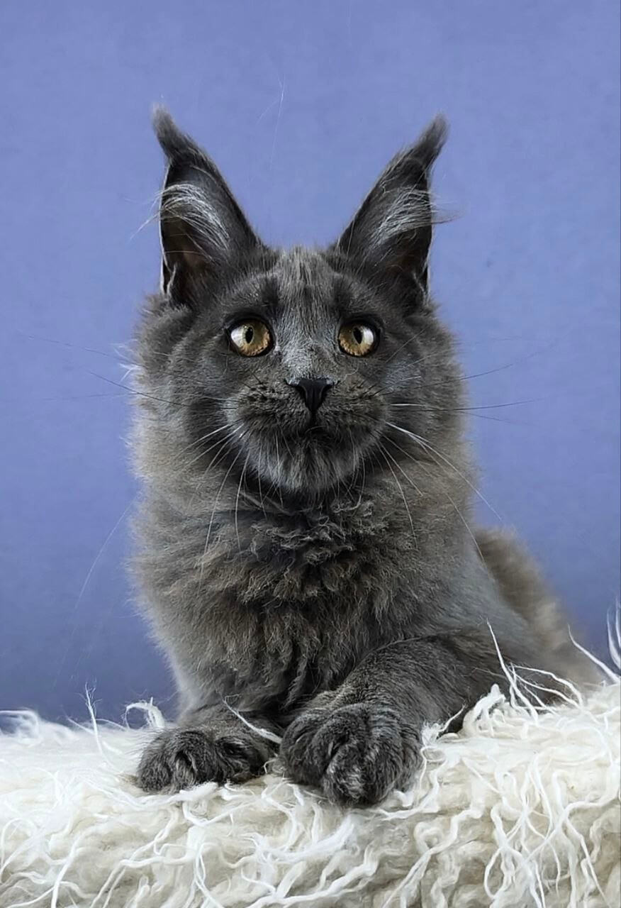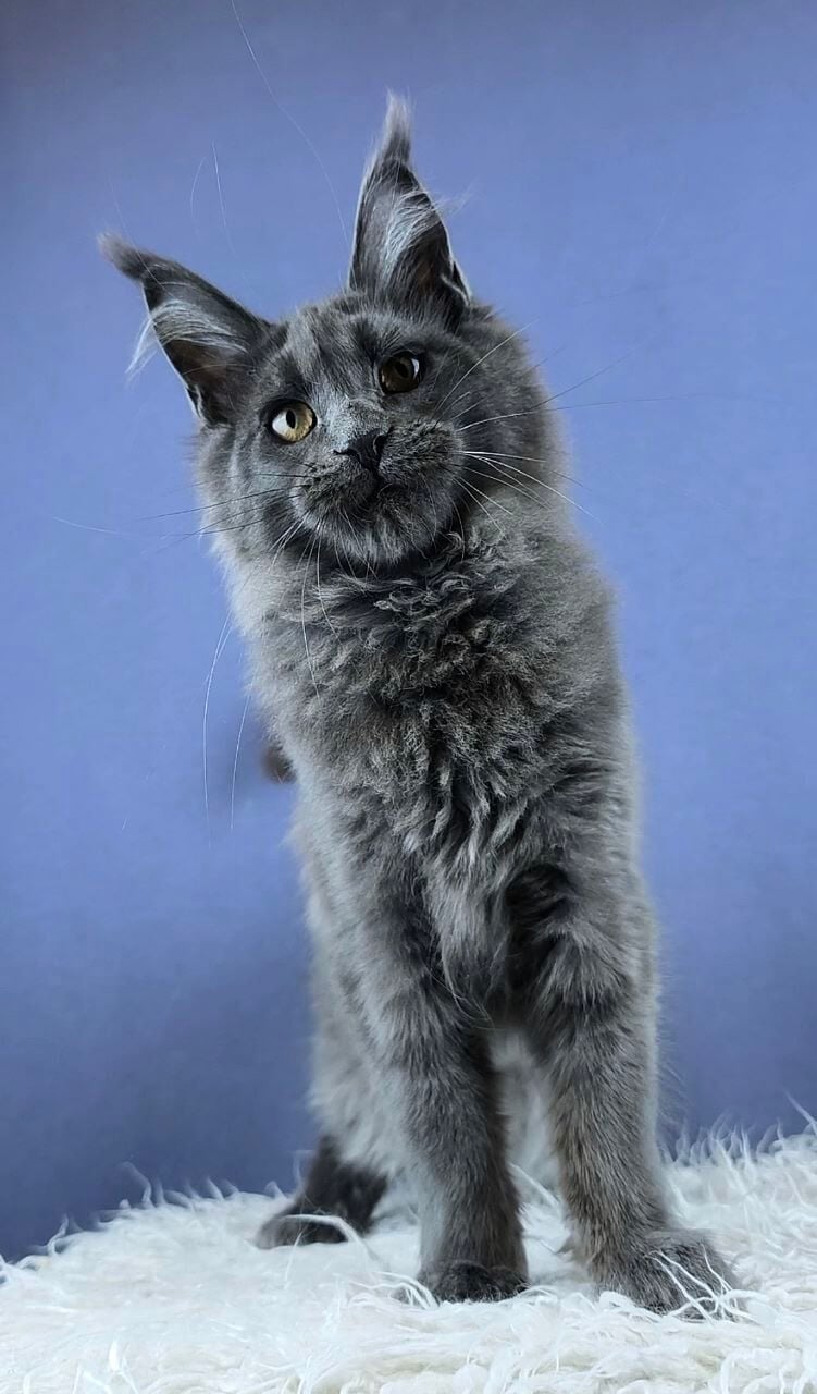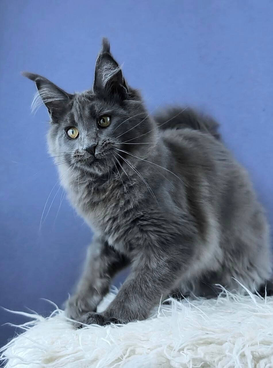 Meet Alena, a Blue Maine Coon kitten with a mesmerizing presence that draws you in immediately. Her plush blue fur is silken to the touch, with a soft undercoat you’ll love to run your hands through. When she looks up, her round yellow eyes glow like warm lanterns, following you with gentle curiosity from every corner of the room.