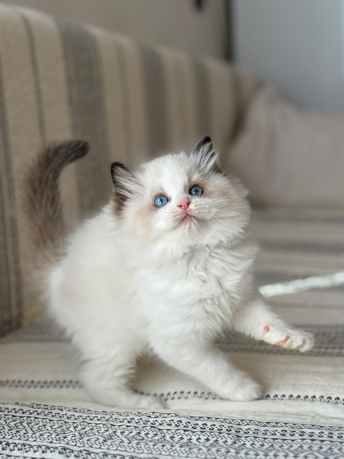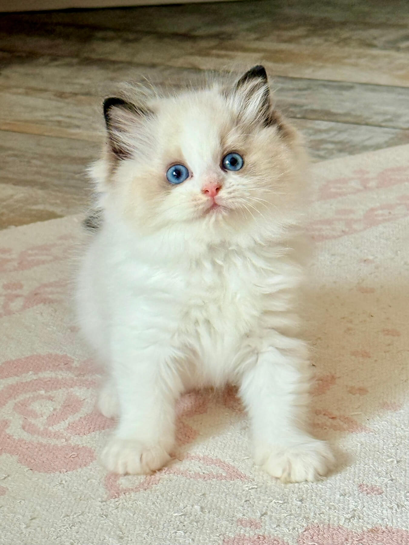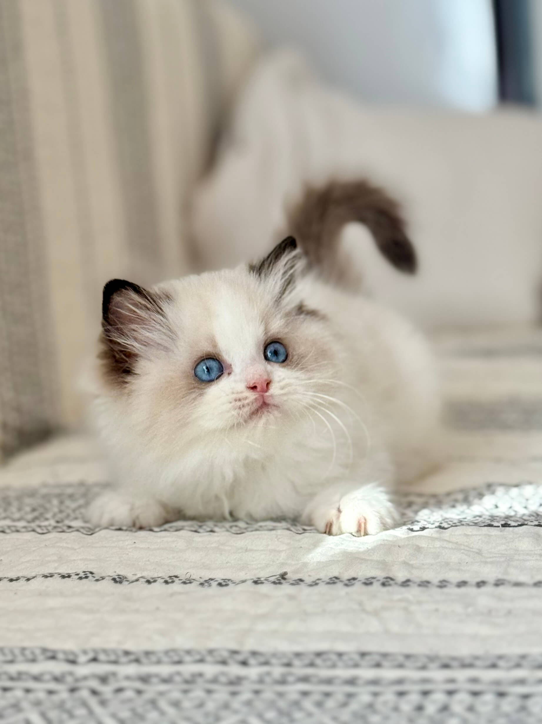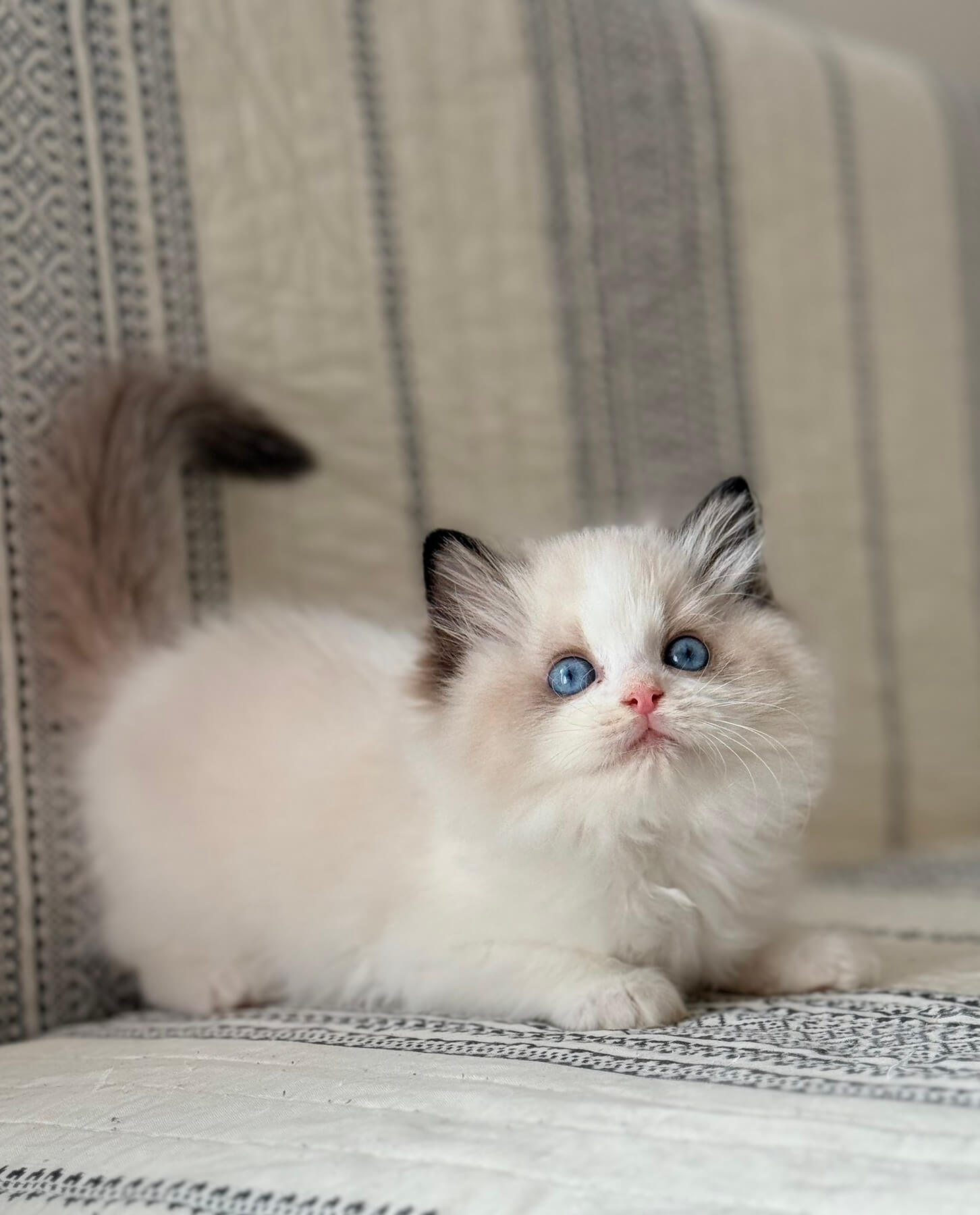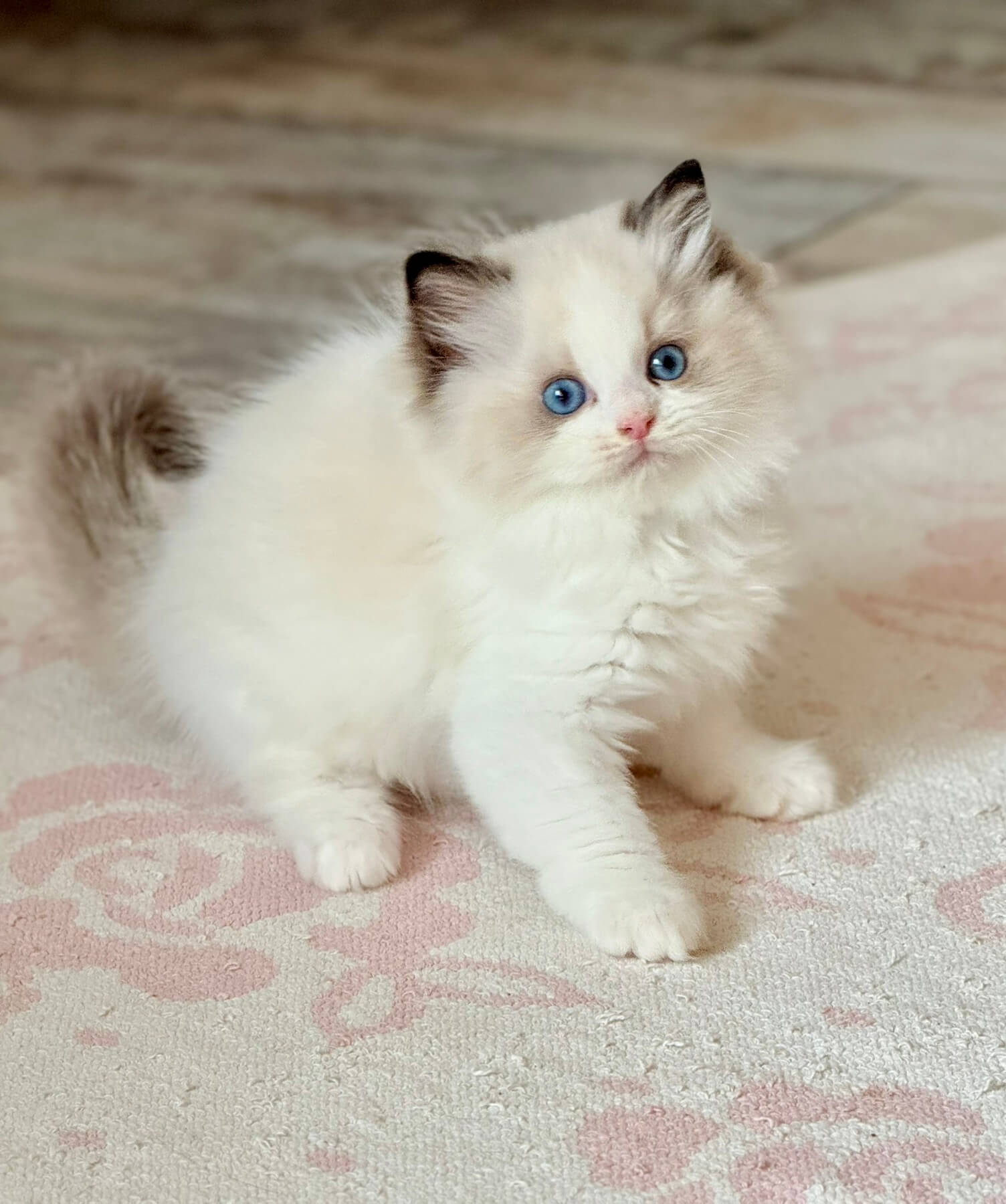 Meet Alice, a stunning female Ragdoll kitten available for adoption. With a beautiful seal bicolor coat and striking blue eyes, Alice is a show-quality kitten from champion bloodlines. Born on 8/4/2025, Alice will be ready to join her new family by 12/4/2025. She comes with a pedigree on request and is registered. Alice is offered as a pet, and will be spayed before joining her new home.