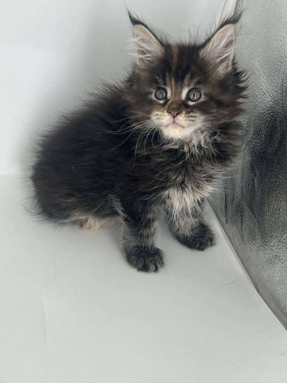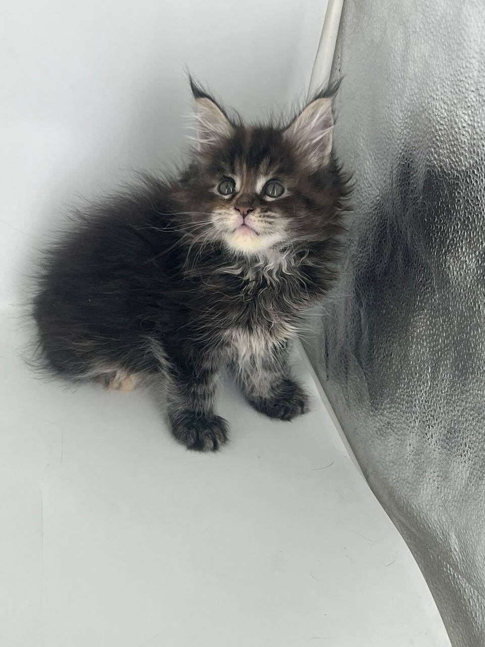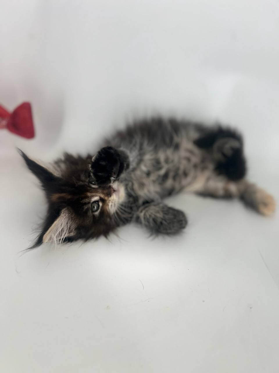 Alka’s coat is a mesmerizing tapestry of black tortie silver, luxuriously thick and feather-soft, with glints of smoky silver that catch the light when she stretches in a sunny window. Her large, expressive yellow eyes meet yours with an almost golden warmth, while her silky ruff beckons your hands for a gentle touch. The Black Tortie Silver Maine Coon kitten you’ve dreamed of feels regal and comforting in your arms.