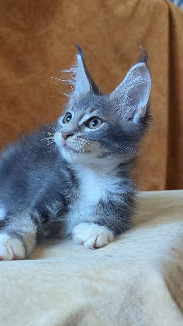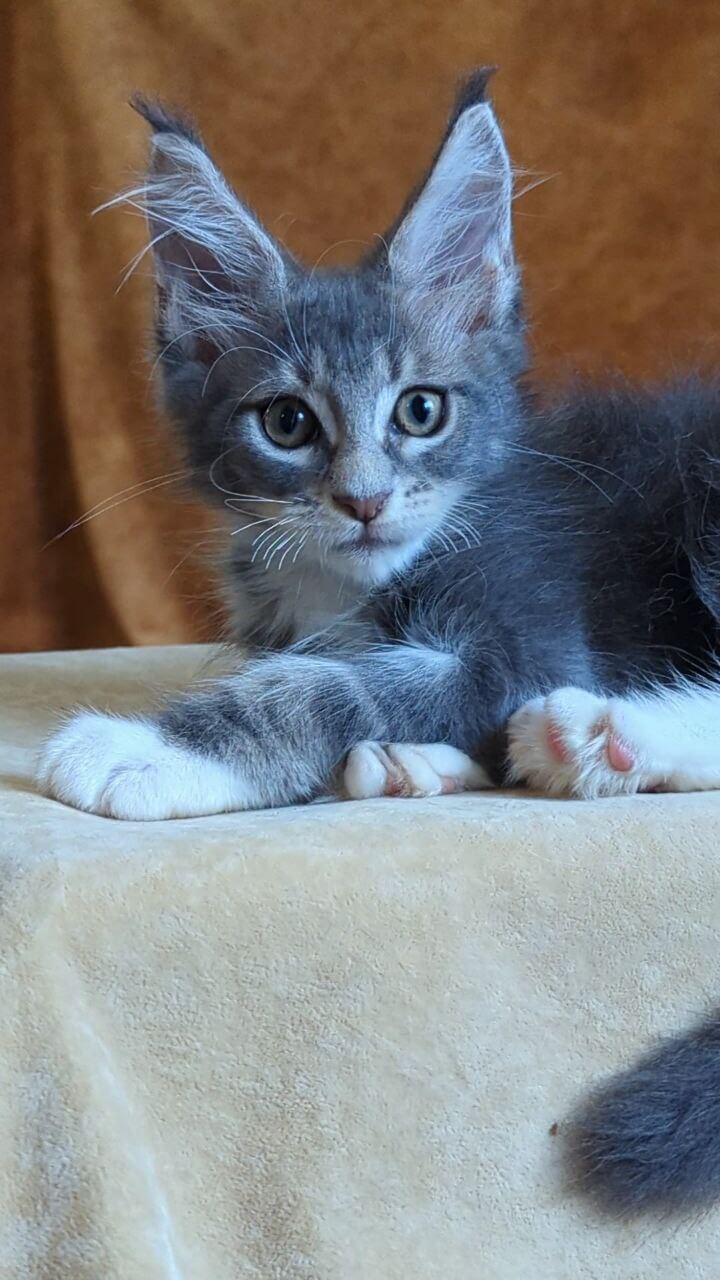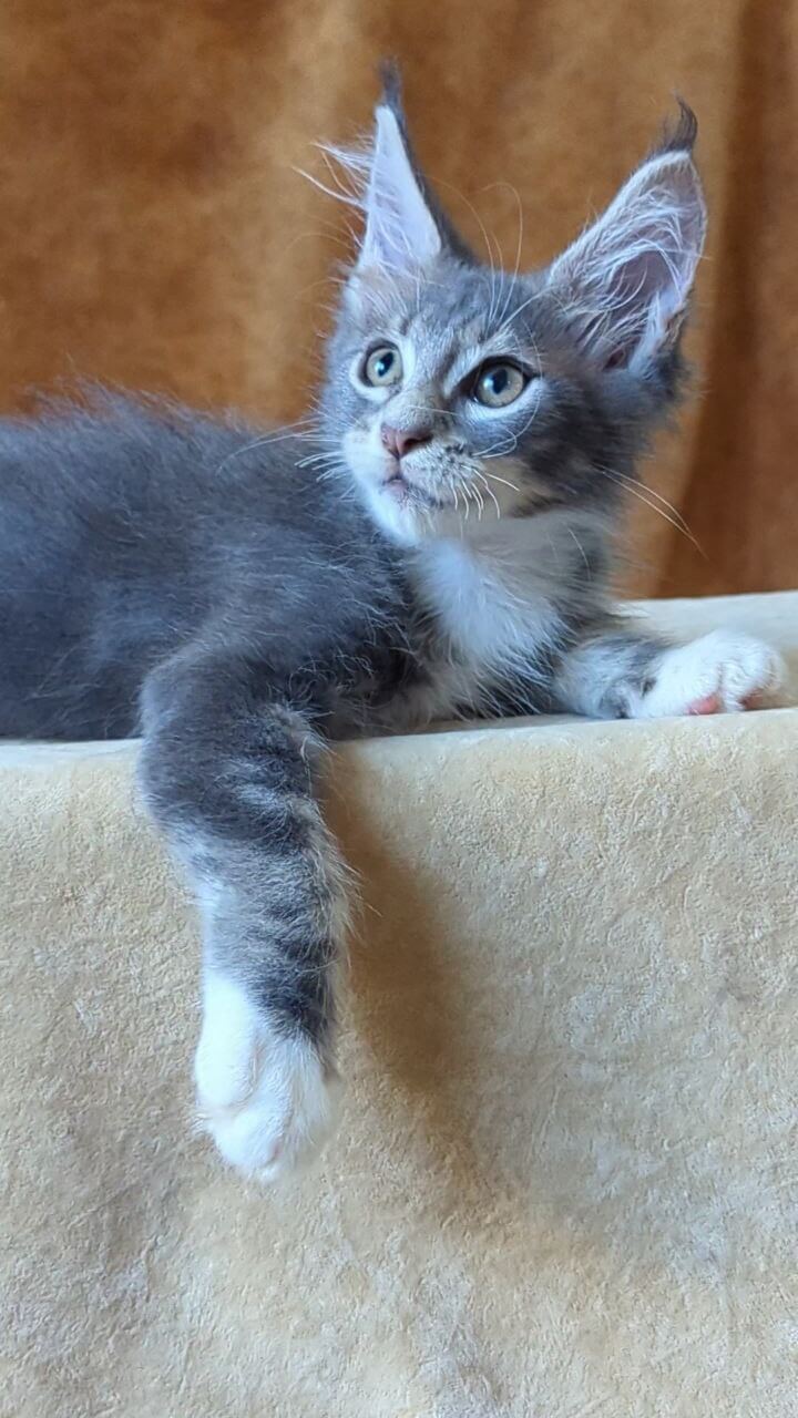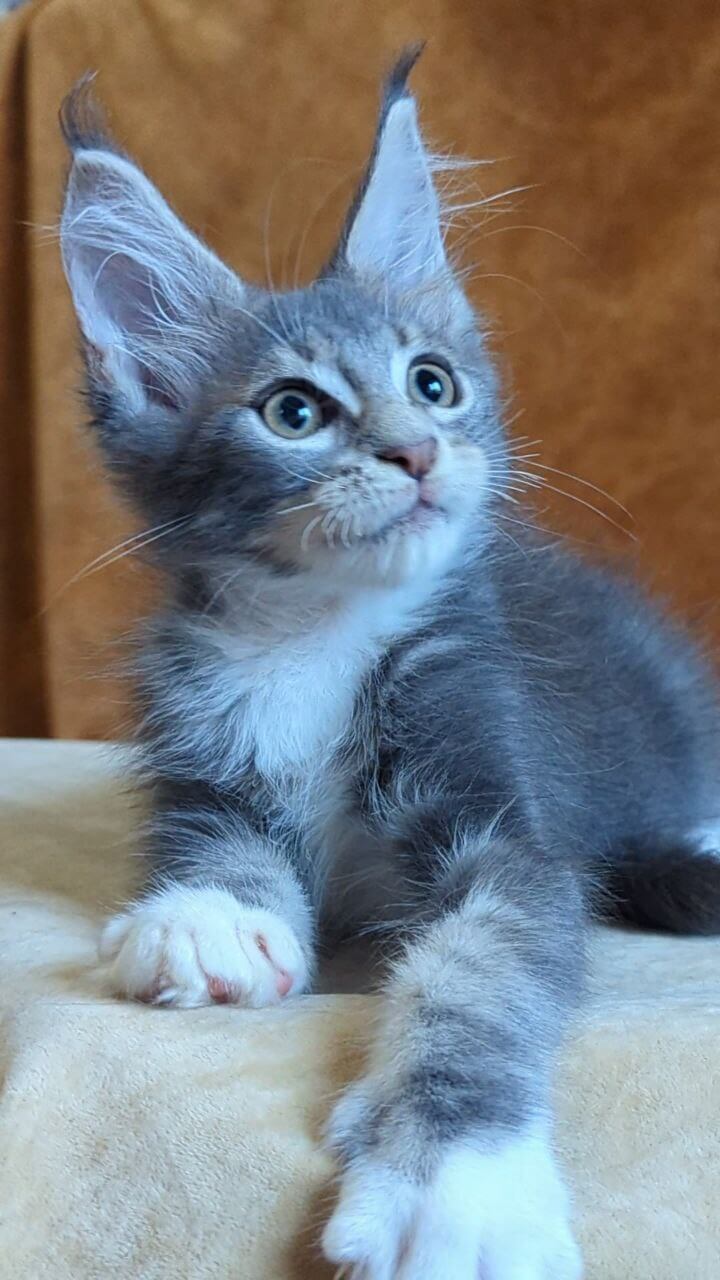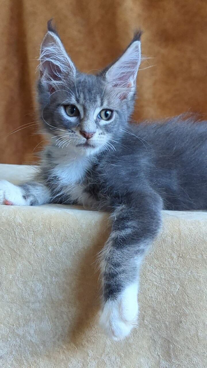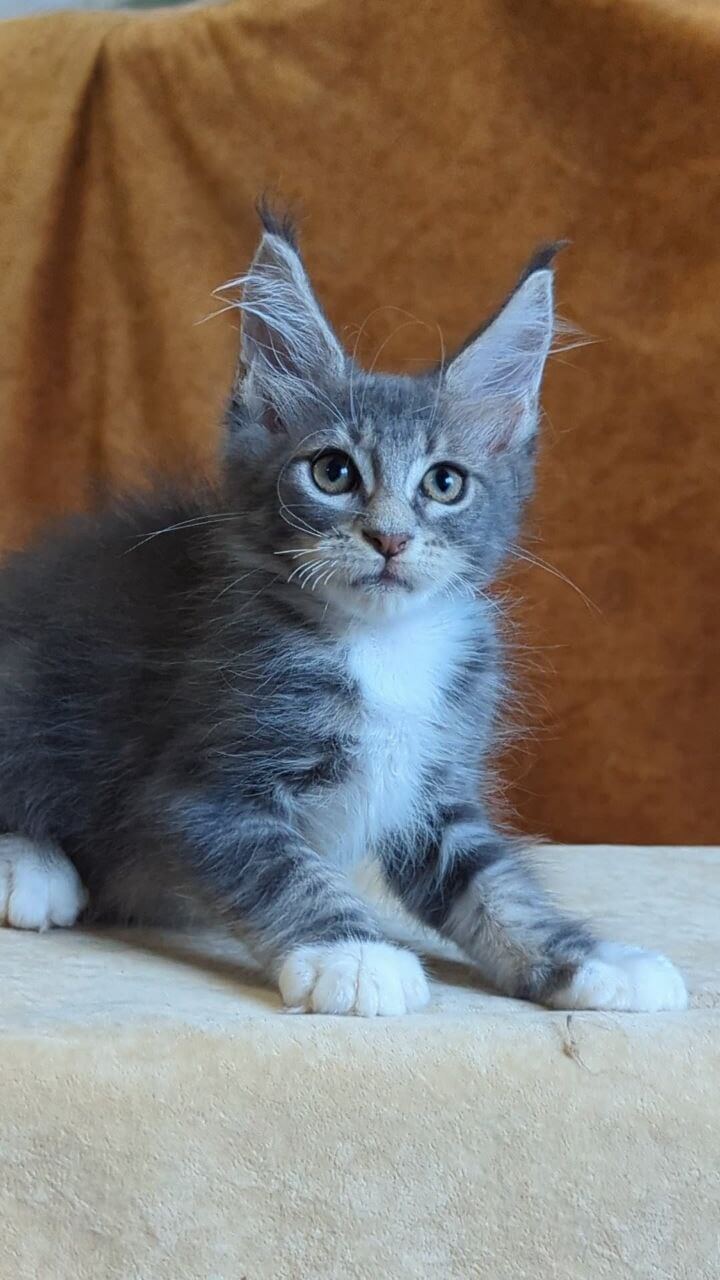 Meet Alvaro, an exquisite male Maine Coon kitten, ready to capture your heart! Sporting a stunning blue coat with charming white accents, Alvaro boasts captivating yellow eyes that are sure to turn heads. Born on August 5, 2025, this show-quality kitten comes from champion bloodlines, promising both beauty and a delightful personality.