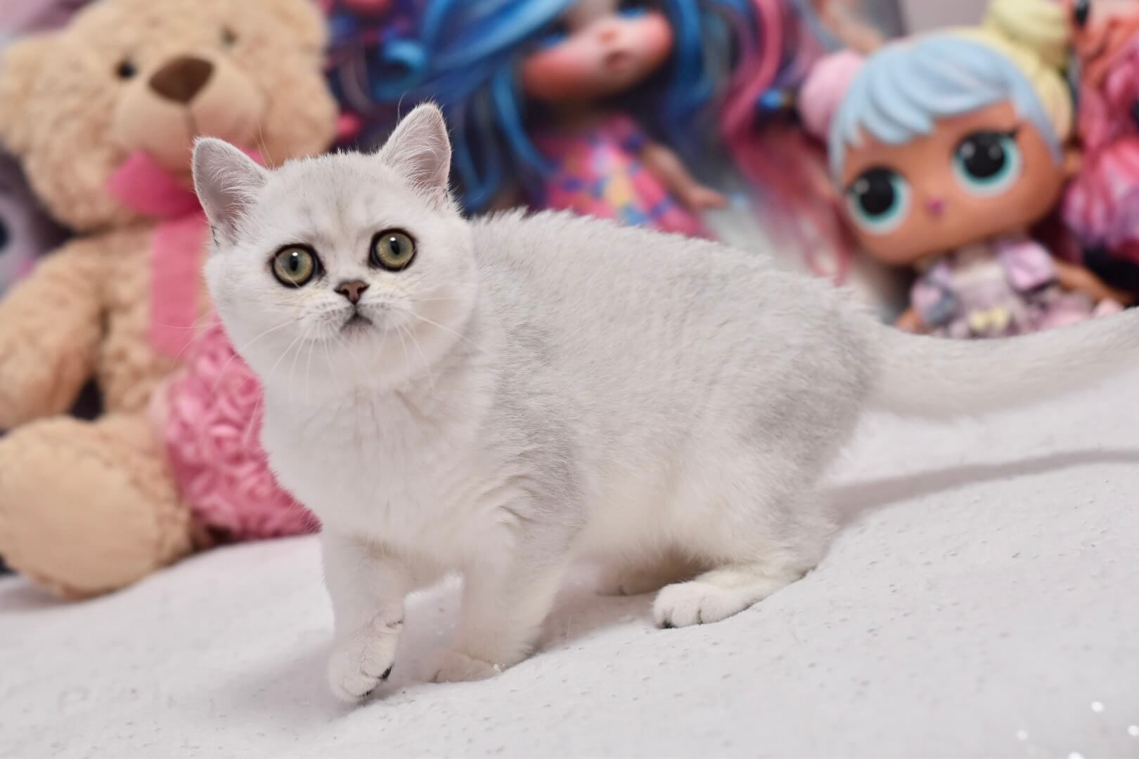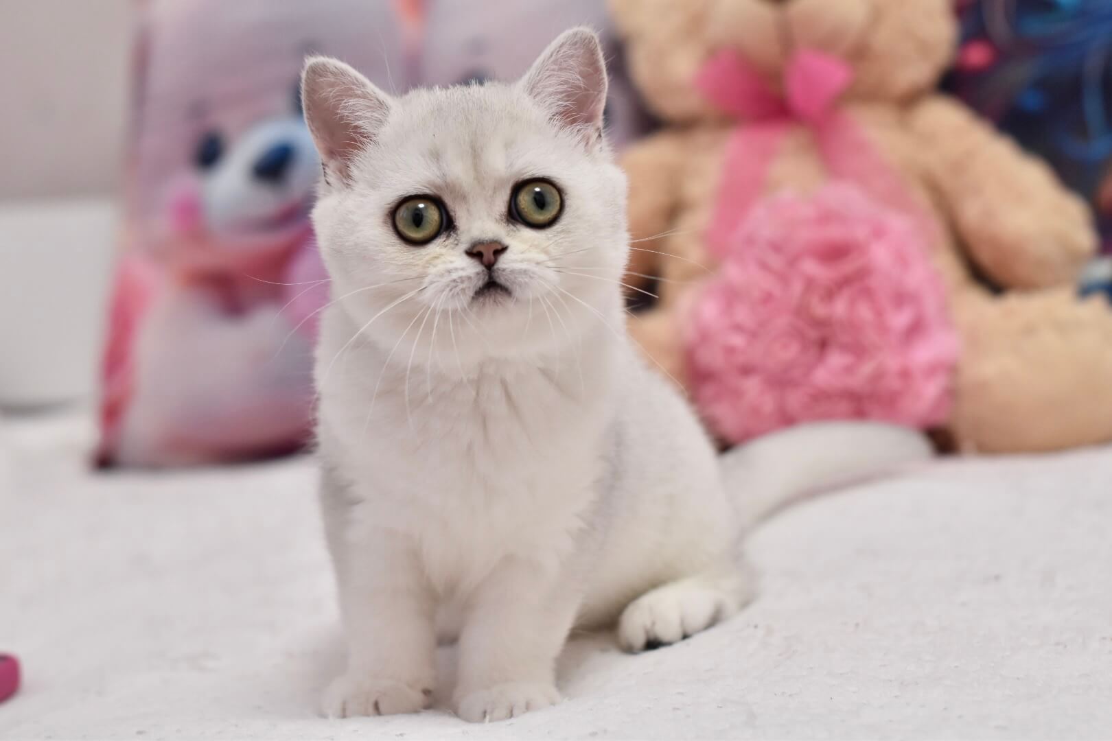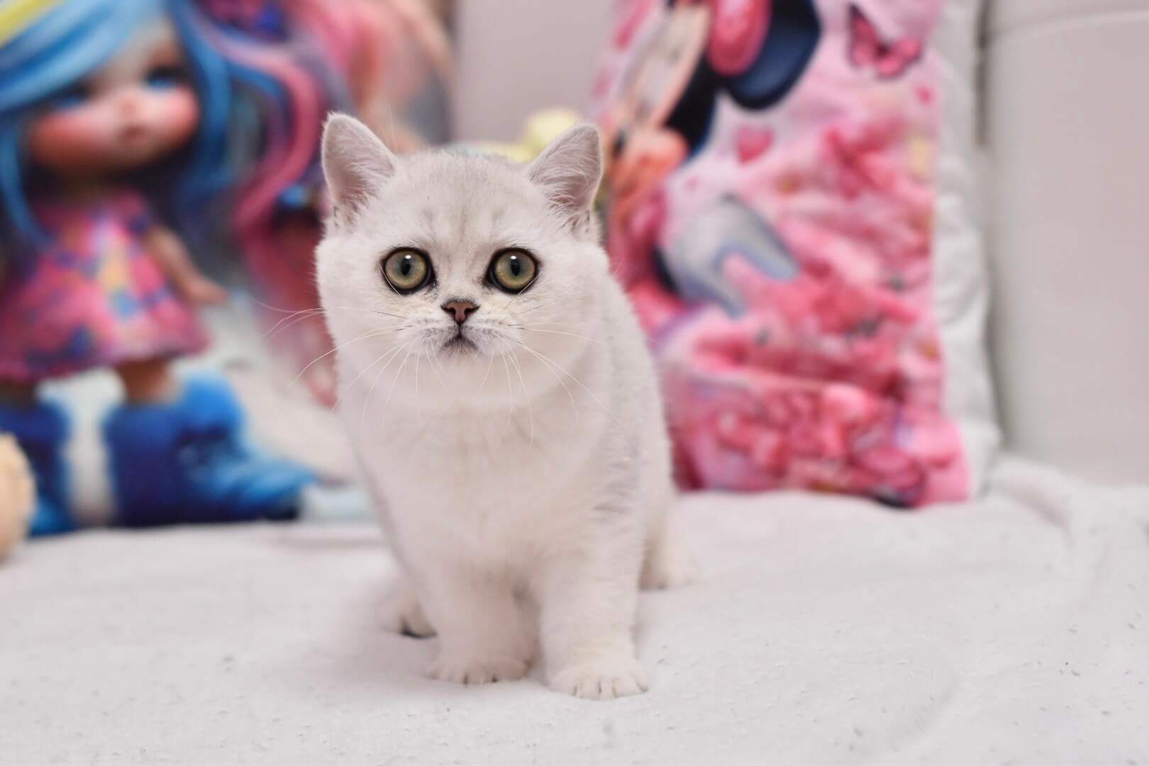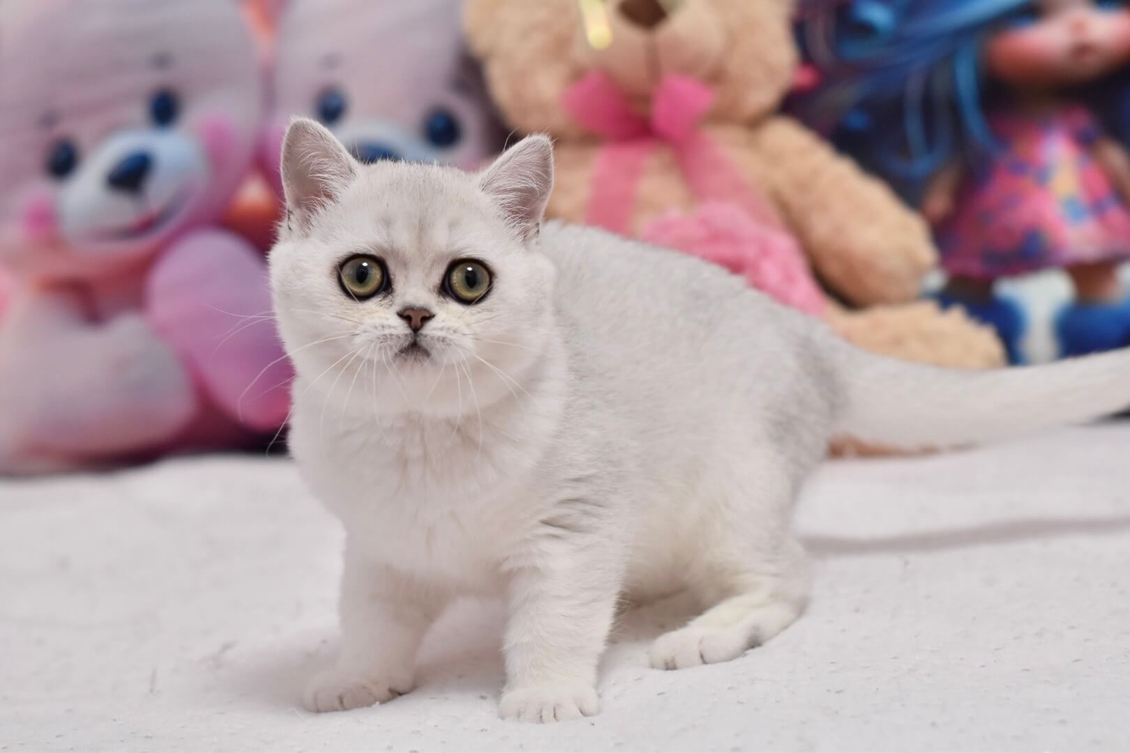 A gorgeous Black Silver Shaded British Shorthair kitten, Annabelle greets you with a velvet-soft coat shimmering with silver glints beneath your fingers and a lush ruff framing her round, emerald-green eyes. There’s true magic when she curls in your arms, her purr thrumming deep—the unique presence of a kitten bred for companionship and beauty.