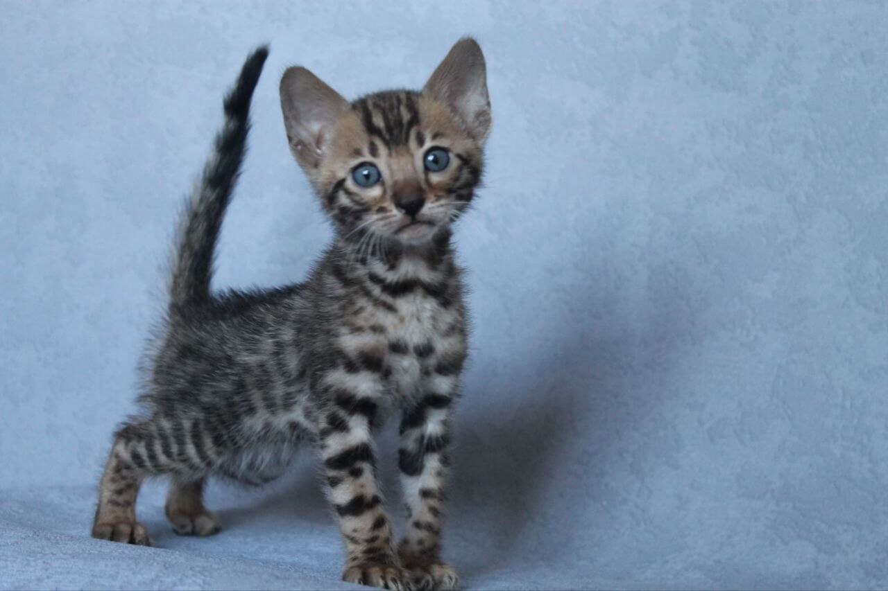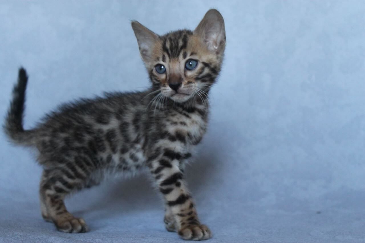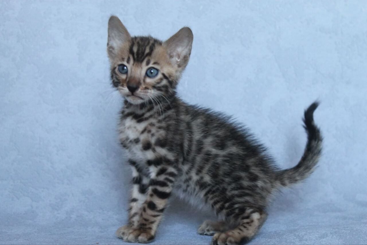 When you meet Archi, our Black Tabby Spotted Bengal kitten, his shimmering coat and bold yellow eyes immediately draw you in. His fur is silk-soft to the touch, with inky rosettes and flecks that seem to change in every light. Resting in your lap, Archi gently kneads his paws, sharing a quiet warmth you’ll feel deep in your chest.