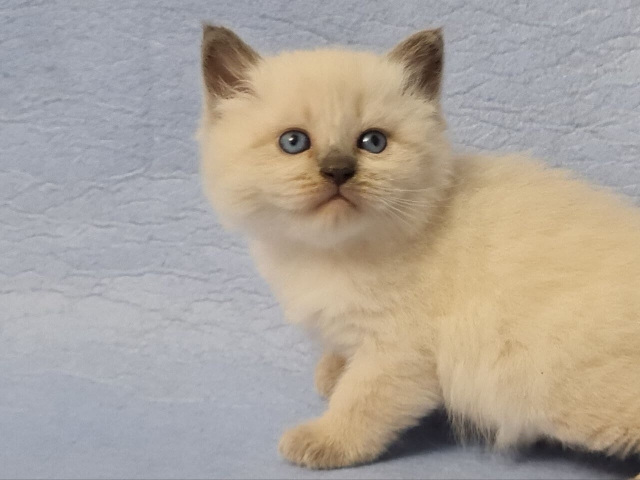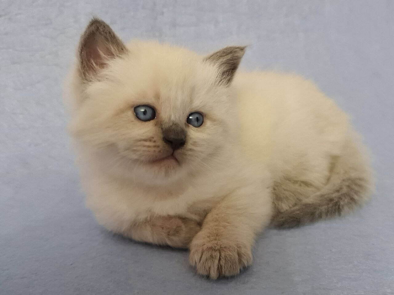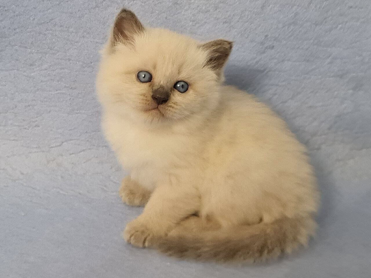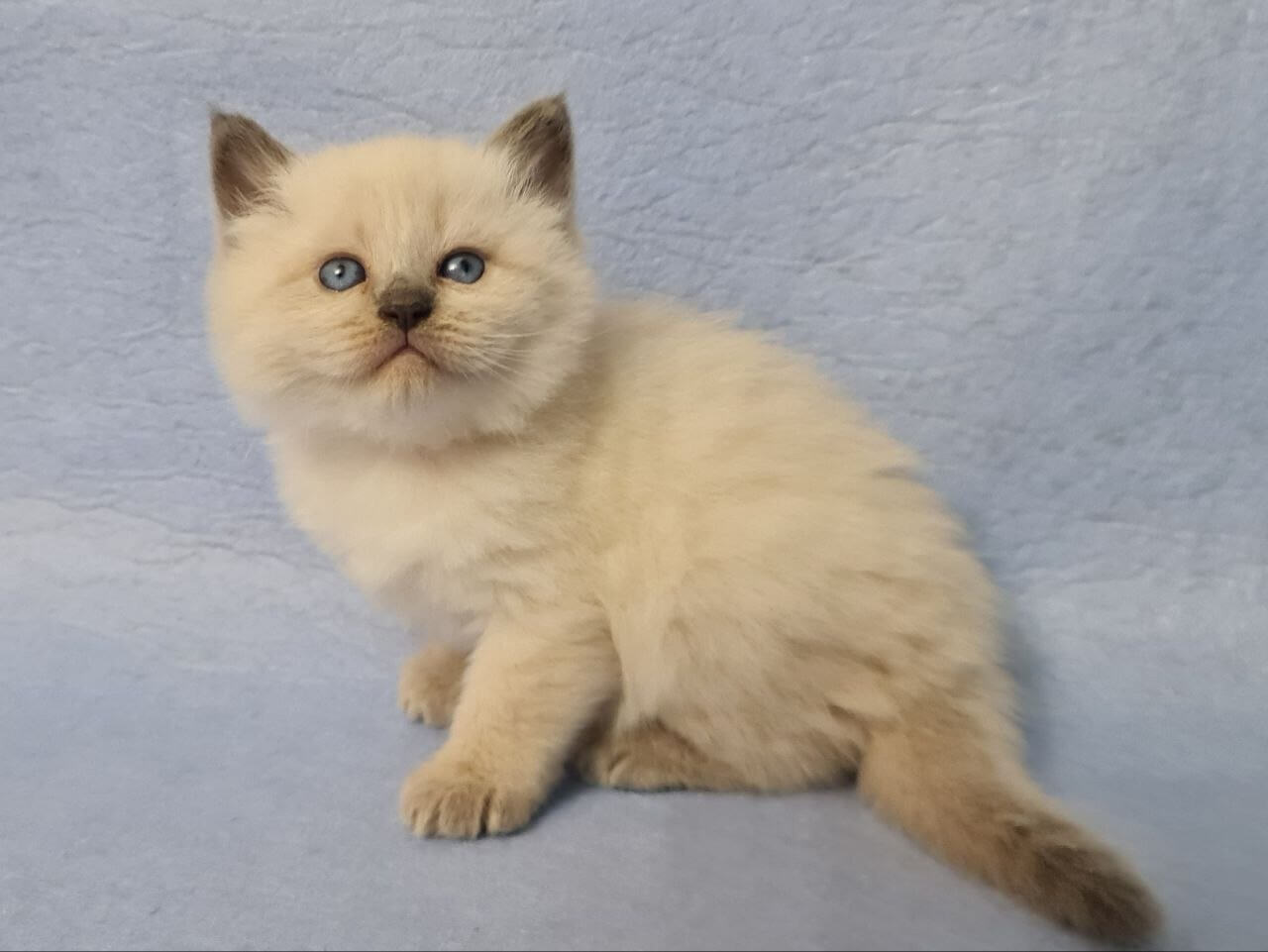 Reach out your hand and meet Archie, a Seal Tabby Point Siberian kitten whose velvety fur feels like winter sunlight between your fingers. His softly marbled coat, pale as rich cream with gentle tabby swirls, seems to shimmer around his sturdy little frame. Archie’s gaze, a heart-melting blue, meets yours with intelligent curiosity you can feel deep in your chest.