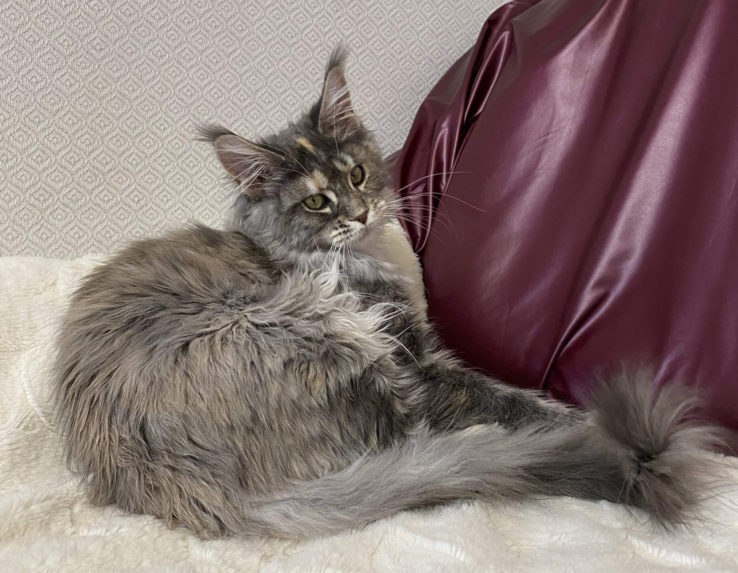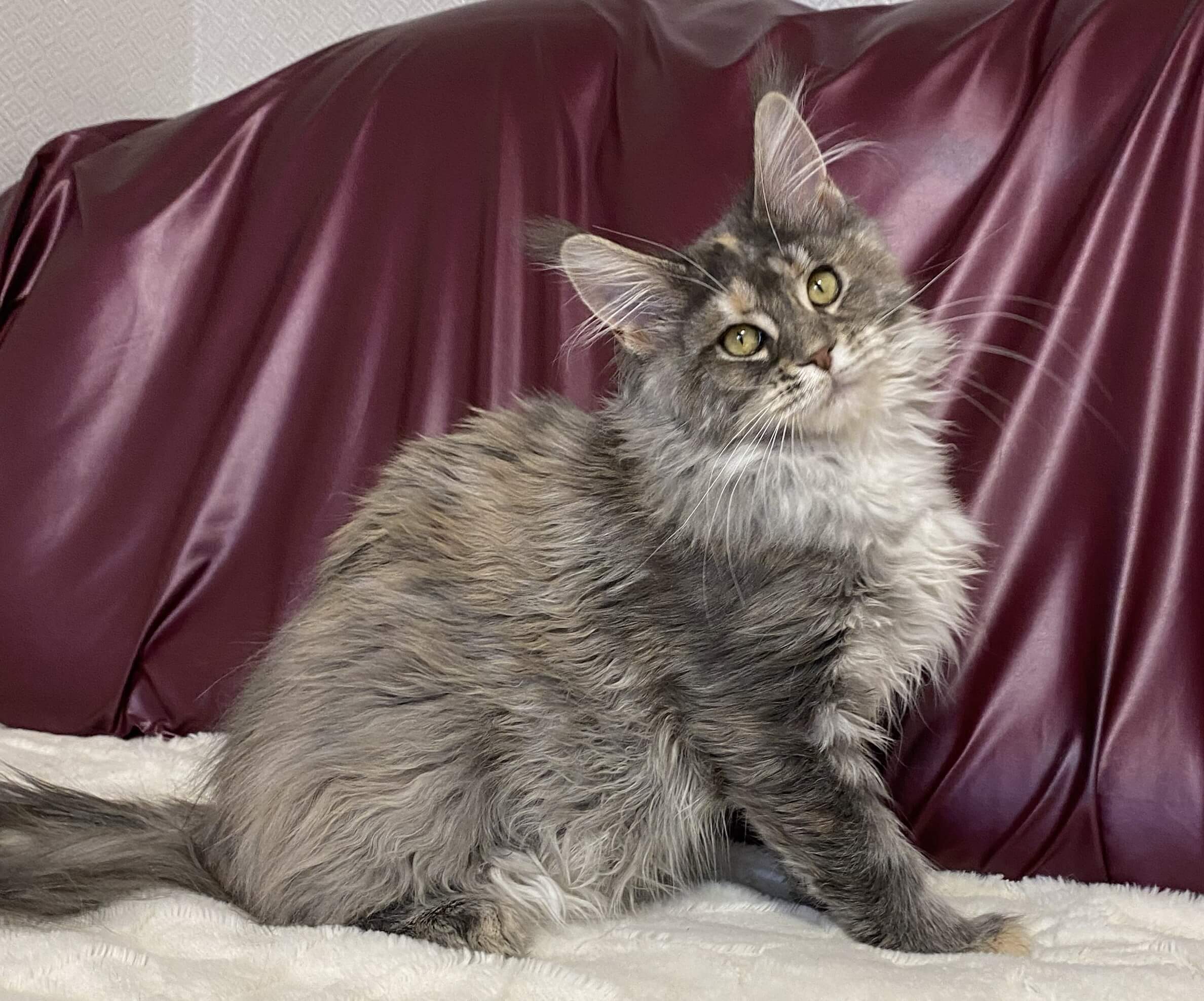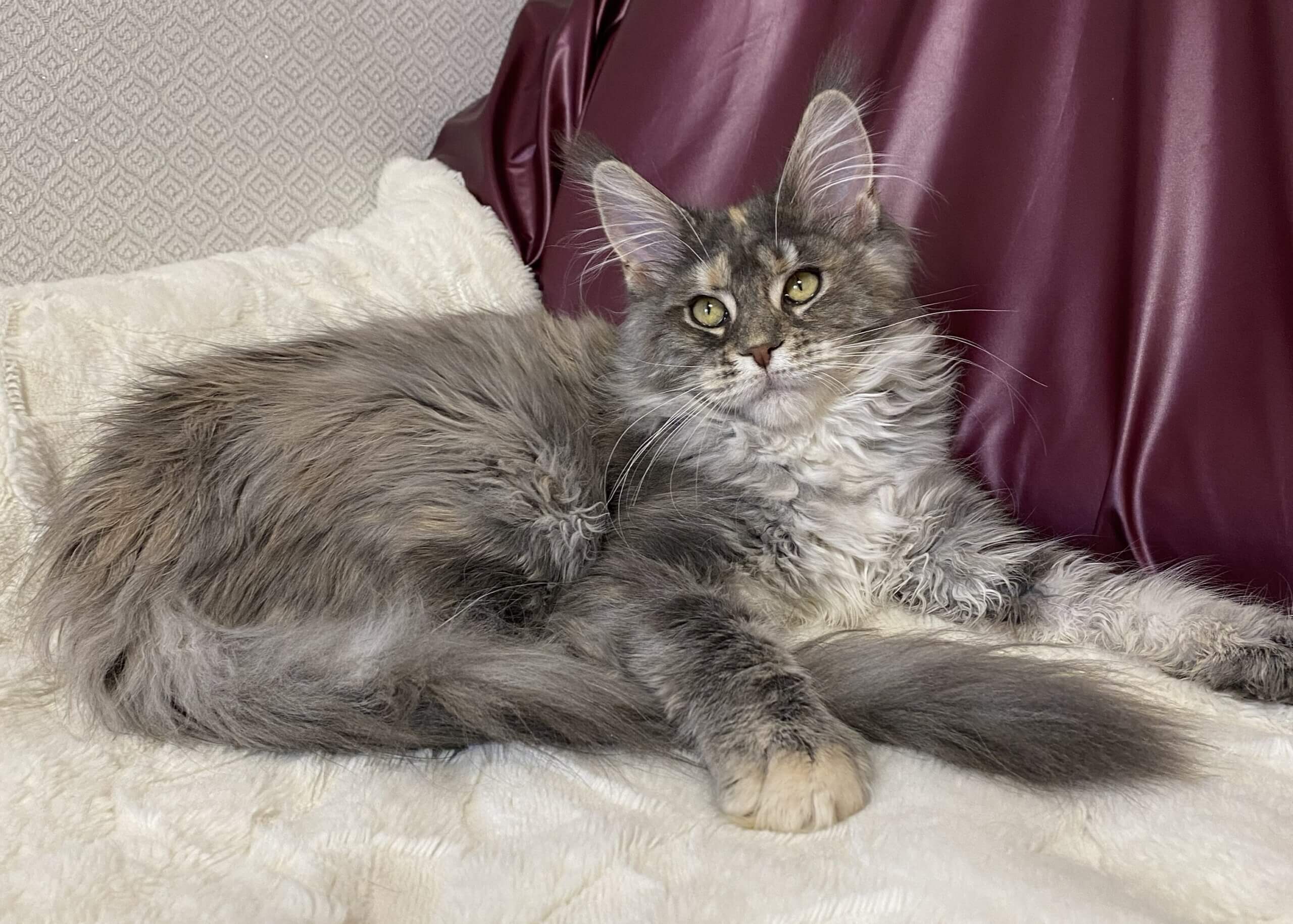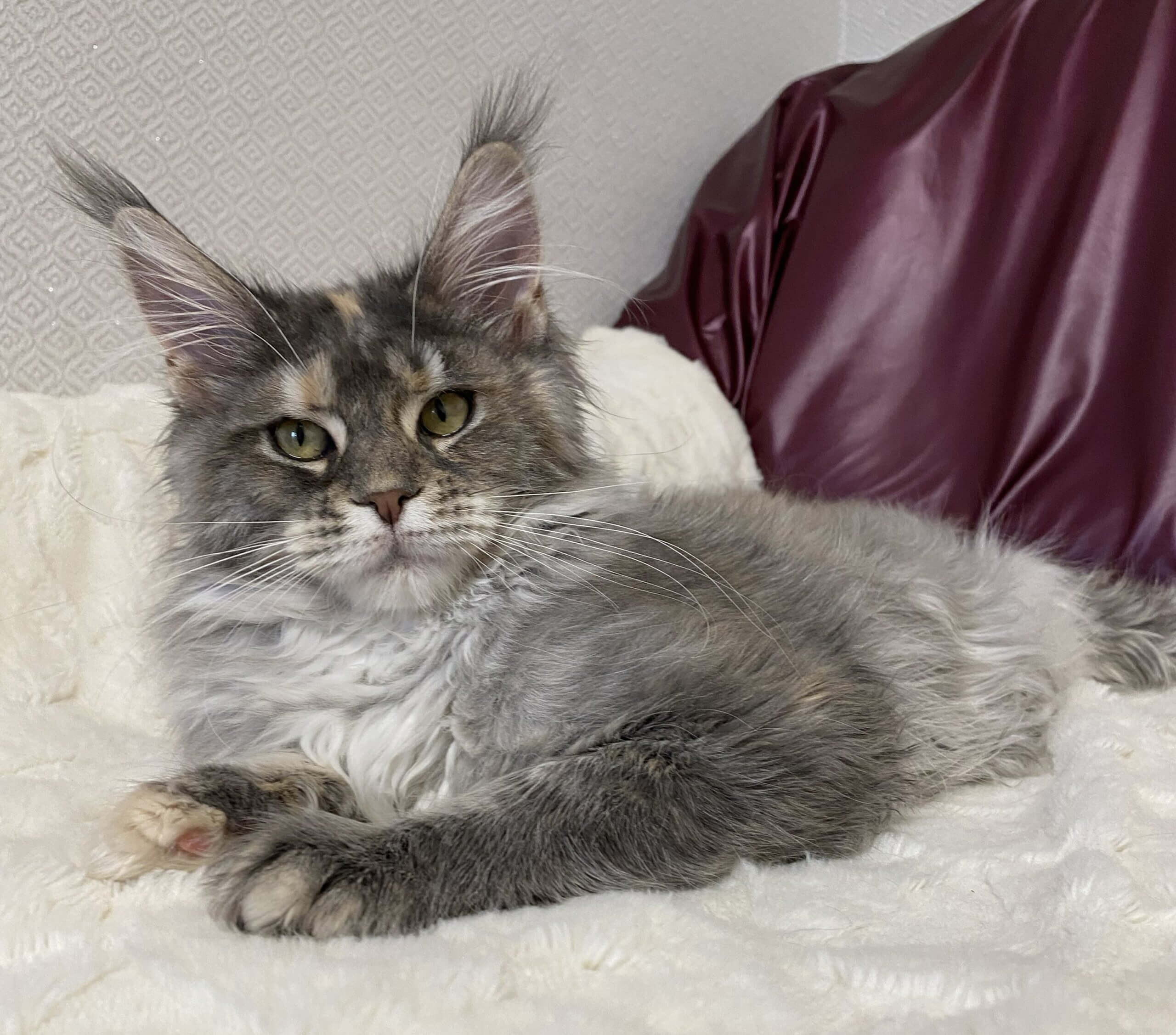 Arine is a Blue Tortie Tabby Blotched With White Maine Coon kitten whose first impression is unforgettable. When you cradle her light but sturdy frame, her silky fur blends patches of dusky blue, cream, and snowy white under your fingers. She watches you with wide yellow eyes—luminescent, curious, and impossibly warm—her gaze soft yet intent, reflecting your affection right back.