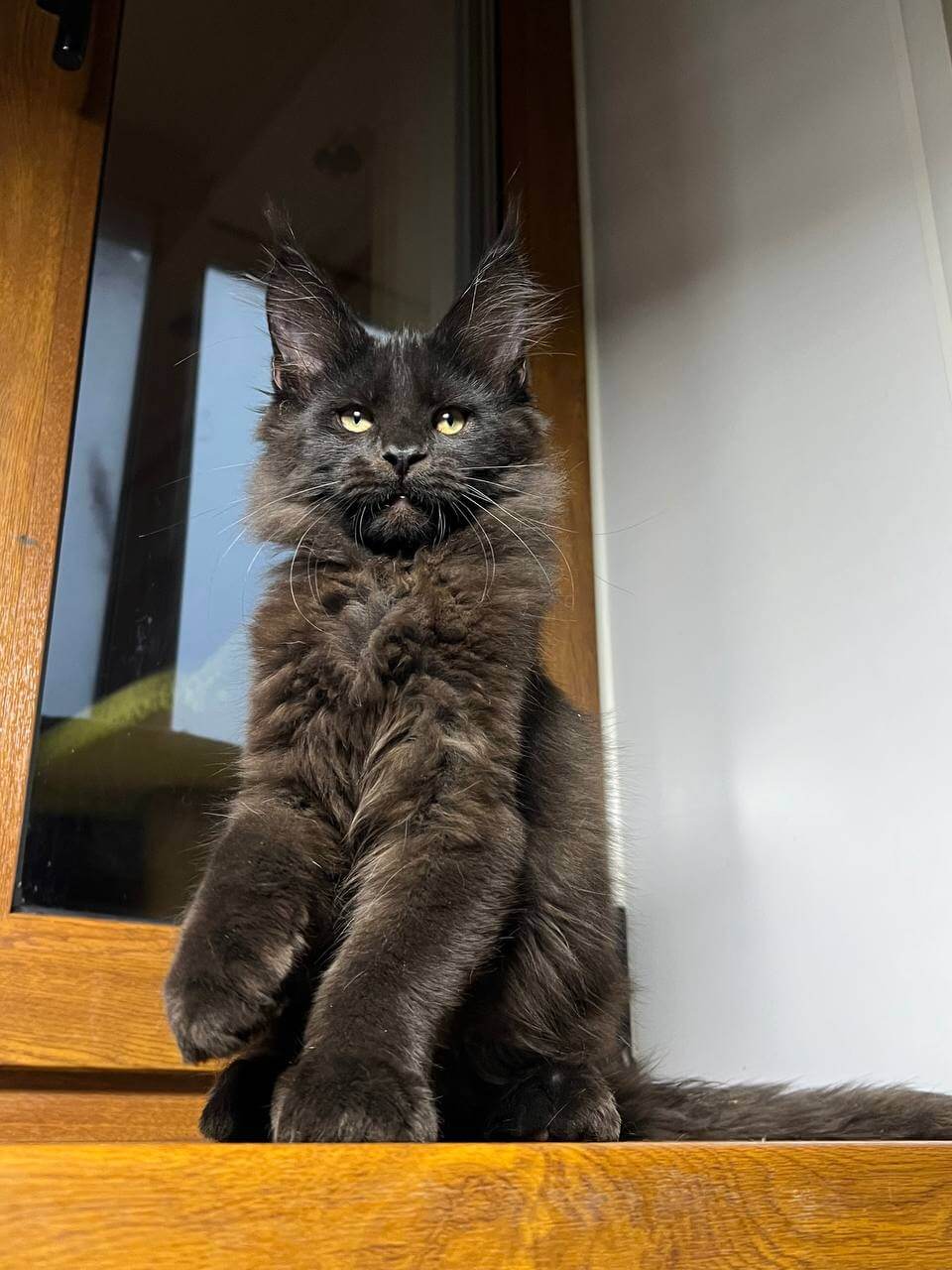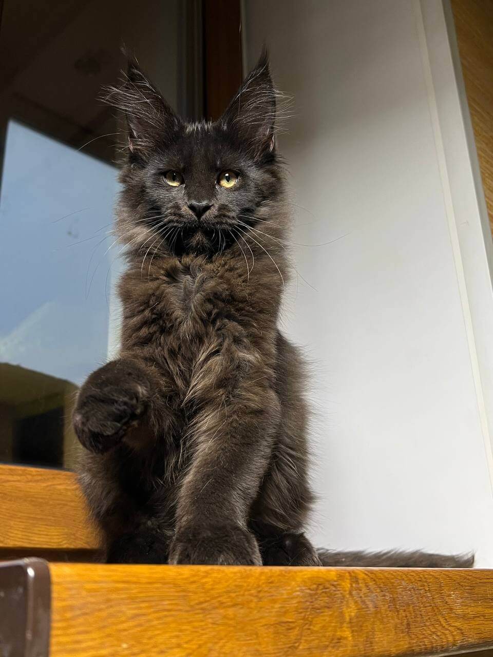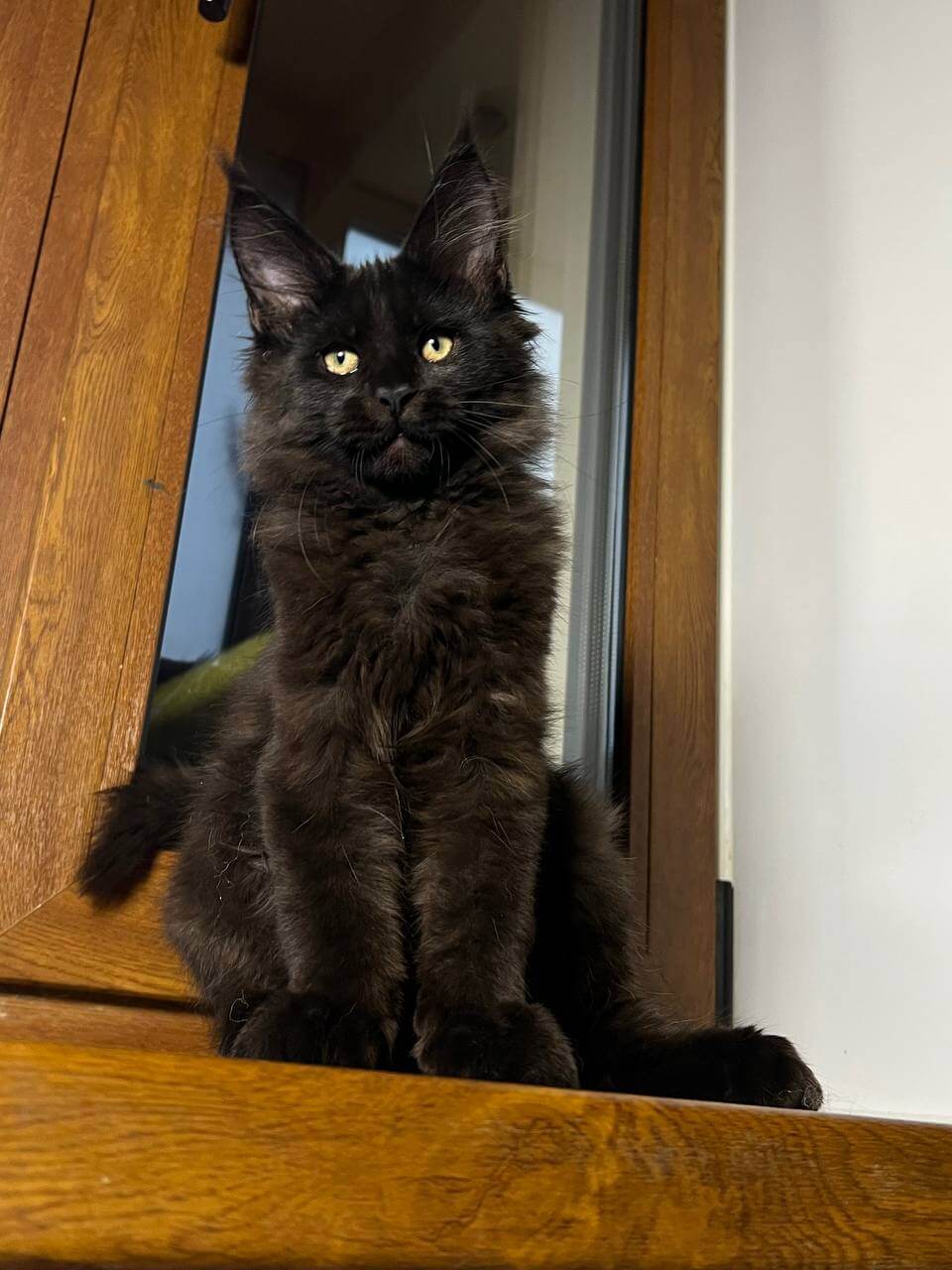 Meet Attila—a regal Maine Coon boy whose glossy black coat and bright yellow eyes will capture your heart at first glance. From his gentle nose nudges to the soothing warmth of his purrs, Attila’s loving, playful spirit radiates in every moment. He’s a true gentle giant: confident, delightfully affectionate, and always ready for a cozy cuddle on your lap.