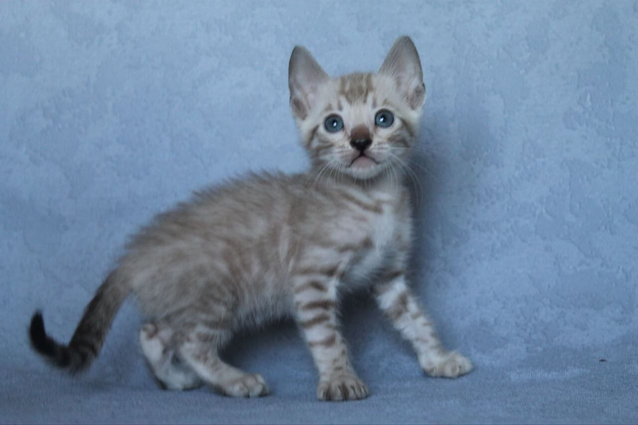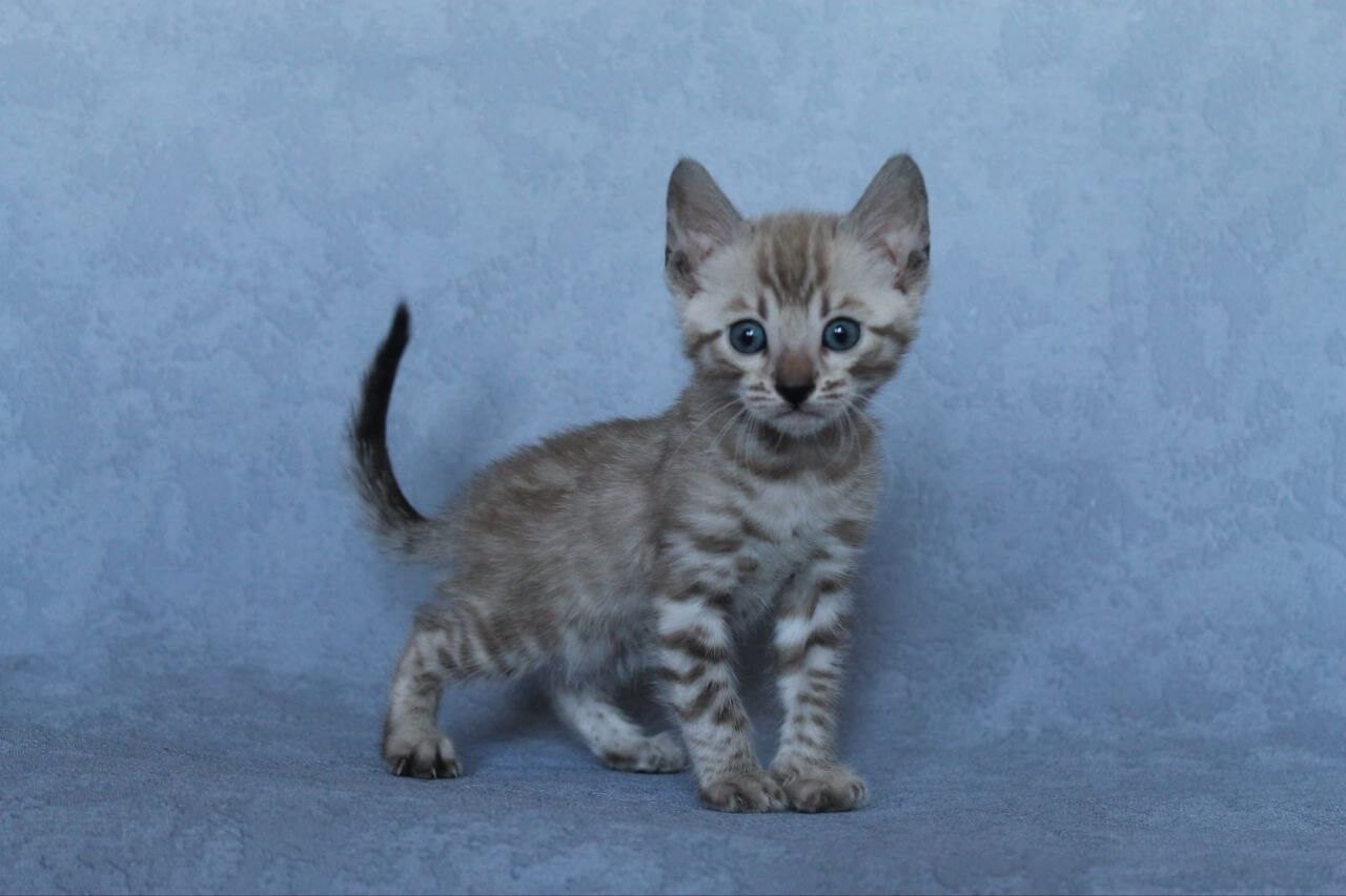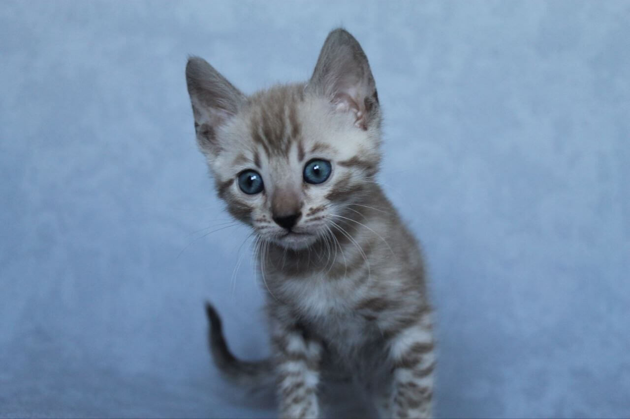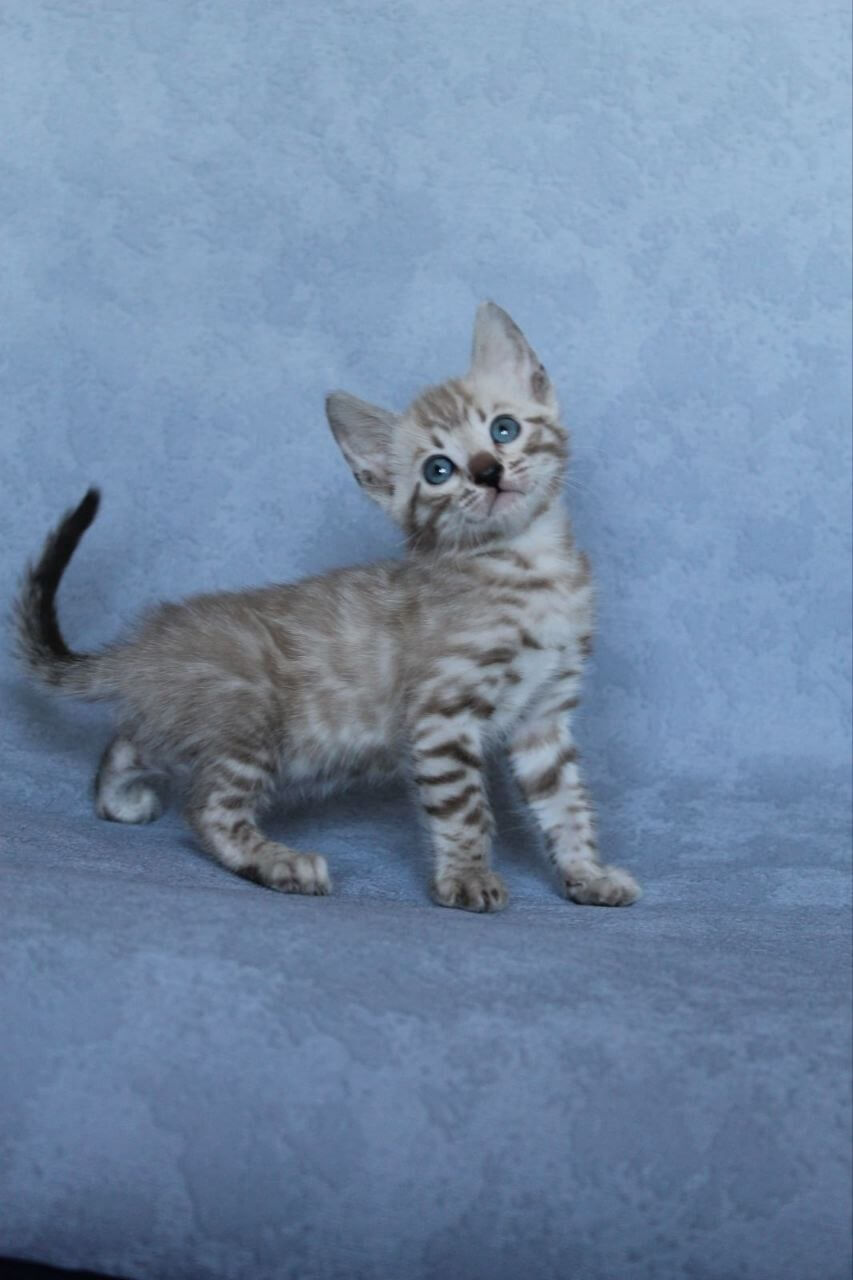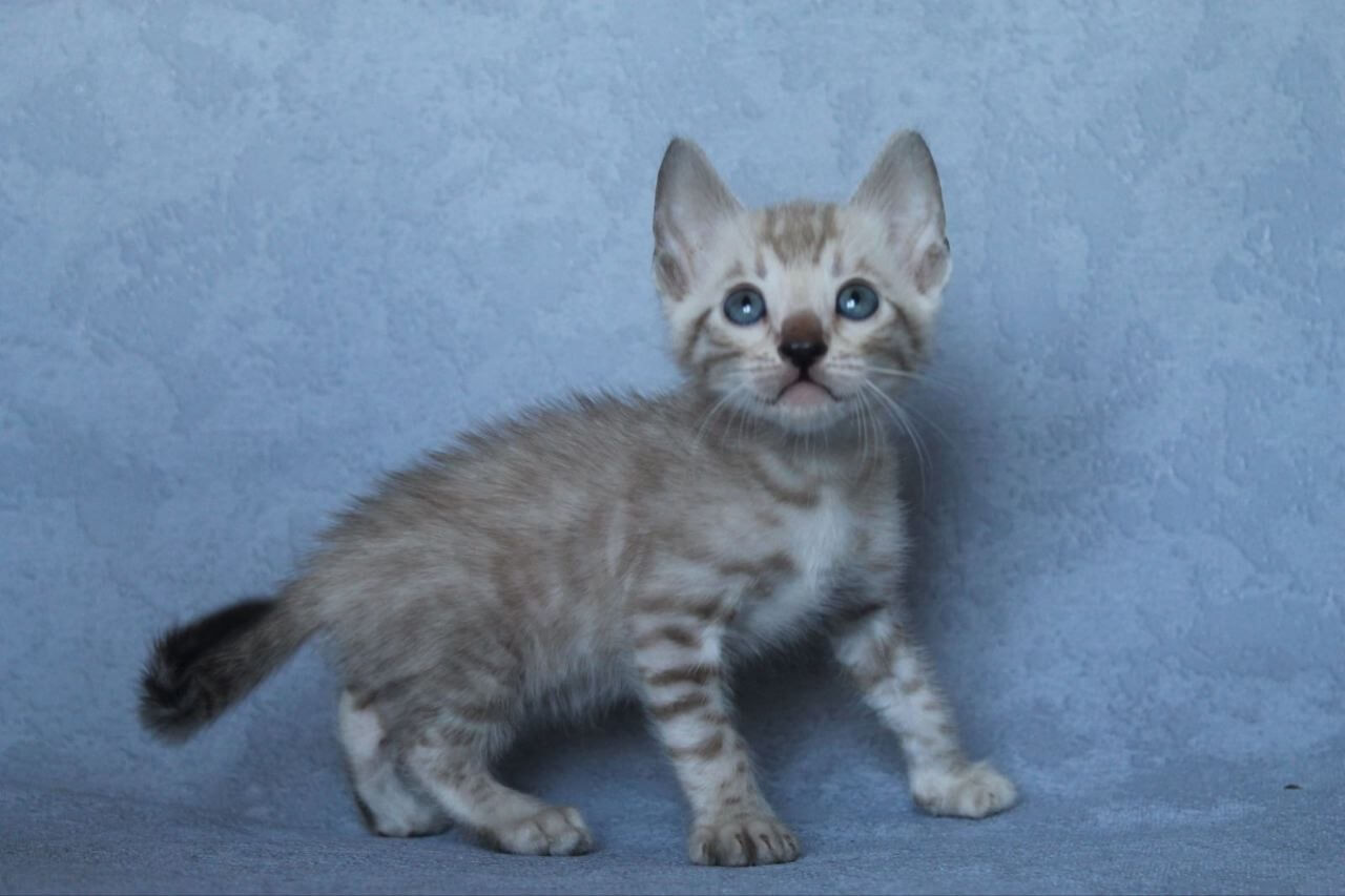 Axel’s Black Spotted Mink coat is velvet-soft, each spot a unique brushstroke over a glossy background that feels like warm suede under your hands. His blue eyes glow with an almost liquid depth, meeting yours with a curious, soul-searching gaze. When Axel curls into your arms, his purrs vibrate gently through your chest—a subtle heartbeat you can’t help but feel.