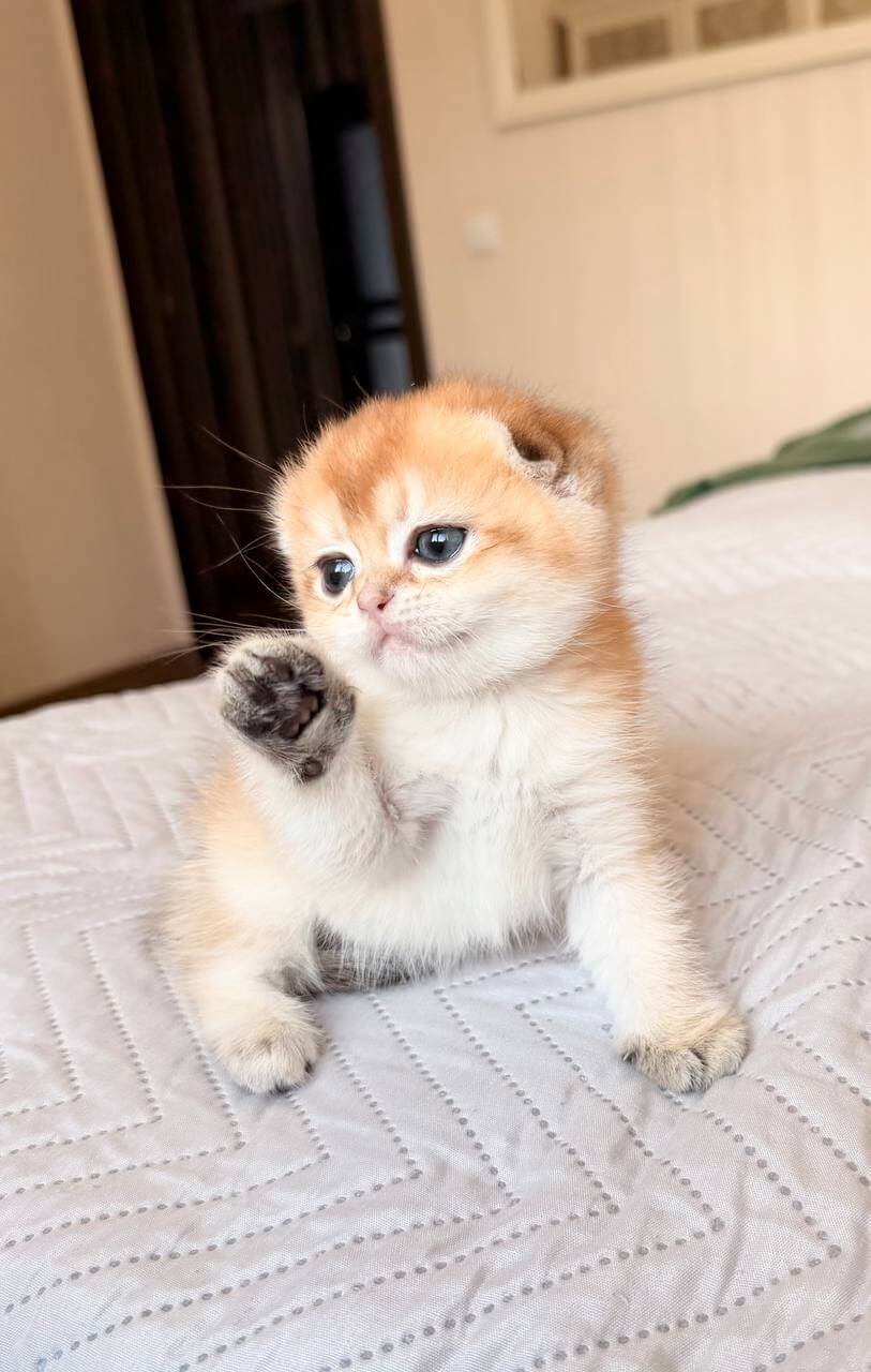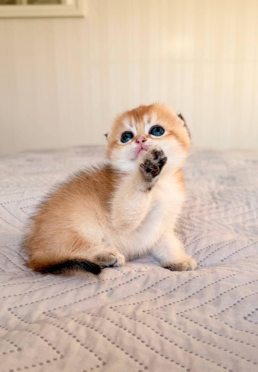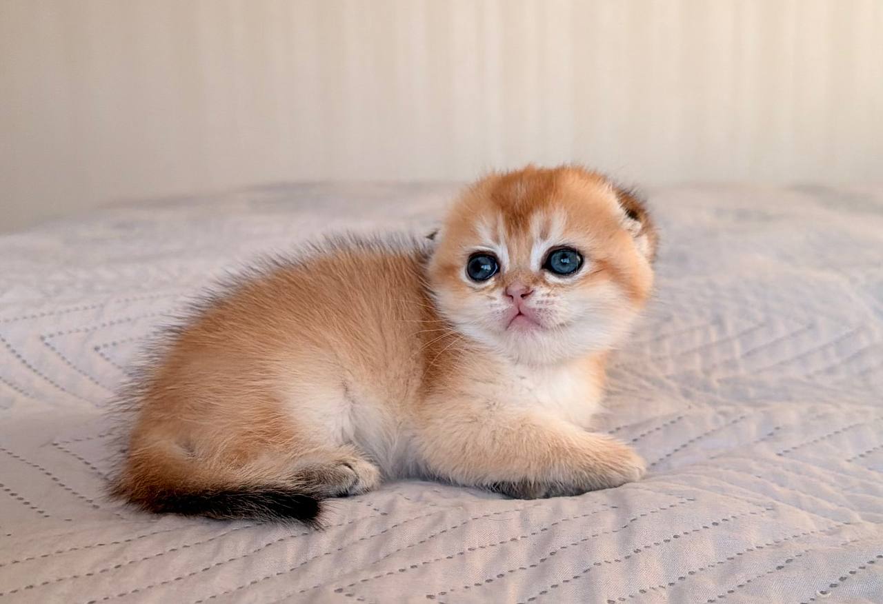 Barbara is a Black Golden Shaded Scottish Fold kitten whose soft, plush fur shimmers with delicate gold and smoky charcoal hues. When you gather her in your arms, you’ll notice the gentle weight of her petite frame and the exquisite contrast of her emerald green eyes, vivid and endlessly curious. She’s a companion you can truly hold close.