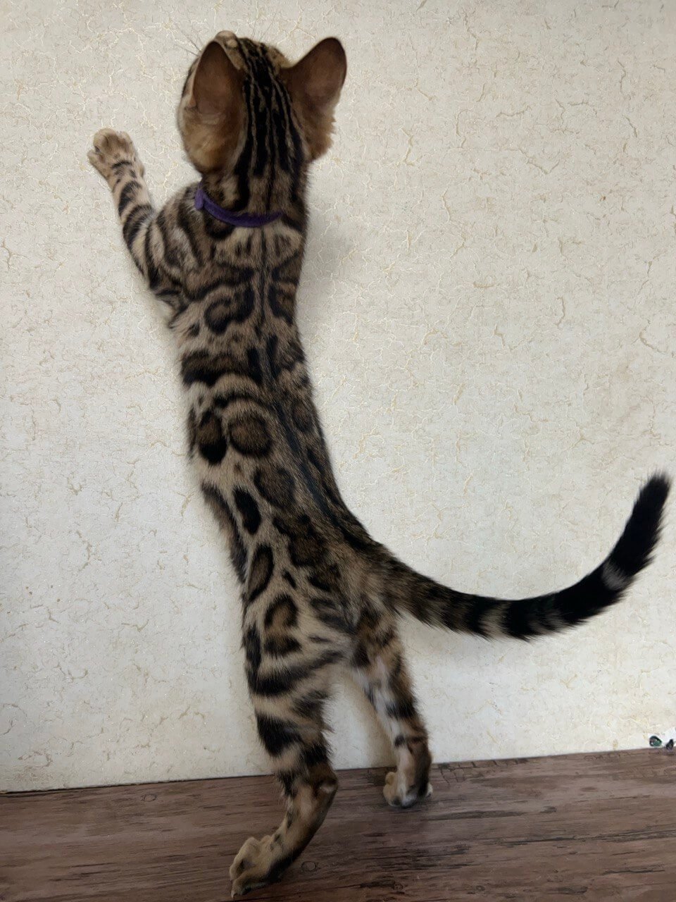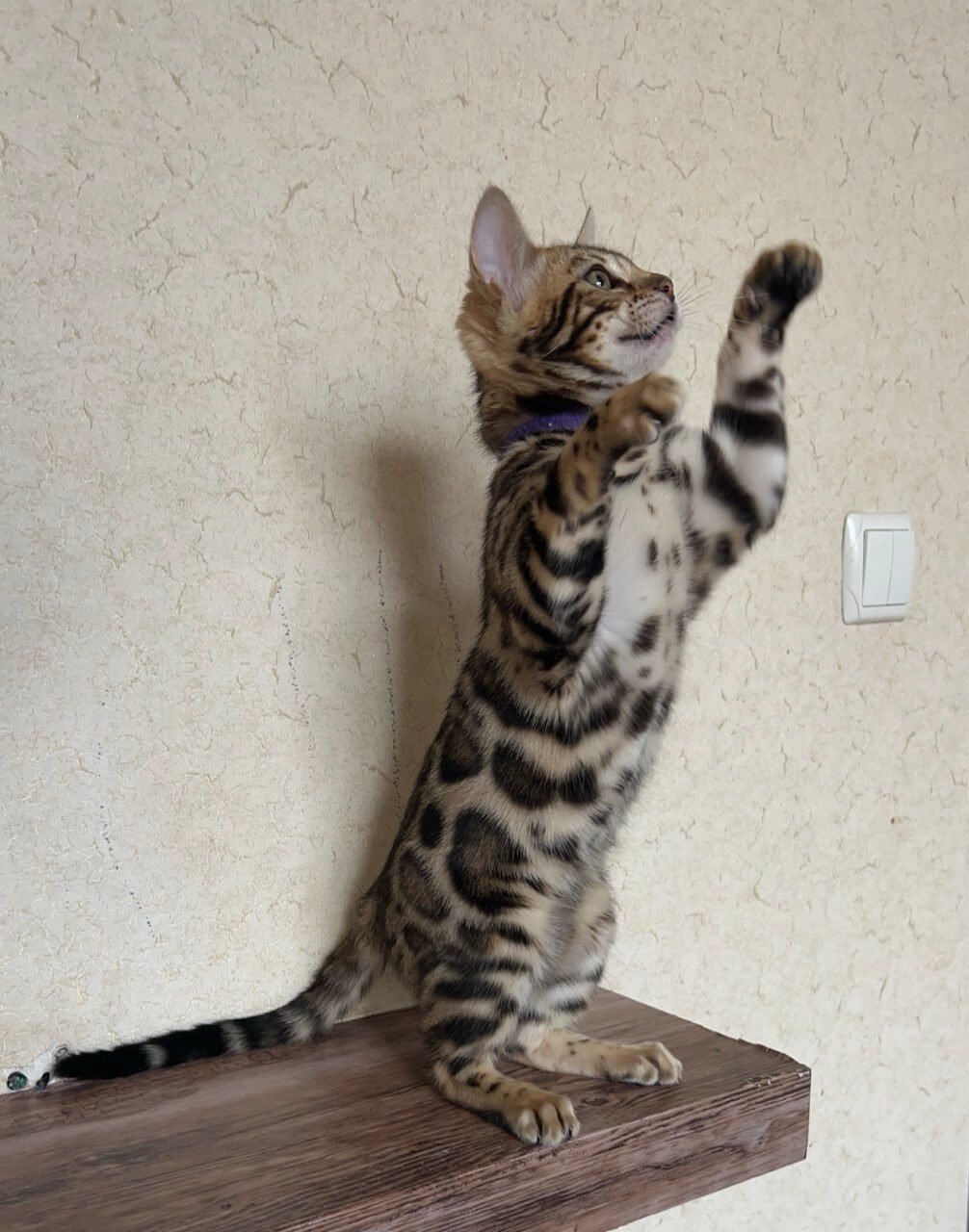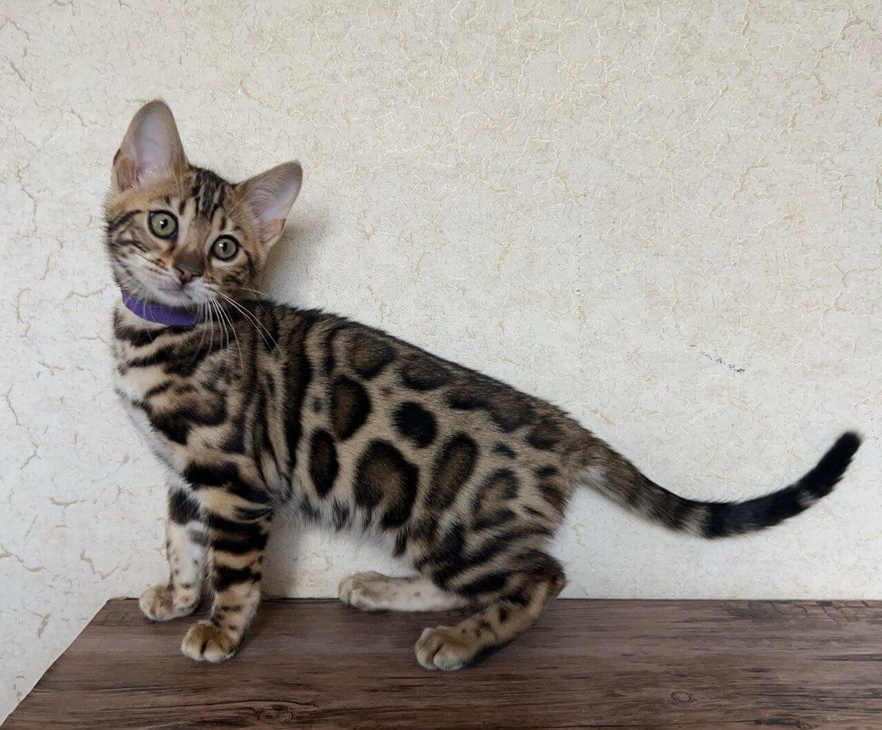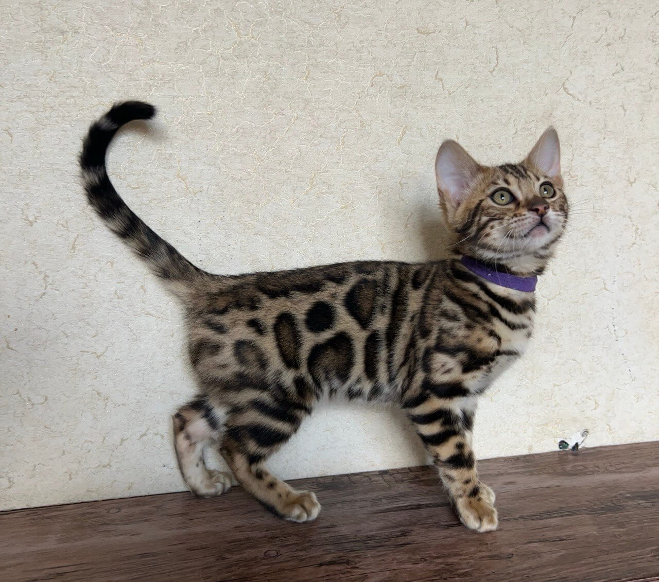 Barni is not only stunning—she’s the very definition of grace, curiosity, and affection. She loves gentle head rubs and will win you over with her sweet, social temperament and charming kitten antics. Her show-quality background shines through in every stride.