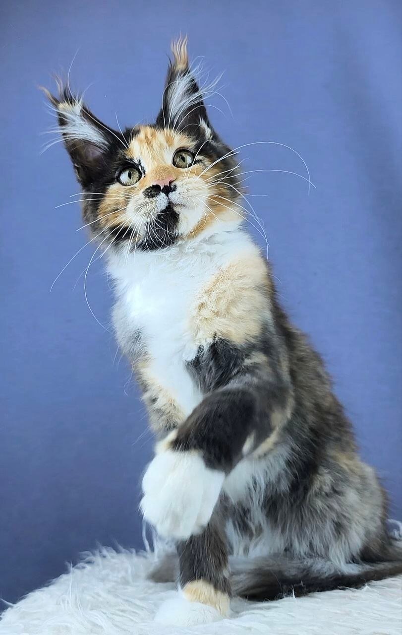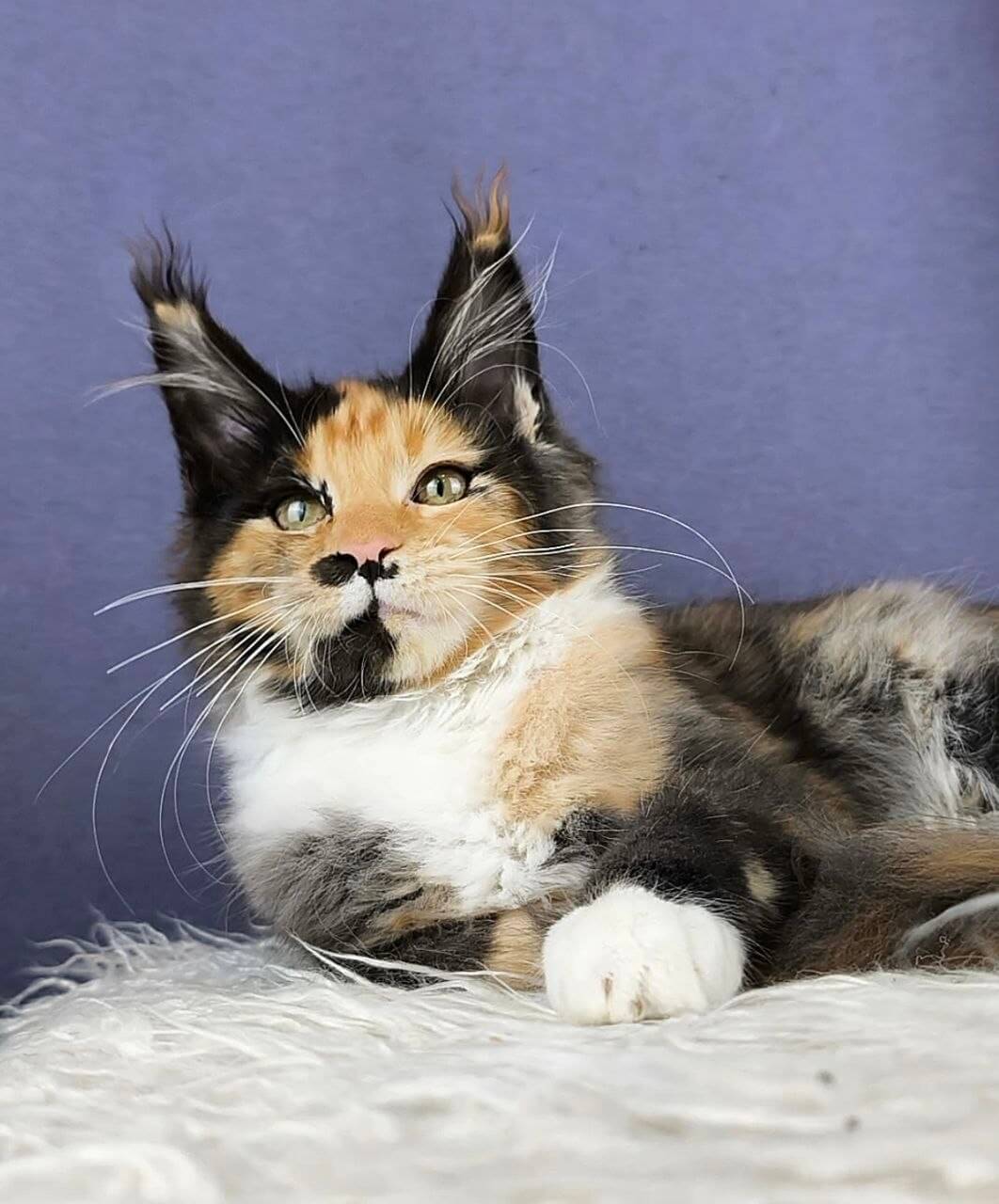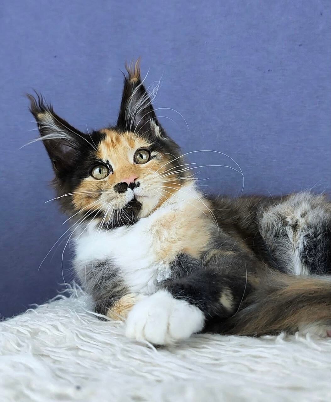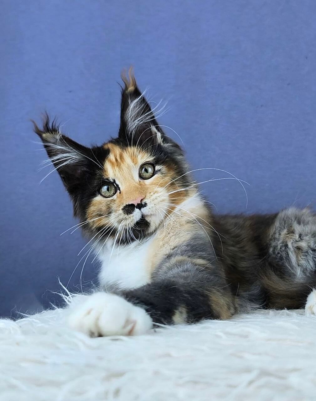 Imagine sinking your hands into Bayba’s sumptuous Black Tortie With White Maine Coon kitten coat: a tapestry of silk and plush punctuated by snowy tufts atop velvet paws. Her yellow eyes hold a luminous, molten amber you feel before you see, following your every move with wise curiosity. Nestled in your lap, she radiates gentle warmth.