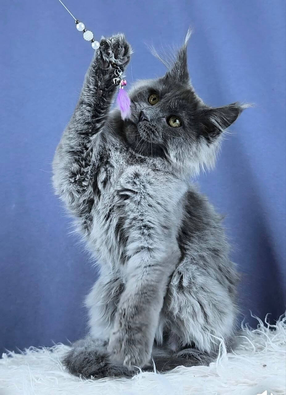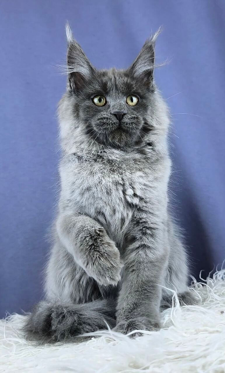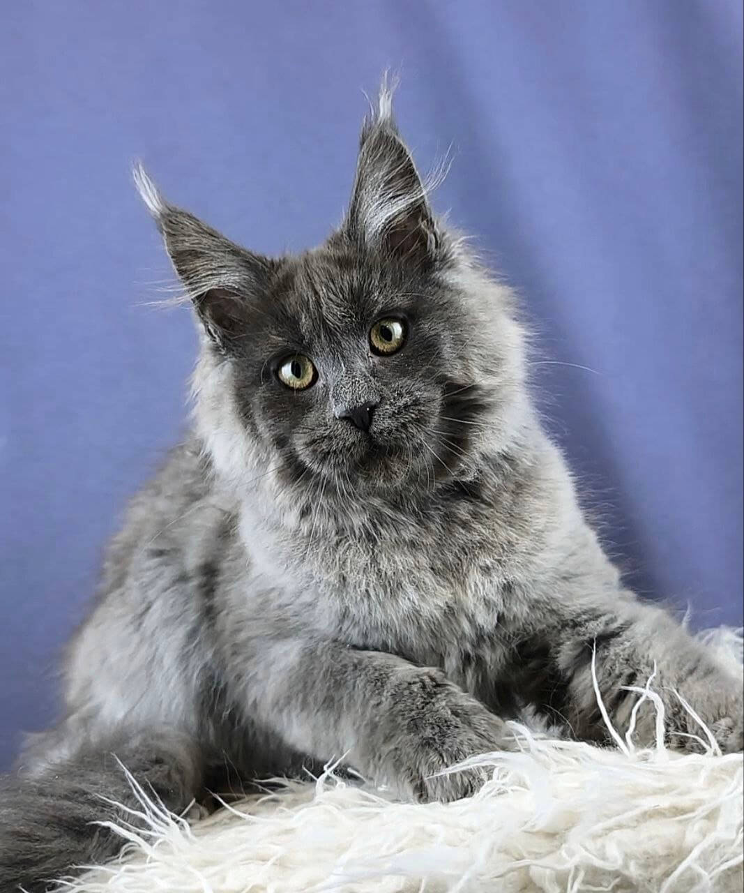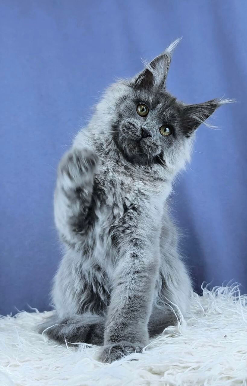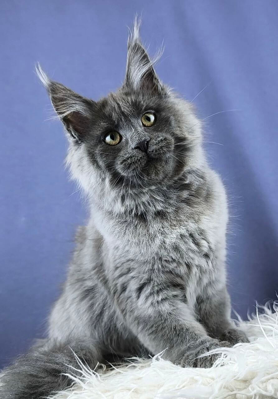 Bell, our irresistible Blue Maine Coon kitten, is pure poetry in fur. When you scoop her up, her silvery-blue coat is luscious and full, feather-soft beneath your fingers. Her yellow eyes shine with curiosity, giving you a golden, knowing gaze that feels like a gentle hug. Holding Bell, you’re enveloped in warmth and velvet.