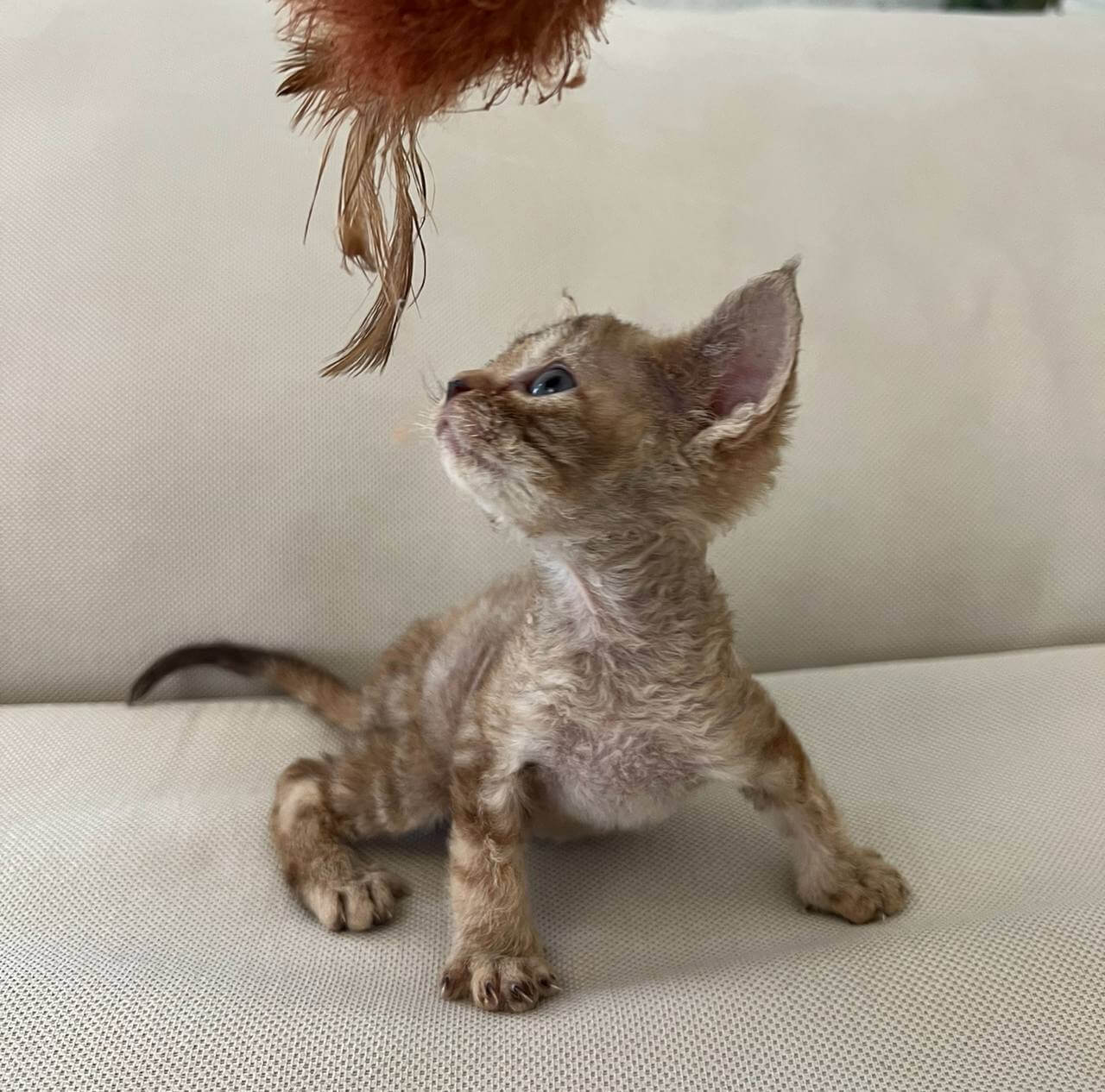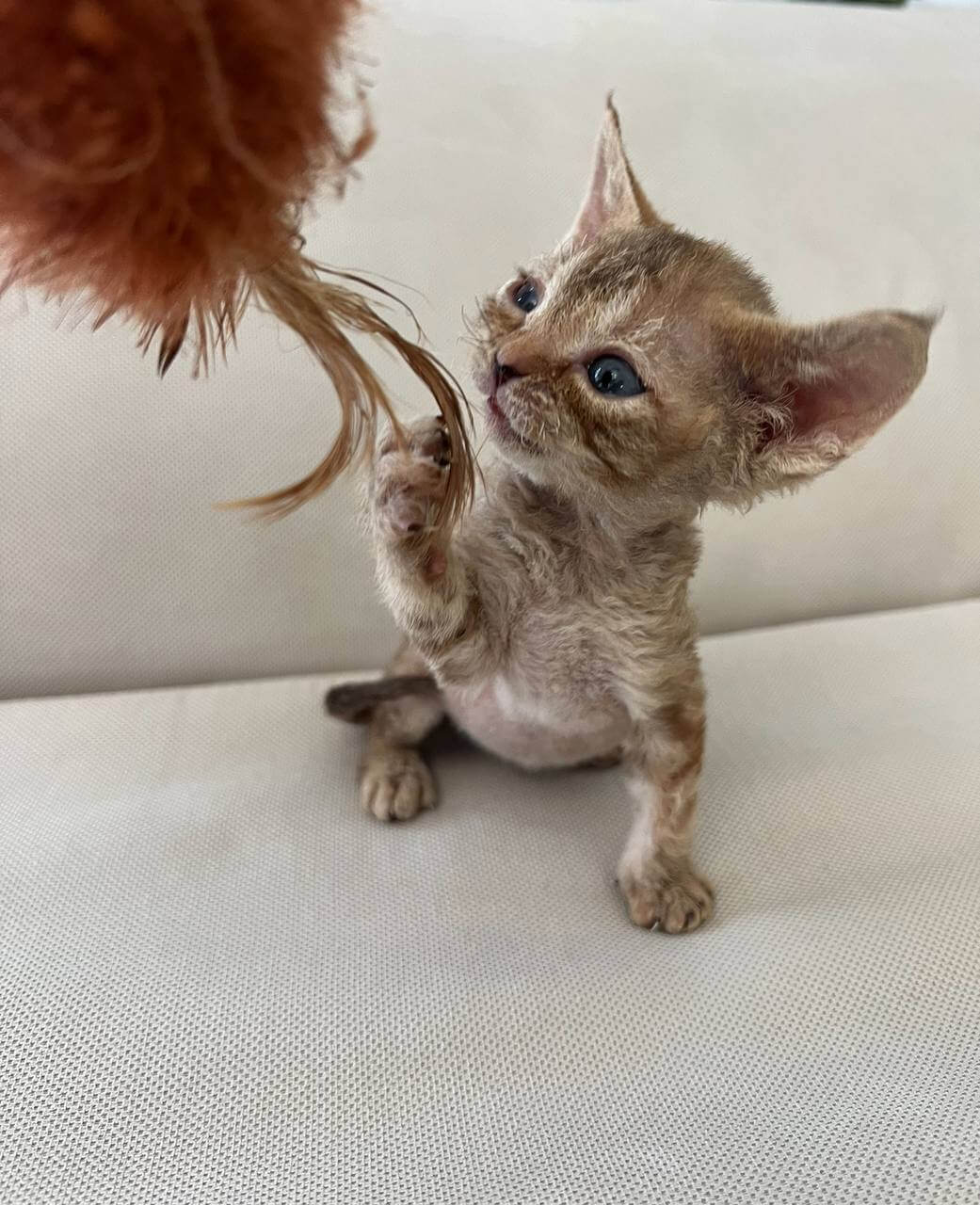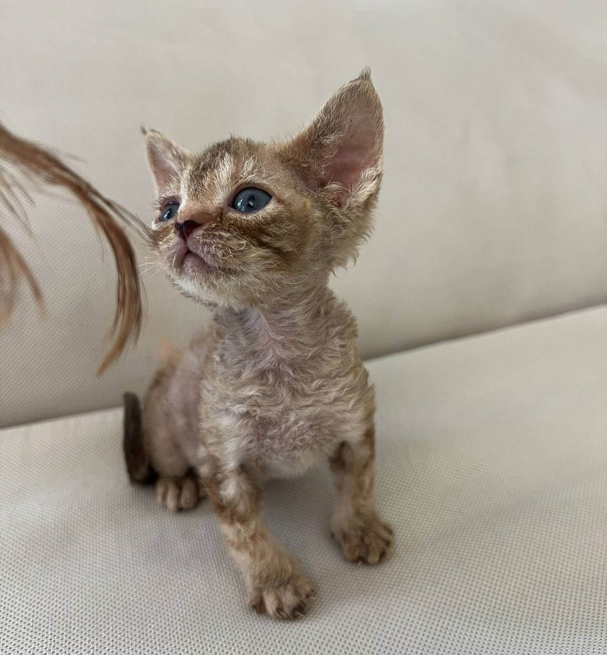 With her downy-soft waves and signature whisker pads, Bianka is a Chocolate Tortie Devon Rex kitten whose tactile charm delights the senses. Gaze into her clear yellow eyes and you’ll find sparks of sunlight. The warmth of her delicate, rippled coat begs to be nestled, her gentle weight perfectly fitting the curve of your arms.