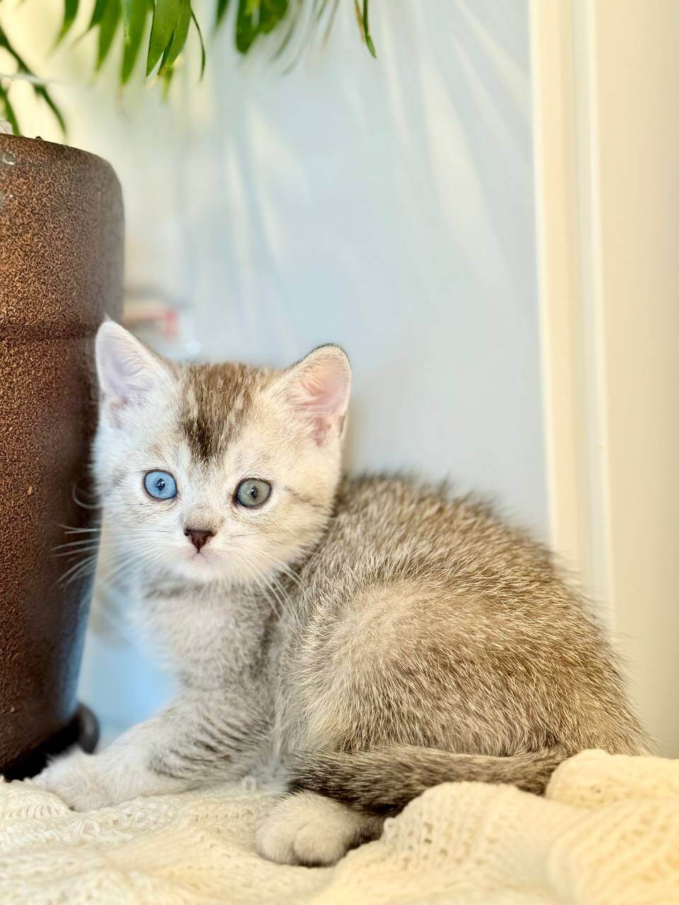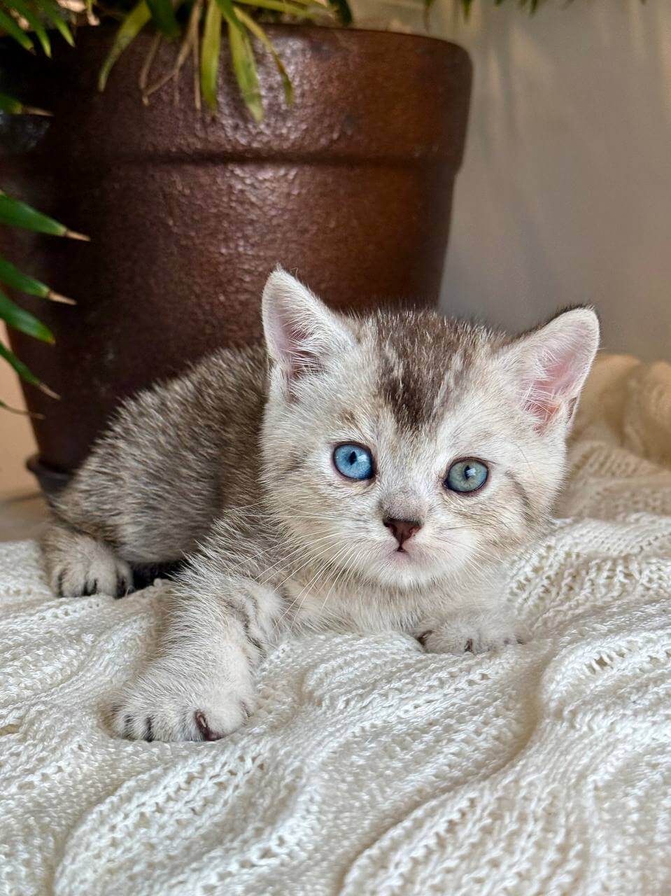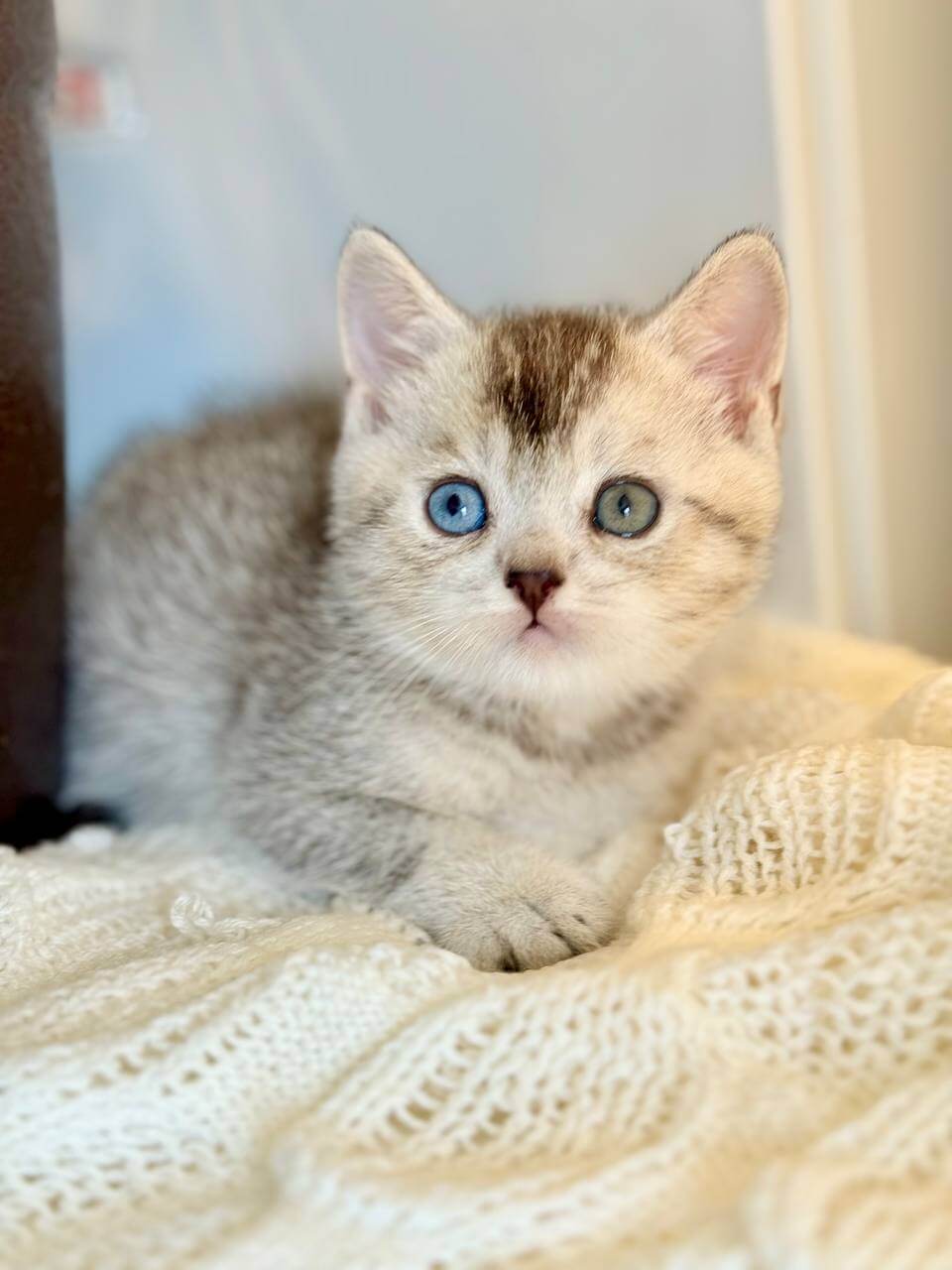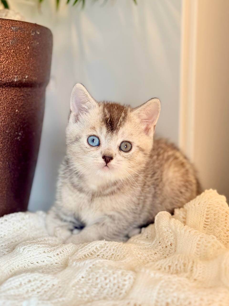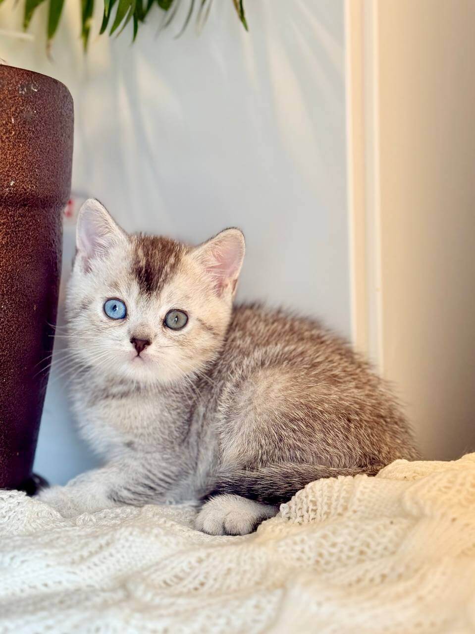 Meet Bonik, a charming male British Shorthair kitten, known for his striking black silver tabby ticked coat and unique odd-eyed appearance. Born on August 22, 2025, Bonik comes from champion bloodlines, ensuring his show-quality status. This delightful kitten will be ready to join your family after December 22, 2025, and he can be reserved now for pick-up in Wood Dale, USA, or delivered from Chicago to other states.