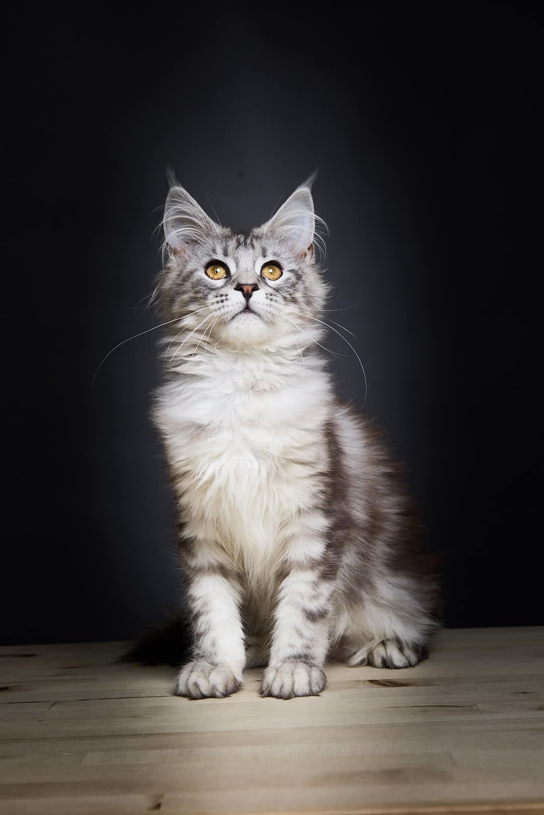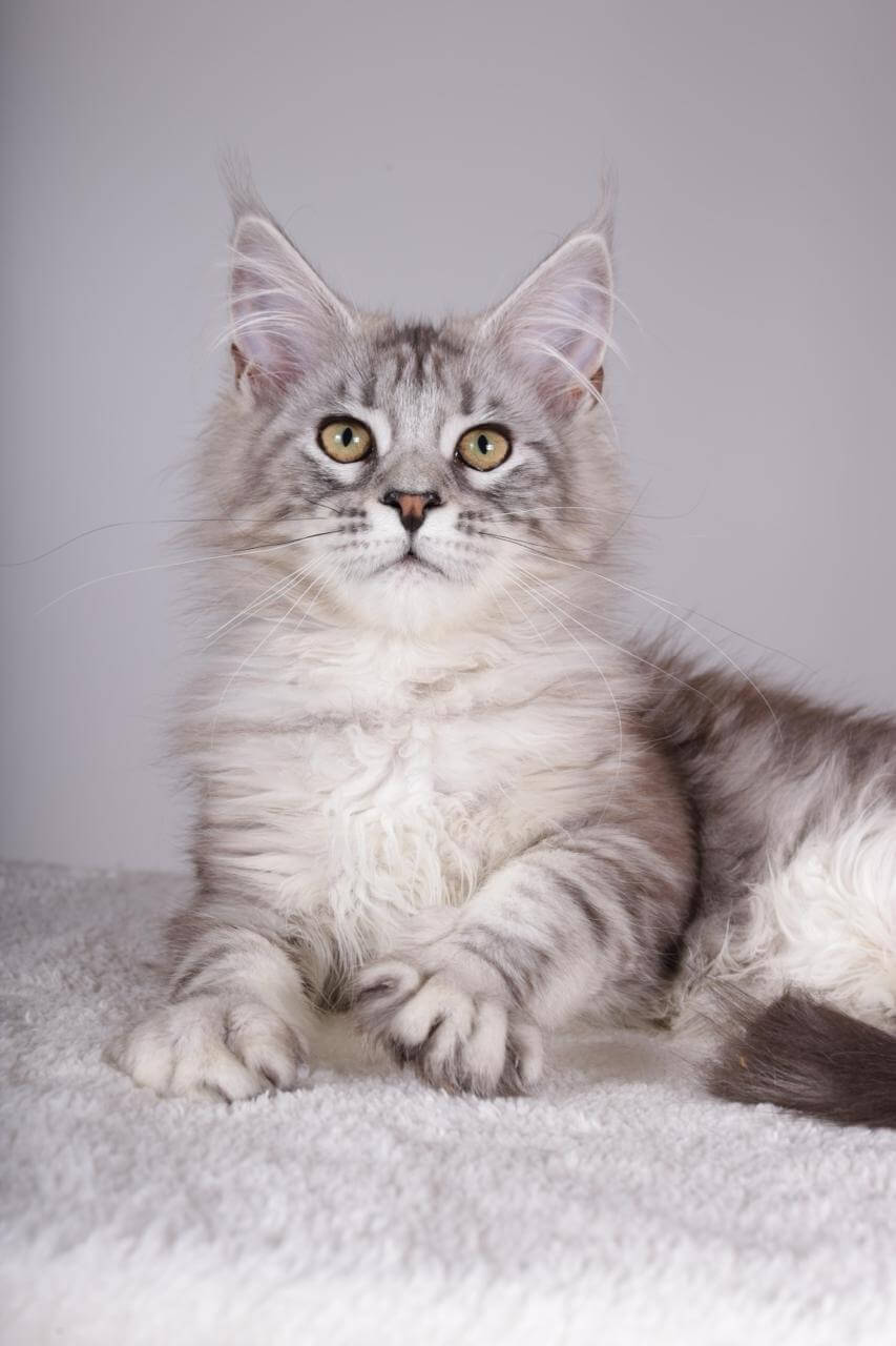 Meet Bonny—a breathtaking black silver tabby Maine Coon kitten who’s already stealing hearts with her silken coat and soulful yellow eyes. Born on 6/21/2025 and ready to fill your home with gentle purrs and playful energy this autumn, Bonny embodies everything magical about her breed: affectionate, intelligent, and endlessly curious.
