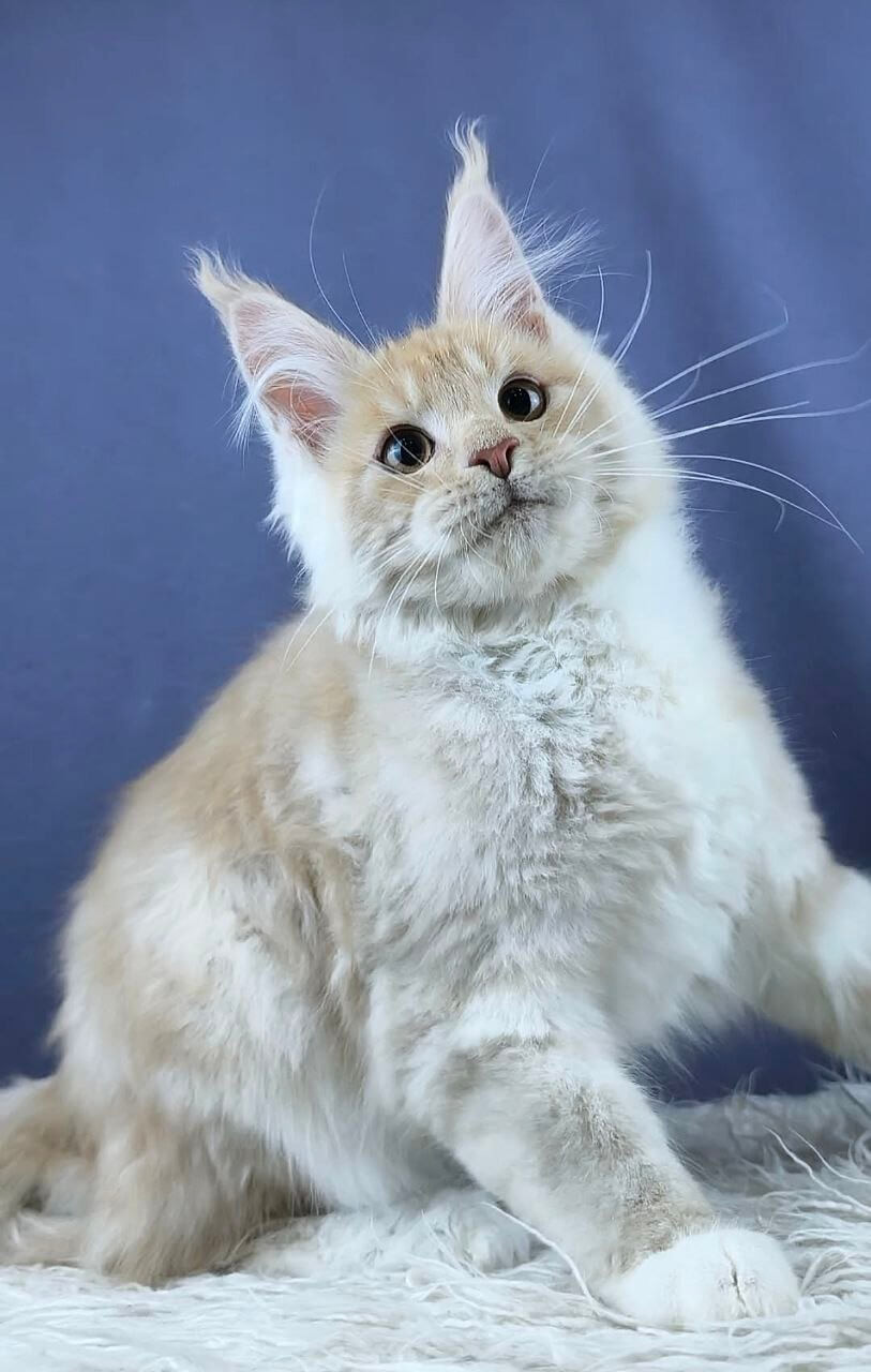 Meet Bublik, a breathtaking Red Silver Maine Coon kitten whose soft, cloud-like coat cascades in silvery waves tipped with warm russet. His yellow eyes gleam with gentle curiosity, catching sunlight like little embers as he gazes up at you. Cradled in your arms, his plush fur and sturdy, comforting weight create an instant sense of calm connection.