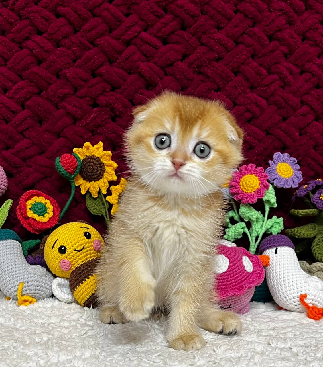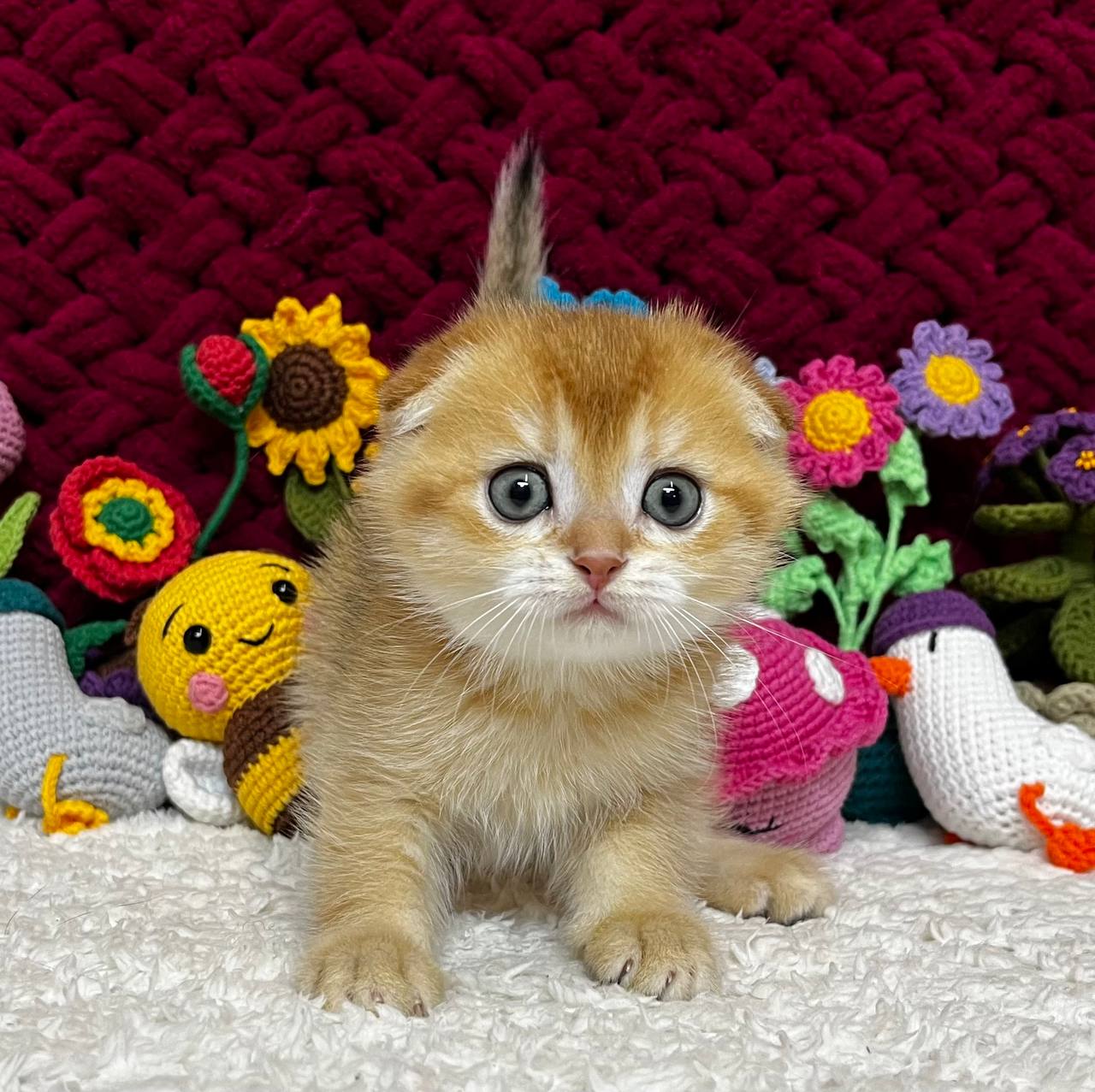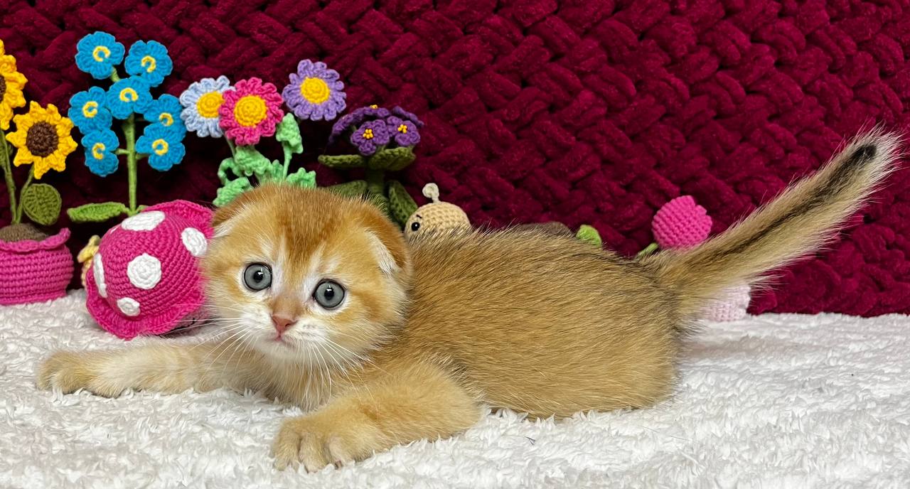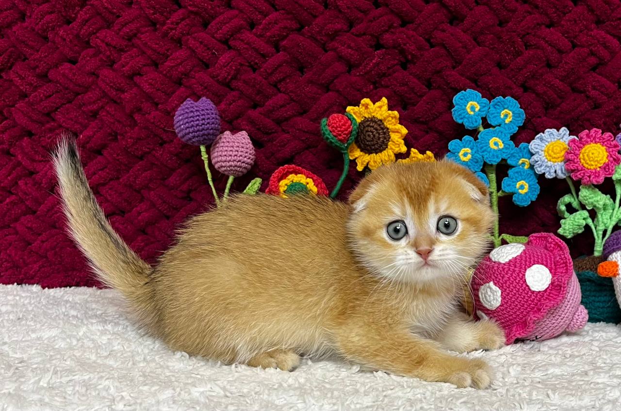 Buffy is a true charmer—playful, affectionate, and calm, she loves gentle strokes, cozy lap time, and quiet moments by your side. Her round, folded ears and soft velvet fur give her an irresistibly huggable look, while her champion bloodlines shine through in her graceful, show-quality features.