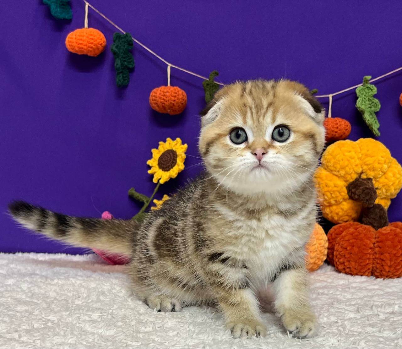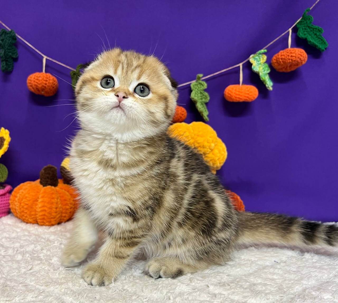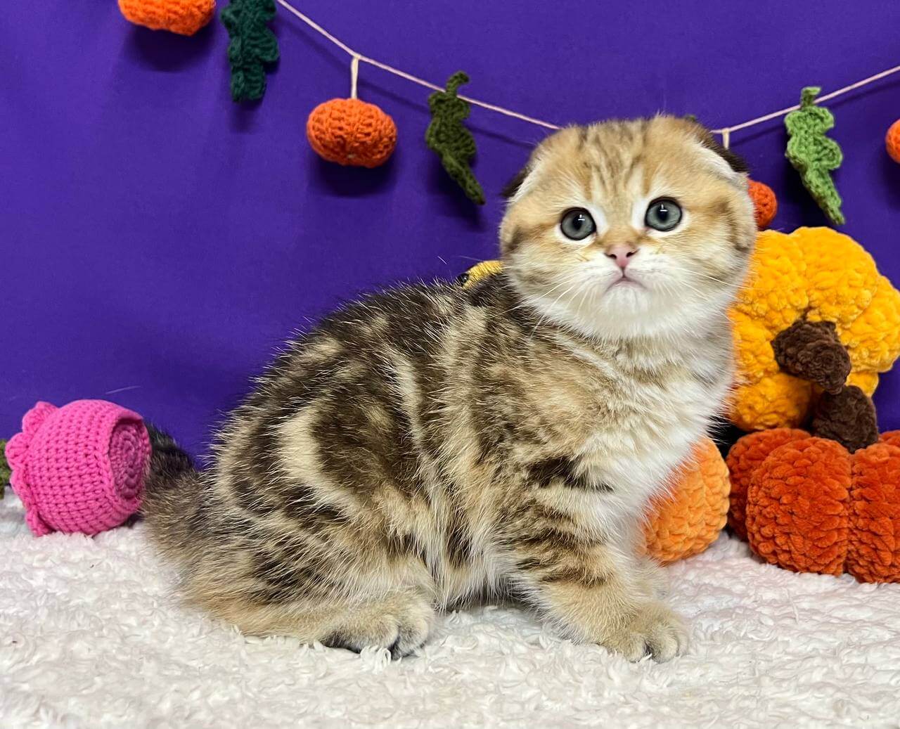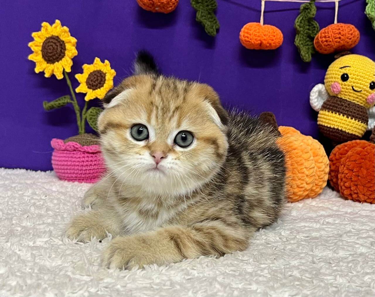 Meet Cher, our enchanting Scottish Fold princess, here to melt your heart from the very first purr. Wrapped in a luxurious black golden tabby coat, her plush fur shimmers softly in the light, framing dazzling green eyes that seem to whisper secrets only a kitten could know.