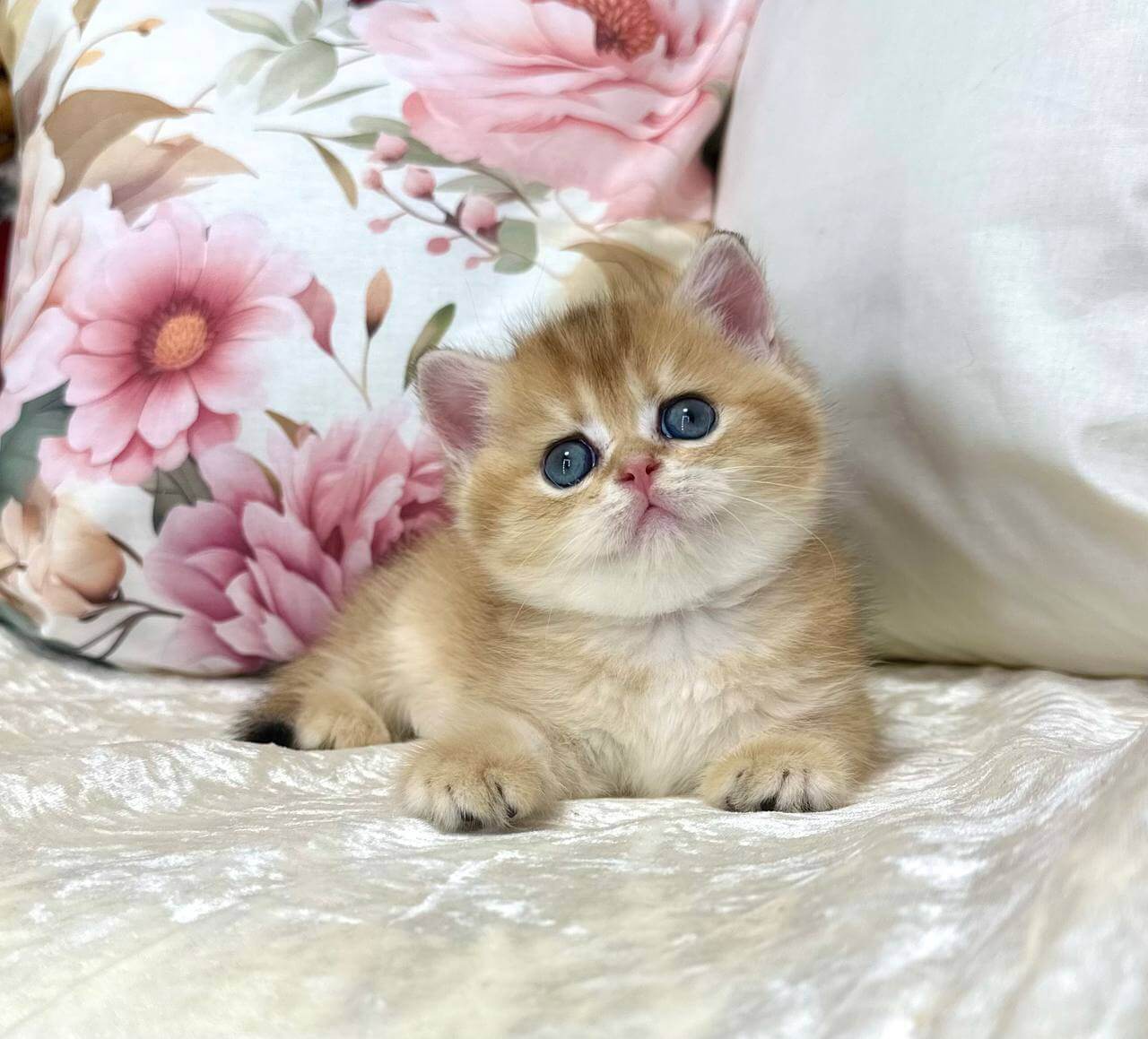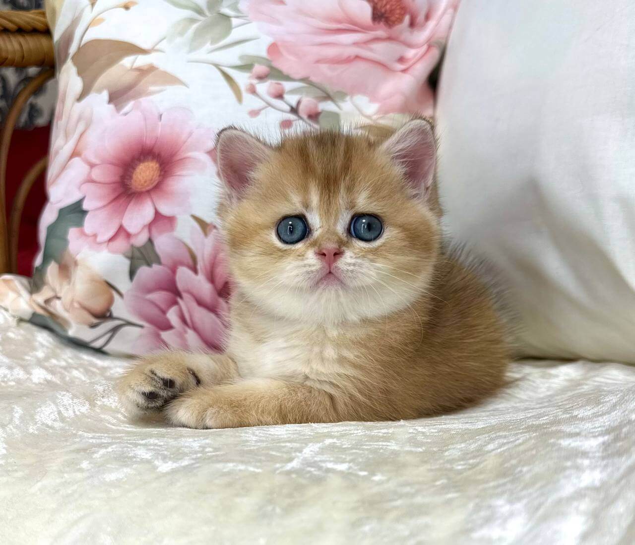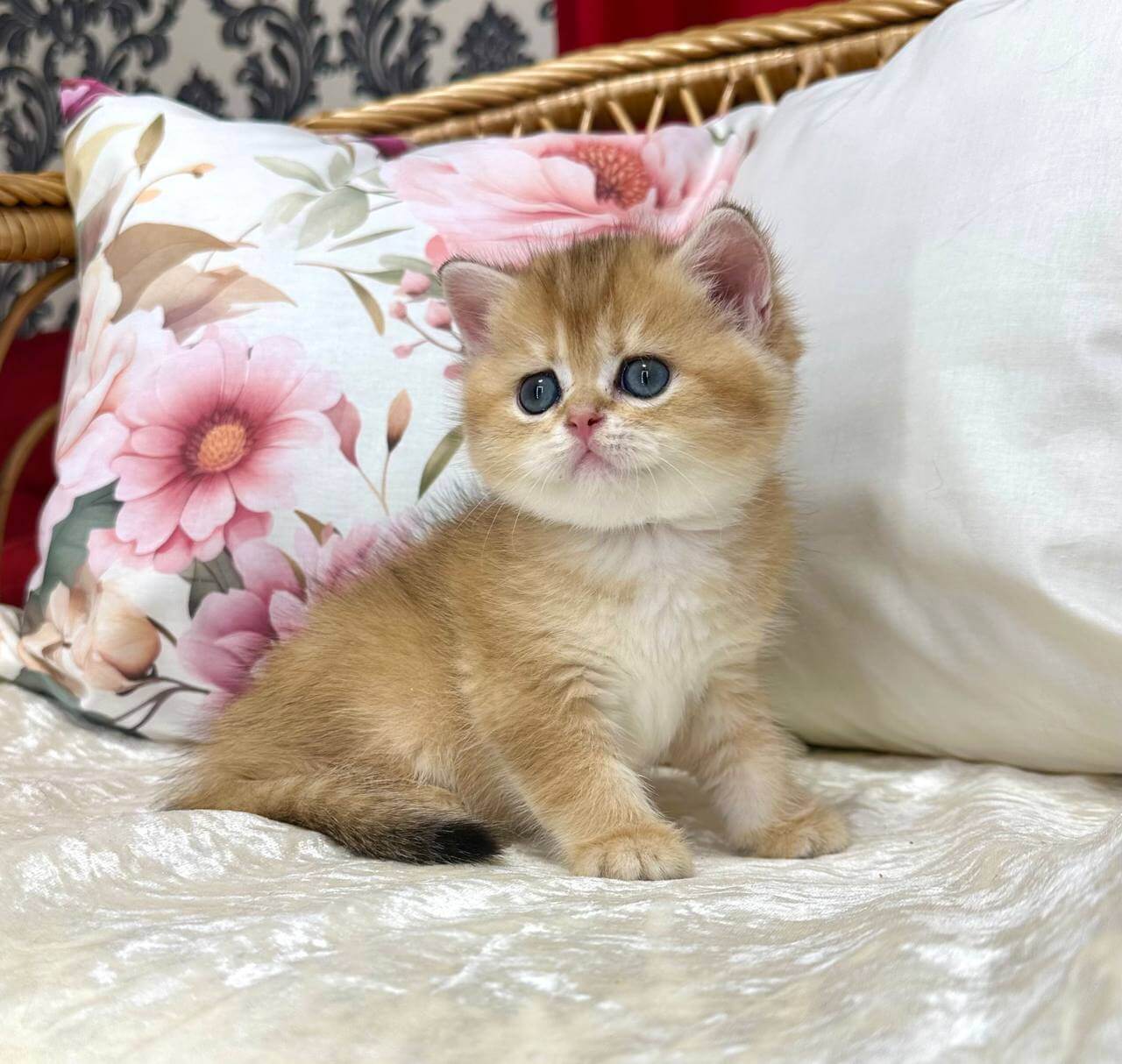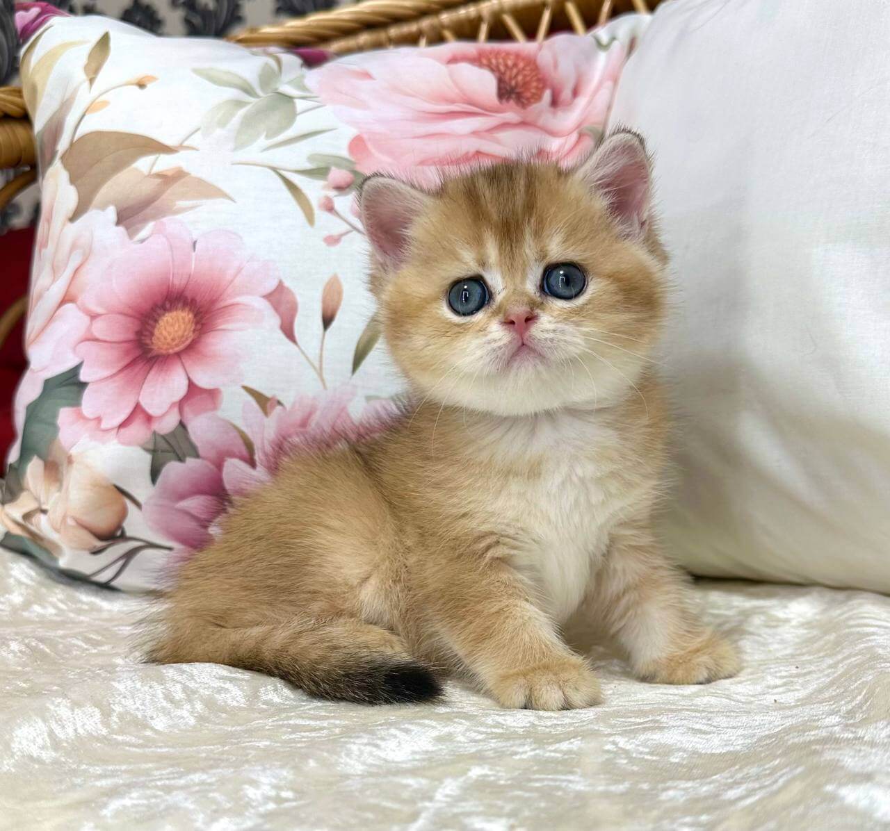 Meet Chloe, our enchanting Scottish Straight kitten, whose gentle soul is rivaled only by the emerald light of her captivating green eyes. Imagine her soft, plush black golden shaded coat glimmering in the sunlight as she curls into your arms, her delicate purrs soothing your heart like a lullaby.