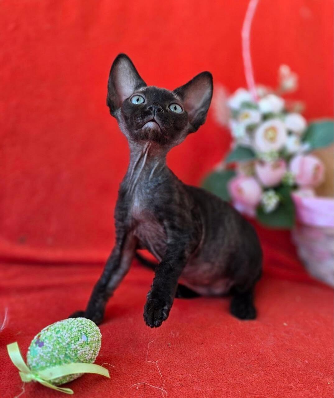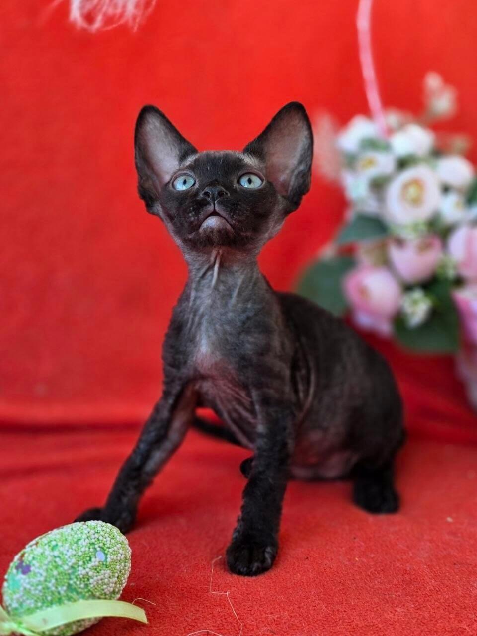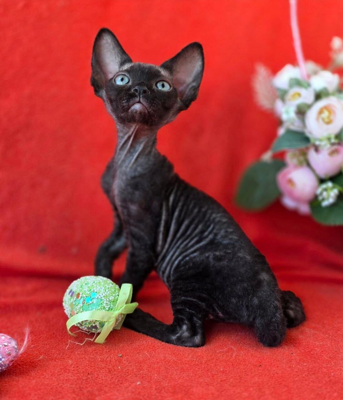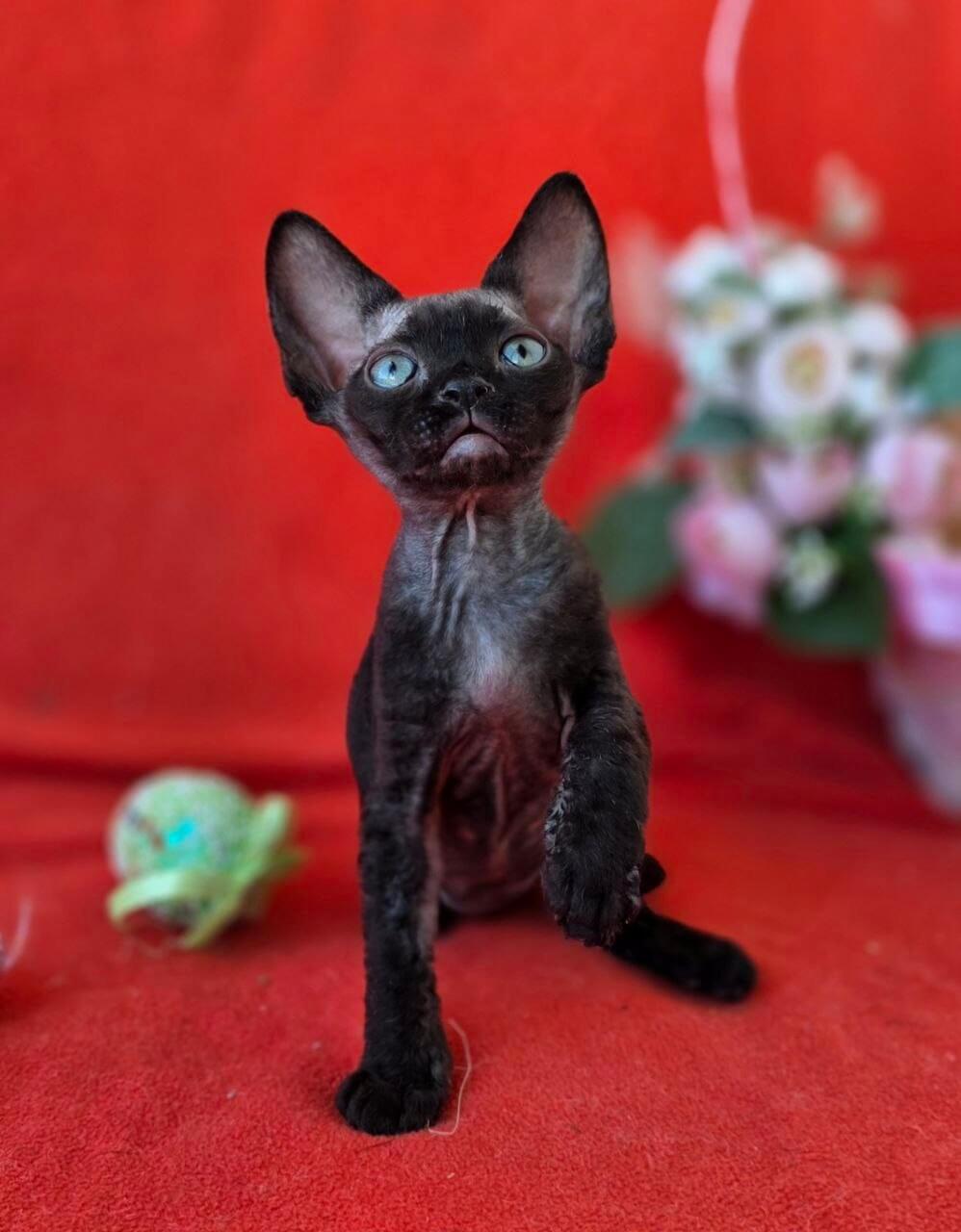 Coco is a Black Devon Rex kitten whose velvety, rippled coat feels like a warm whisper beneath your hand. Her yellow eyes glow with a gentle radiance, drawing you in, and she presses her delicate, weightless body easily into your embrace. Curling in your lap, Coco will purr softly, making the world fade away around you.