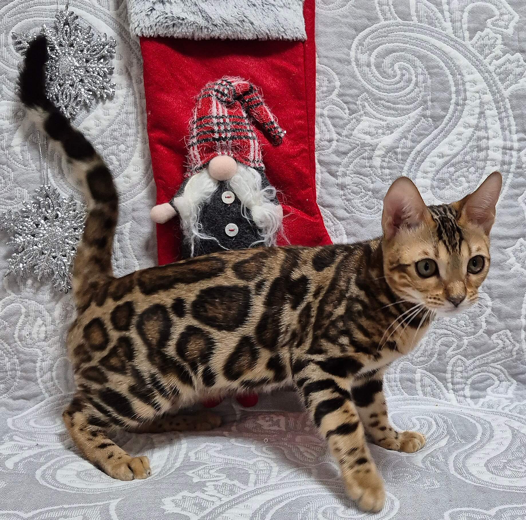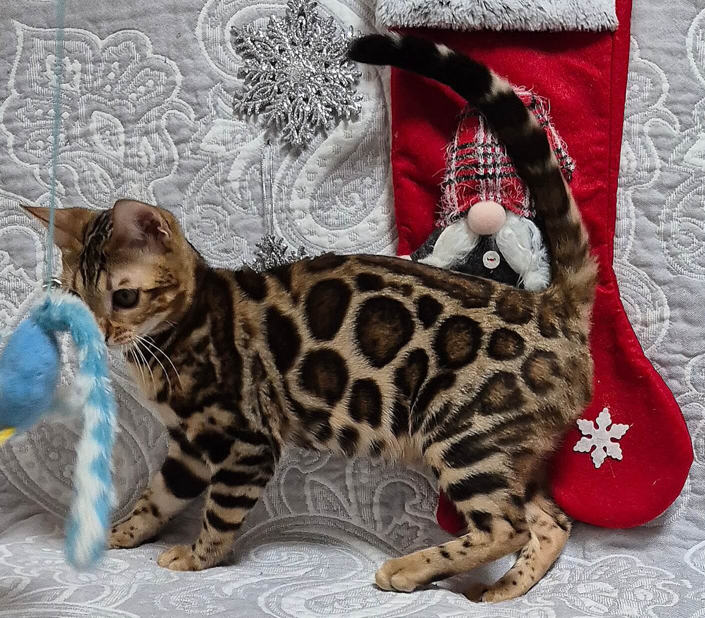 Meet Cori, an exquisite female Bengal kitten with striking black tabby spotted markings and captivating yellow eyes. Born on June 13, 2025, Cori is of show quality and boasts champion bloodlines, making her a standout choice for both companionship and show. She will be ready to leave her breeder’s care on October 13, 2025.