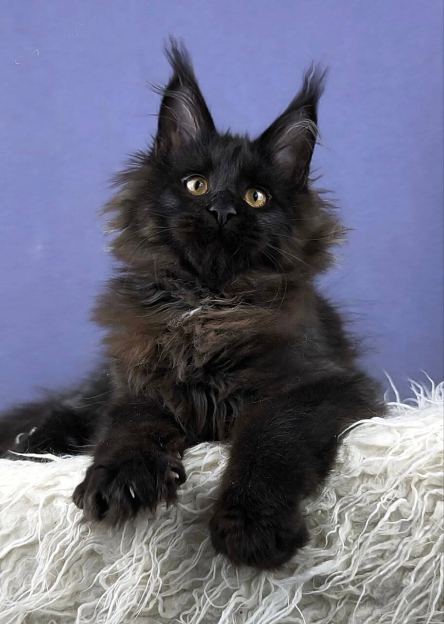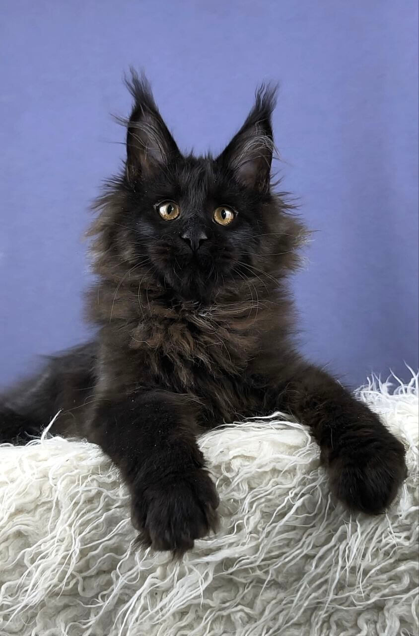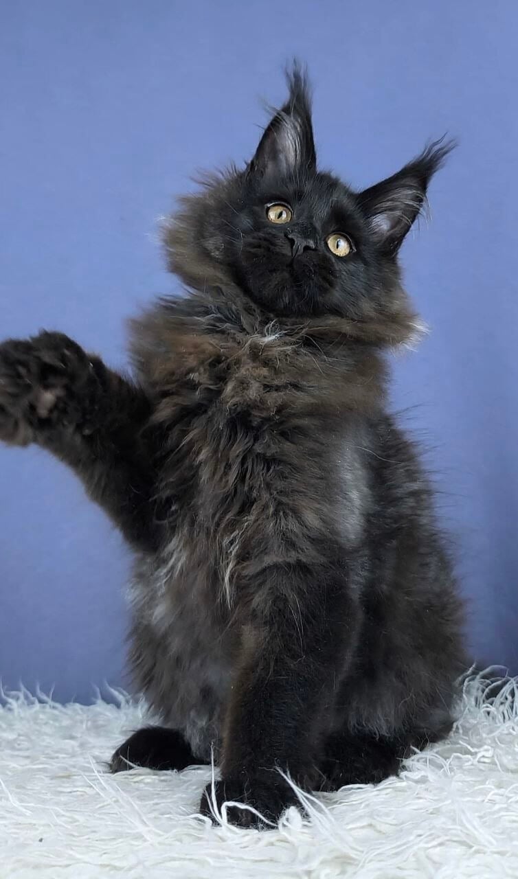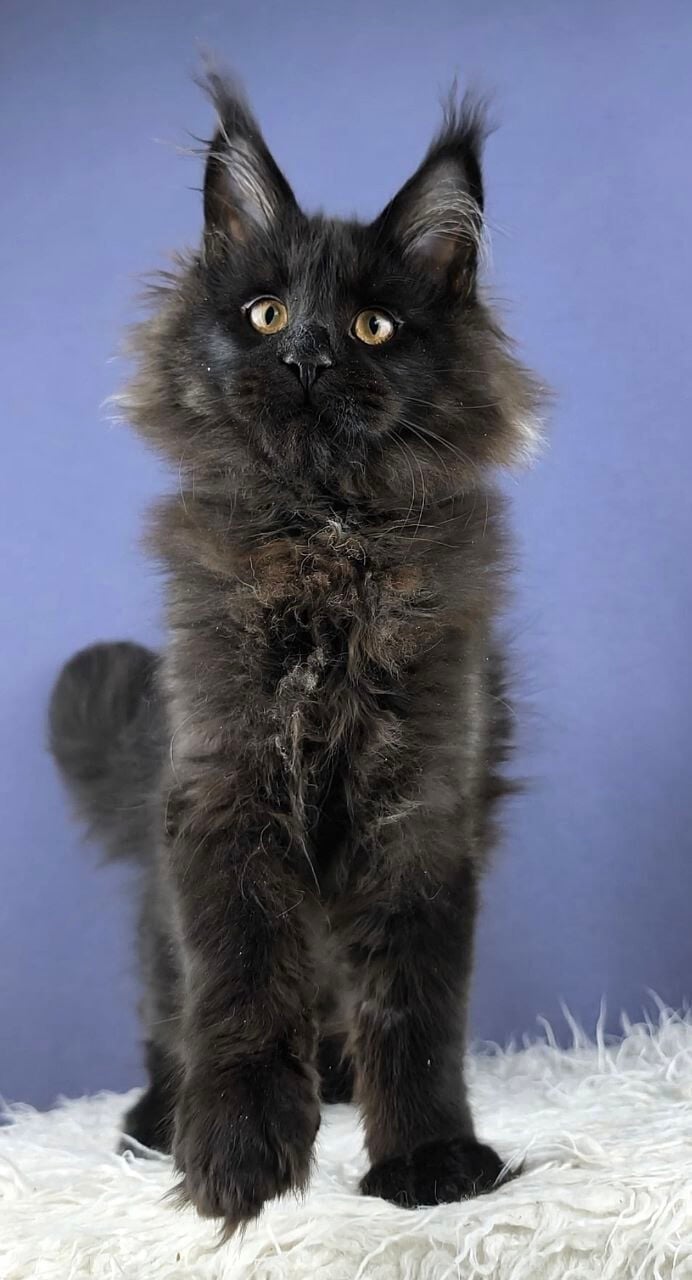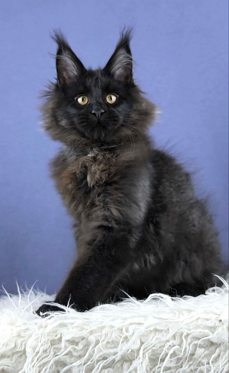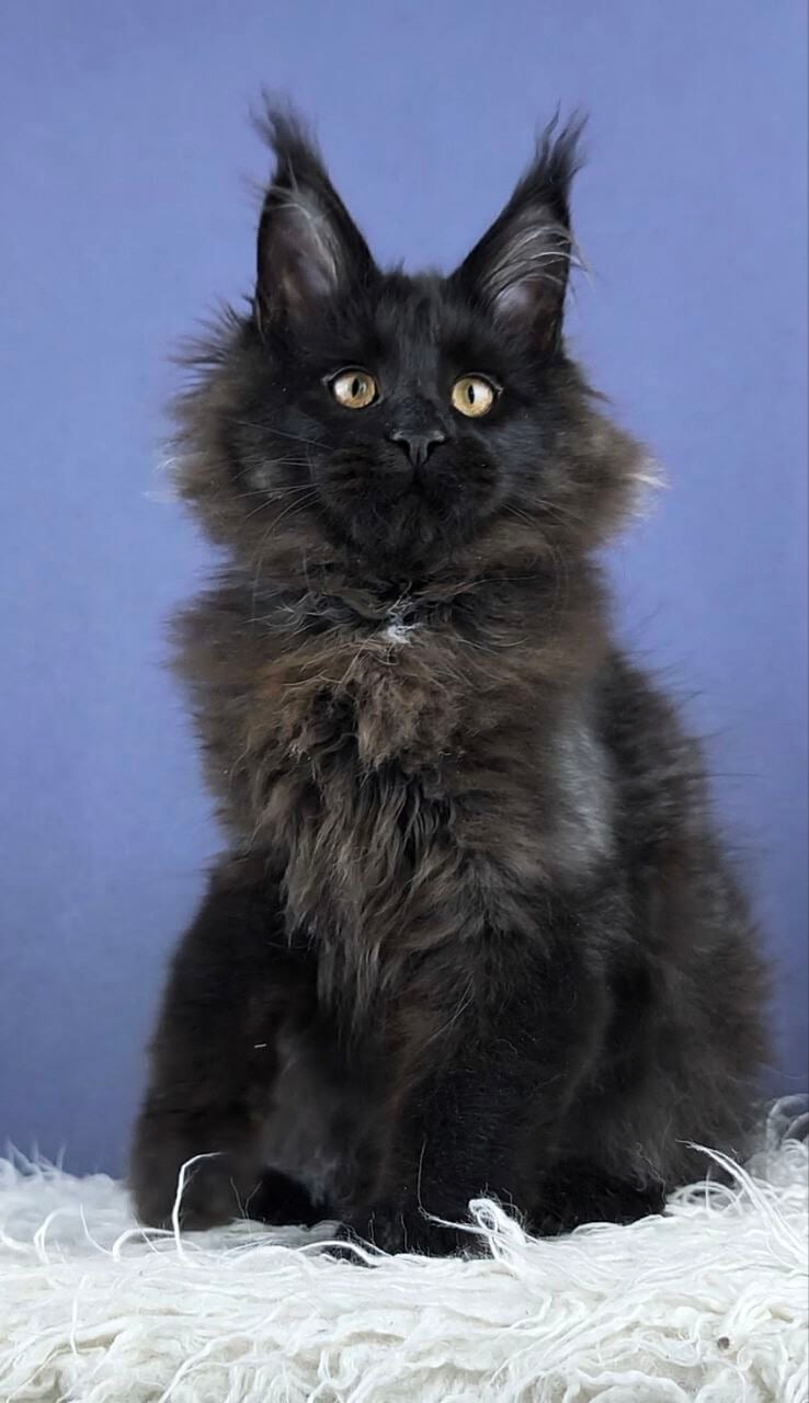 Meet Dendy, a truly extraordinary Black Maine Coon kitten whose velvety fur feels as deep as midnight under your hand. His striking yellow eyes catch the light, glowing gold as he quietly observes the world with an old soul’s wisdom. When you pick him up, Dendy’s gentle weight settles trustingly into your arms, his thick tail draping like a luxurious scarf.