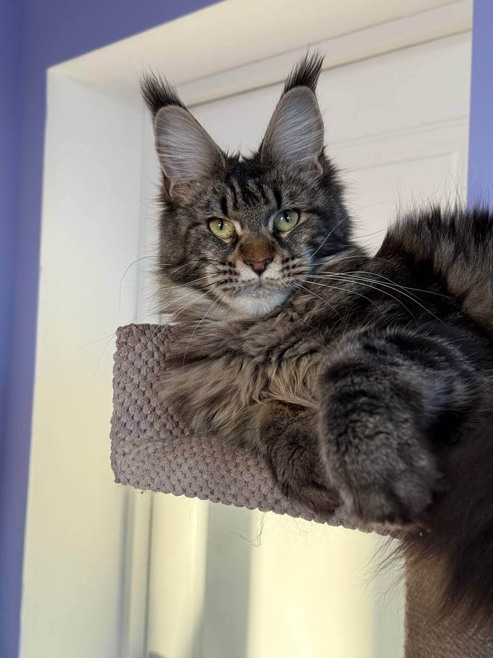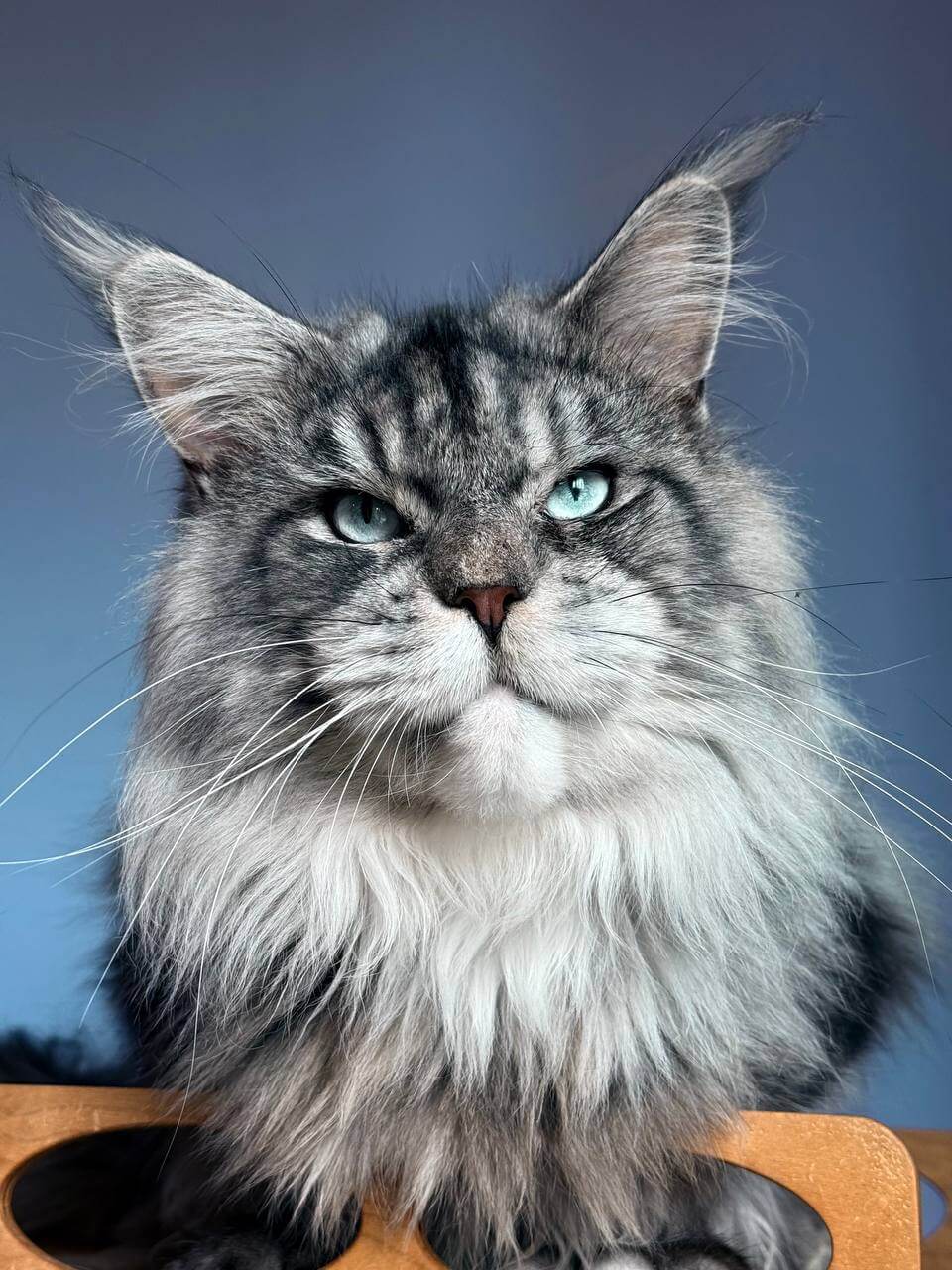 Meet Diamond, our stunning black silver tabby blotched Maine Coon boy with enchanting blue eyes and a heart-melting gentle spirit. From the very first touch, you’ll feel his soft, luxurious fur and hear his sweet, soothing purrs as he curls into your arms for a cuddle. Diamond is the definition of grace and affection, eager to greet you with warmth and those soulful, curious eyes every morning.