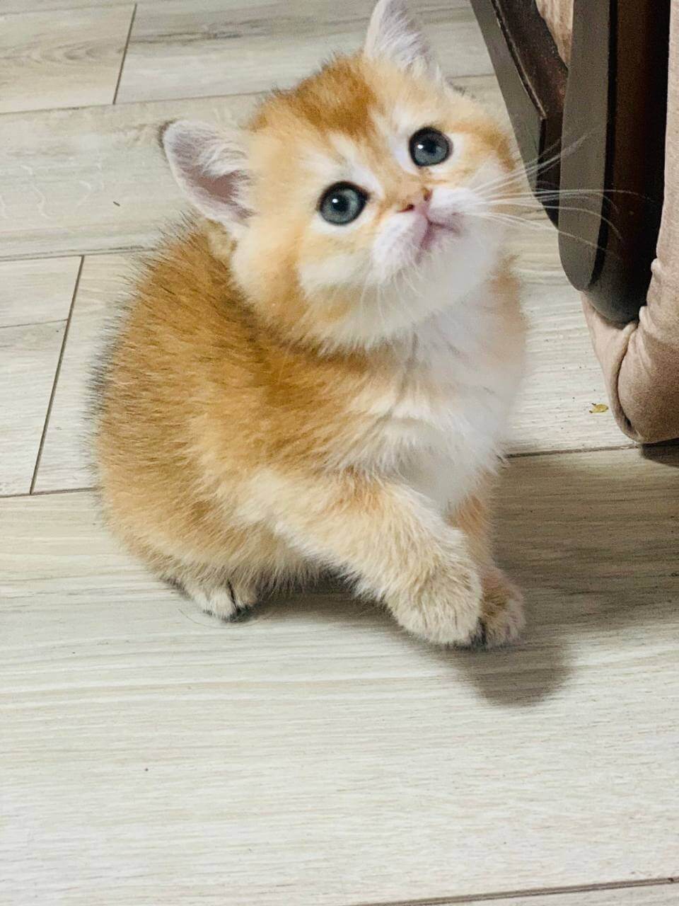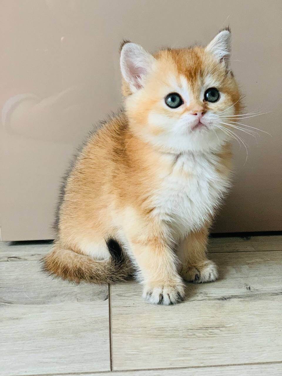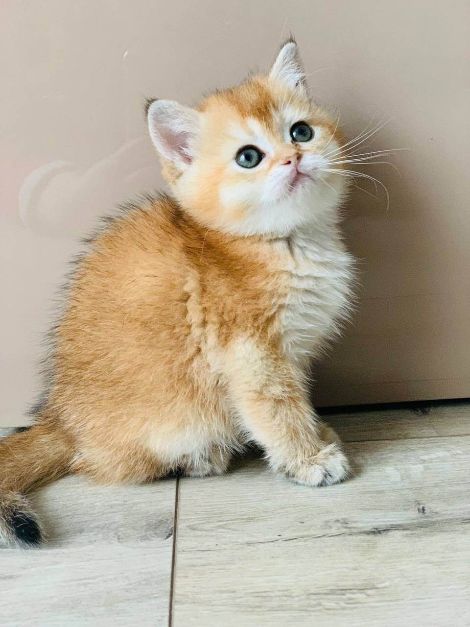 Picture Dina’s satiny Black Golden Shaded Scottish Straight coat draping over your arm—a velvet-soft warmth tinged with rich golden hues and smoky black accents. Her luminous green eyes radiate curiosity and gentleness, drawing you in with every blink. Every detail, from her plush round paws to her softly purring chest, invites cozy afternoons spent together.