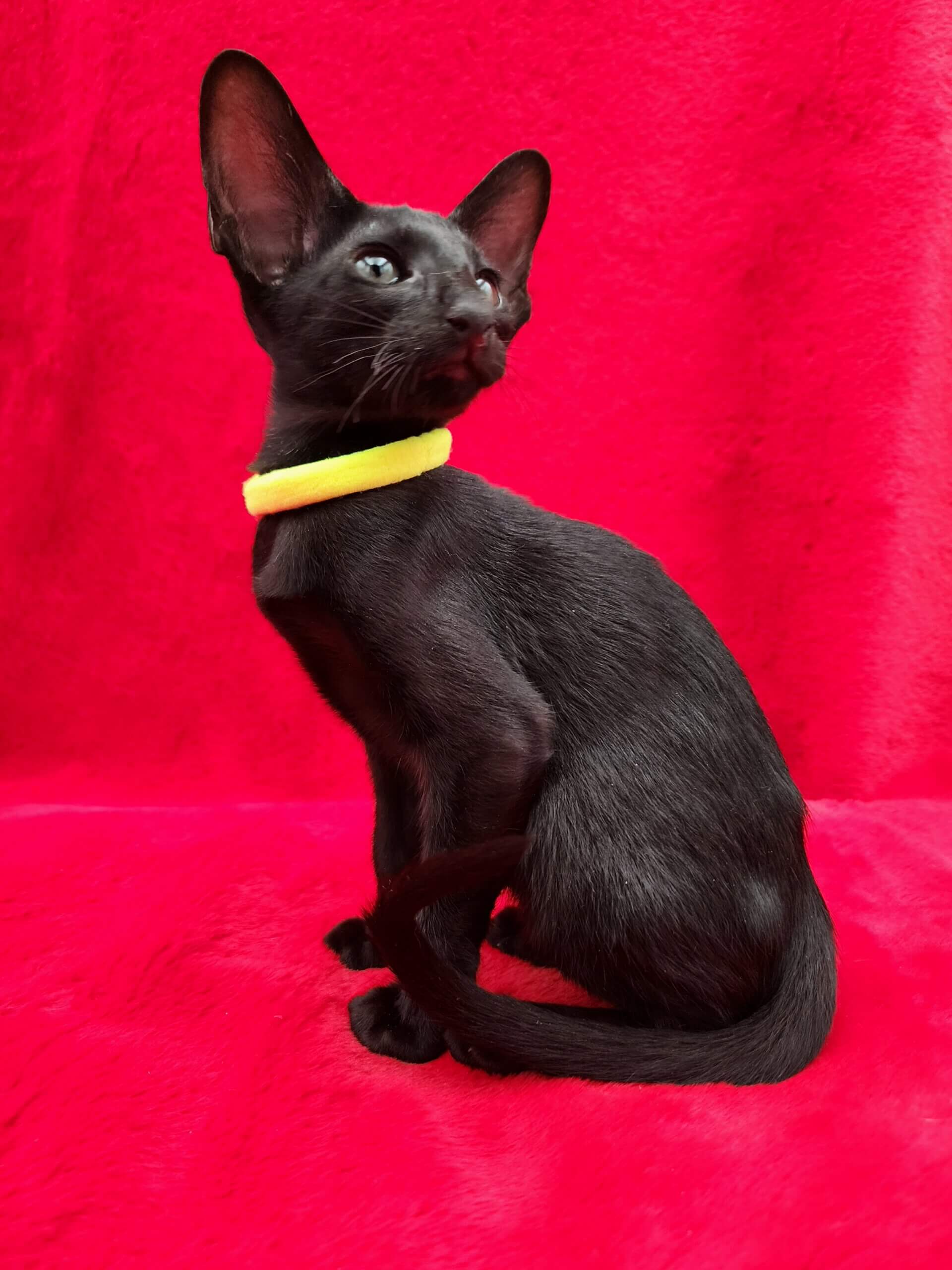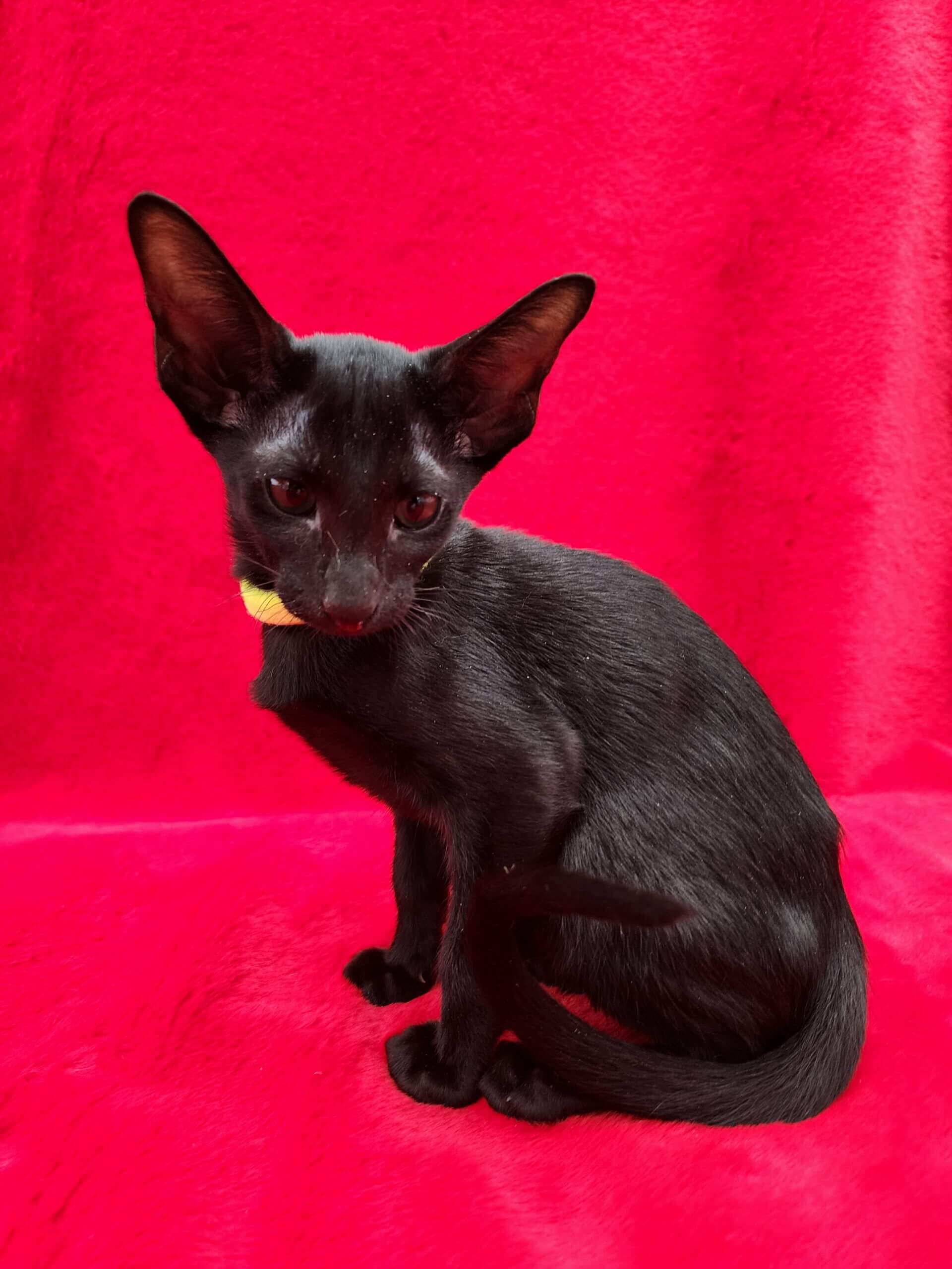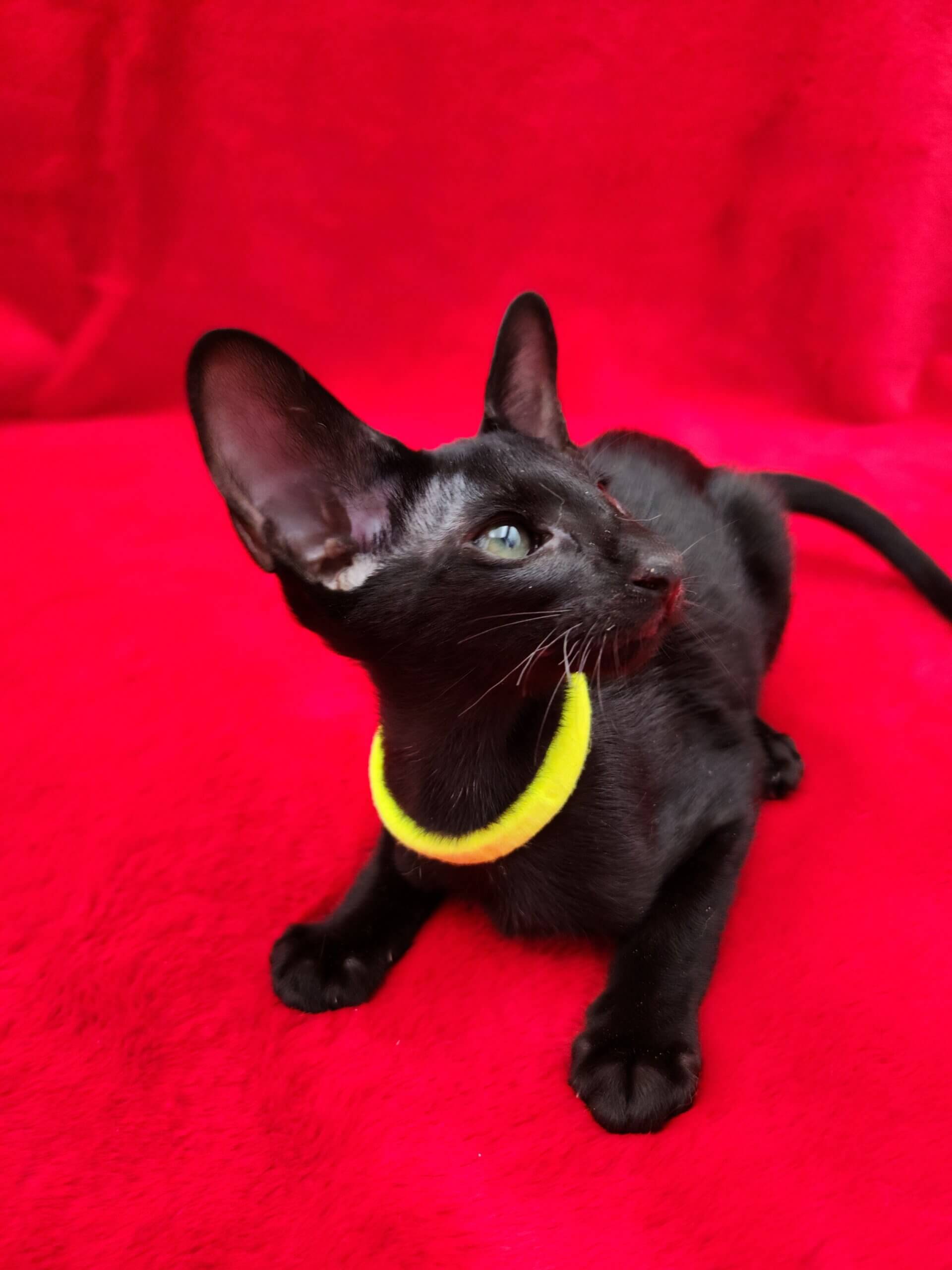 From the very first moment Dorothy curls up in your arms, you’ll understand why hearts melt for Oriental kittens. Her silken midnight coat shimmers with every stretch, punctuated by luminous yellow eyes that watch your every move with gentle curiosity and love. She’s a true showstopper, but her purr is pure comfort—soft, deep, and ready to turn any room into a warm haven.