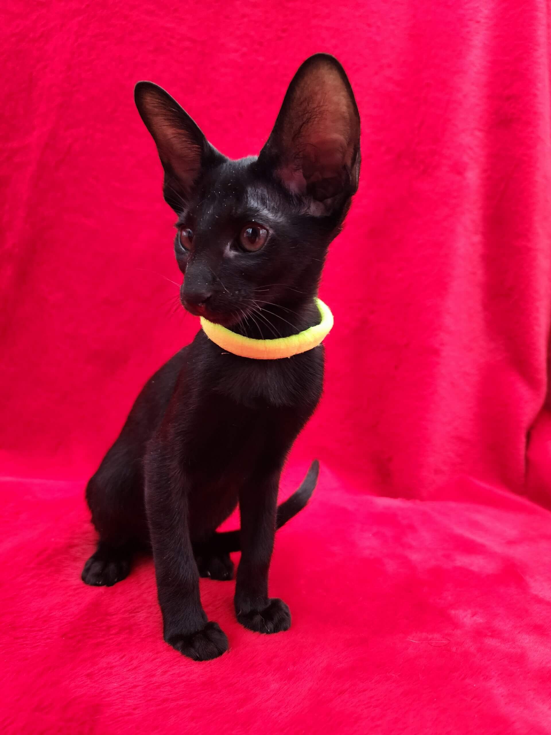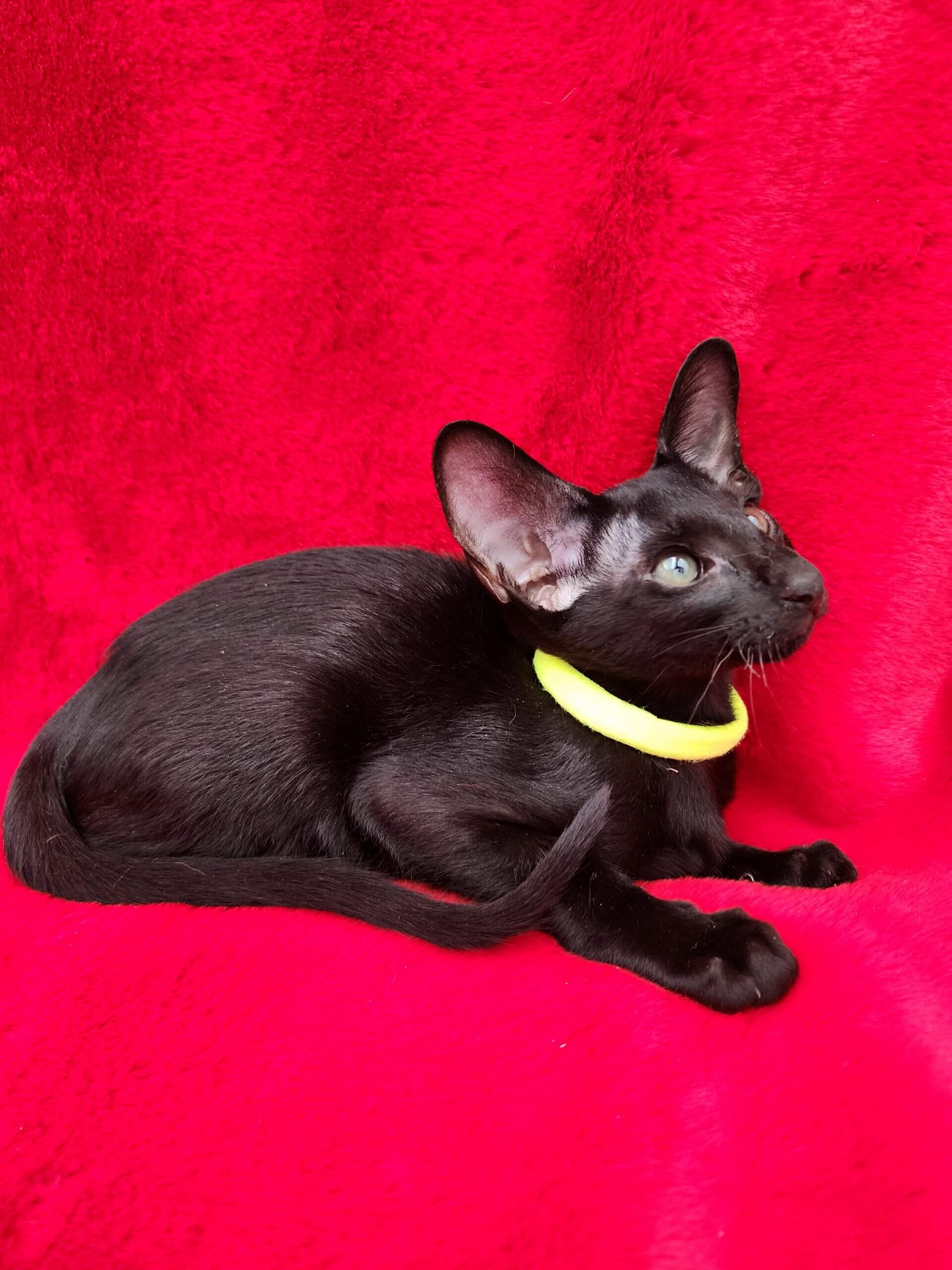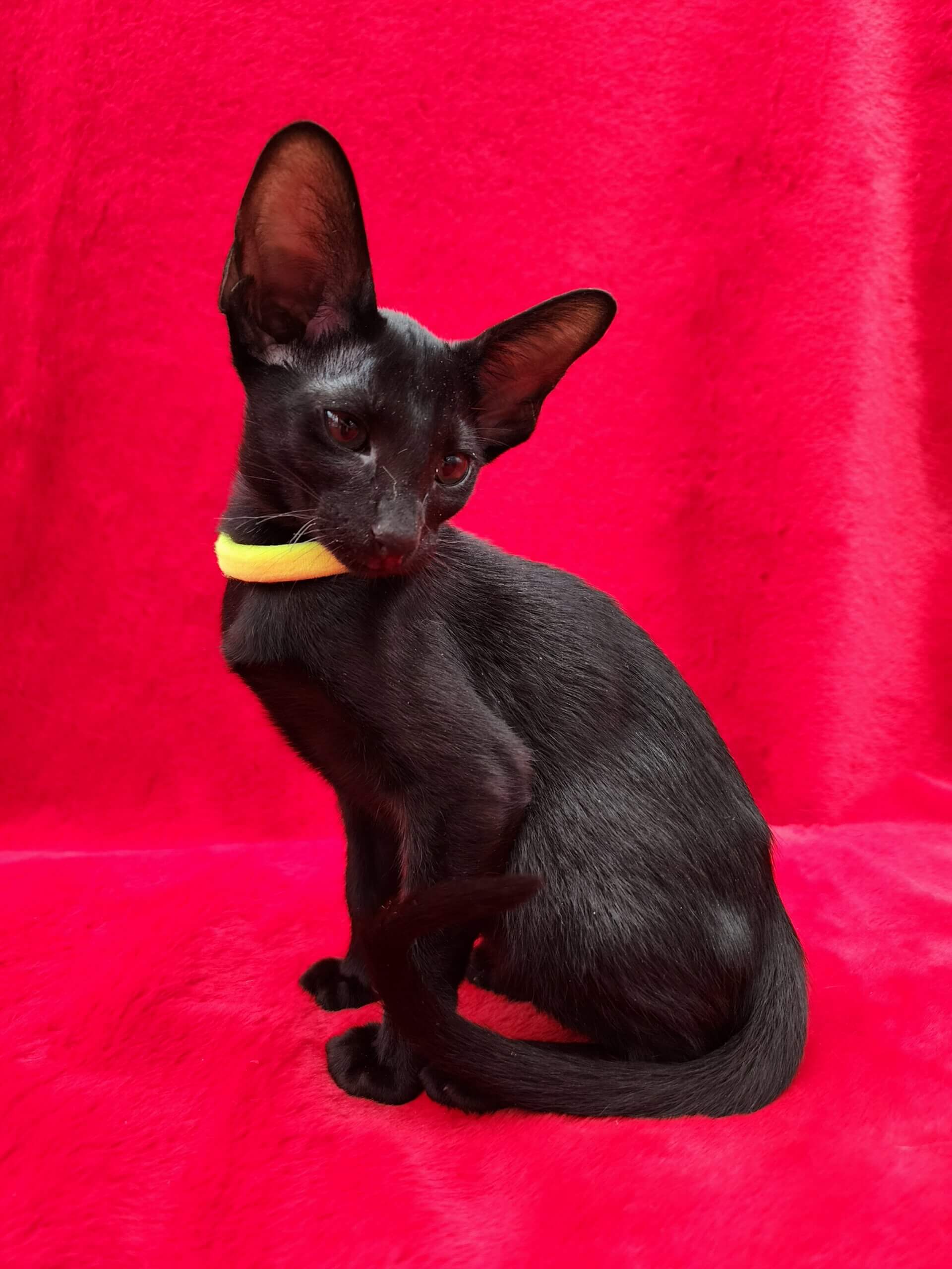 From the very first moment Dorothy curls up in your arms, you’ll understand why hearts melt for Oriental kittens. Her silken midnight coat shimmers with every stretch, punctuated by luminous yellow eyes that watch your every move with gentle curiosity and love. She’s a true showstopper, but her purr is pure comfort—soft, deep, and ready to turn any room into a warm haven.