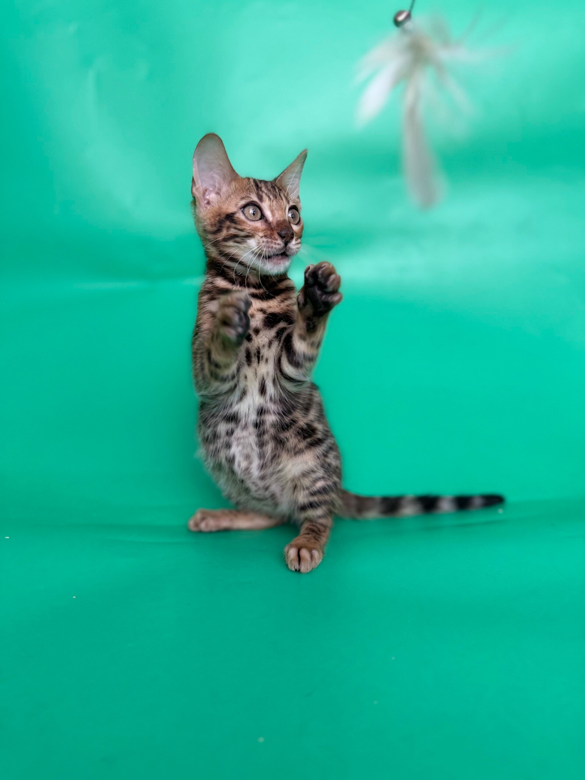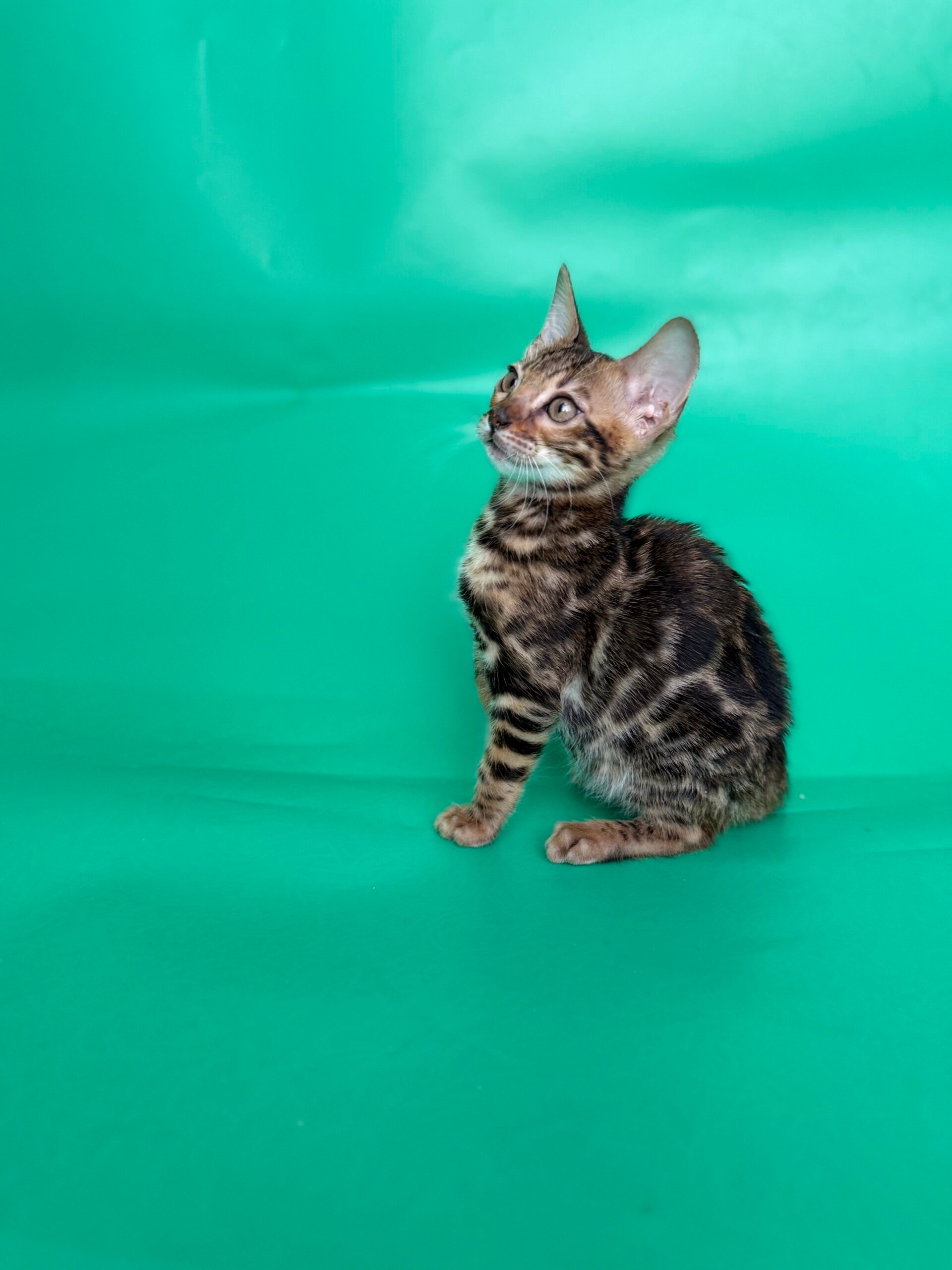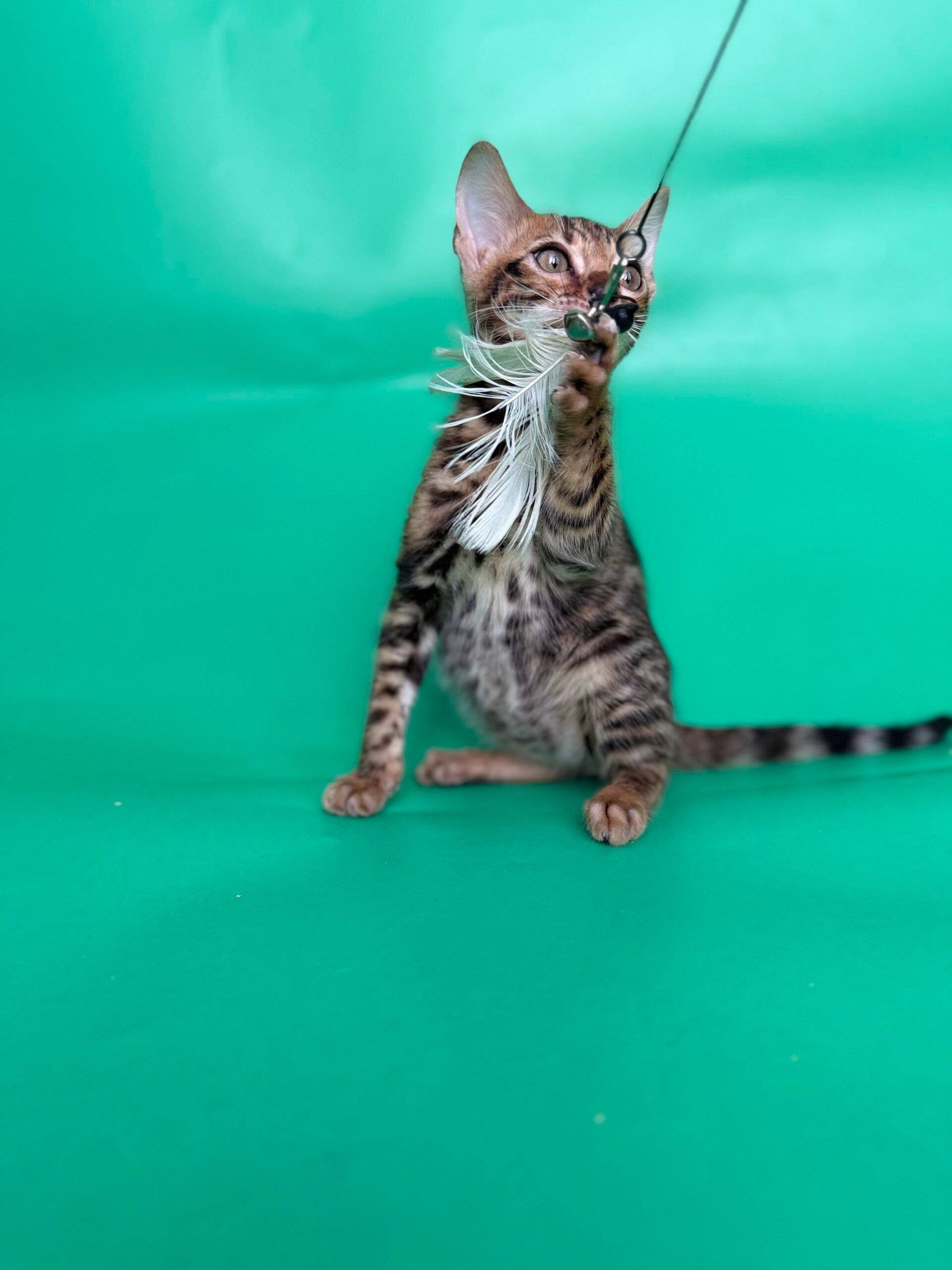 Meet Ector, a show-stopping Black Tabby Spotted boy with soulful yellow eyes that radiate warmth and wonder. From the very first purr, Ector will melt into your arms—a gentle cuddle companion with a playful, curious spark.