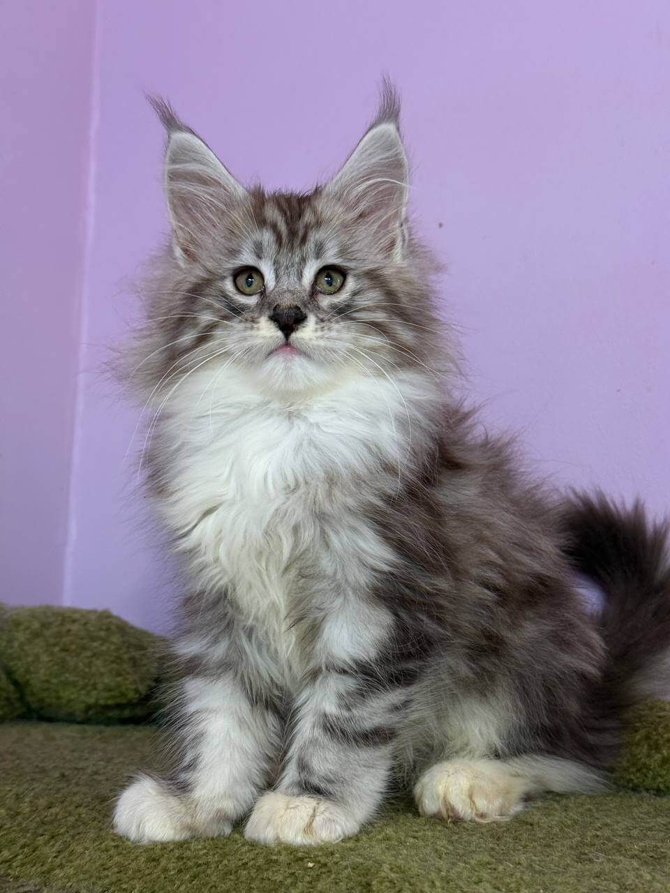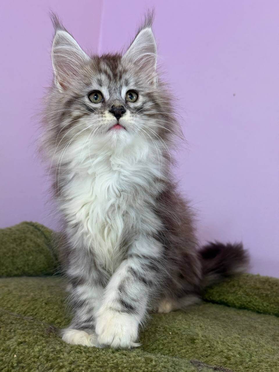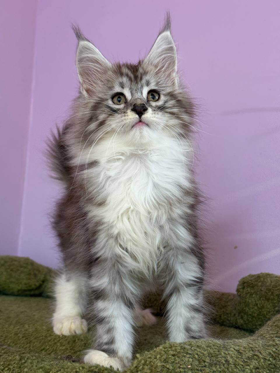 Elena has the soul of a gentle monarch. Watch her pad quietly to greet you at the door with a low, melodious trill; a Maine Coon’s signature welcome. She prefers curling beside your pillow at night, purring softly, or entertaining you with gravity-defying leaps after her favorite feather wand. Loyal and sensitive, she bonds quickly and delights in tracking your daily routine.