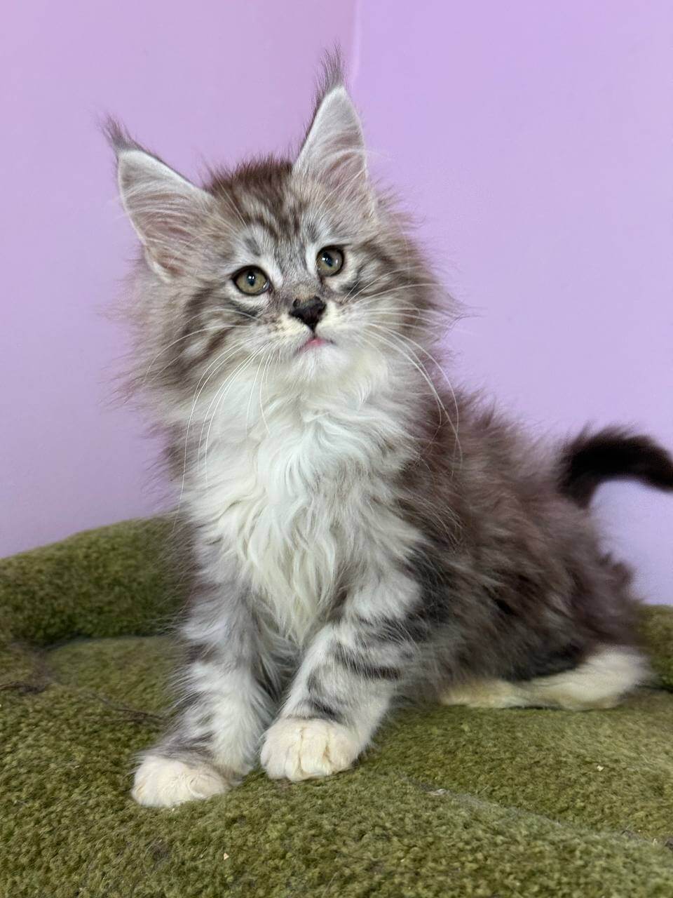 Run your fingers through Elena’s opulent fur and you’ll discover that being held by a Black Silver Tabby Blotched With White Maine Coon kitten brings another level of tactile comfort. Her coat is a silken mix of pewter and snowy white, contrasted by piercing yellow eyes that follow your every movement with intelligent curiosity. Elena’s presence fills a room.