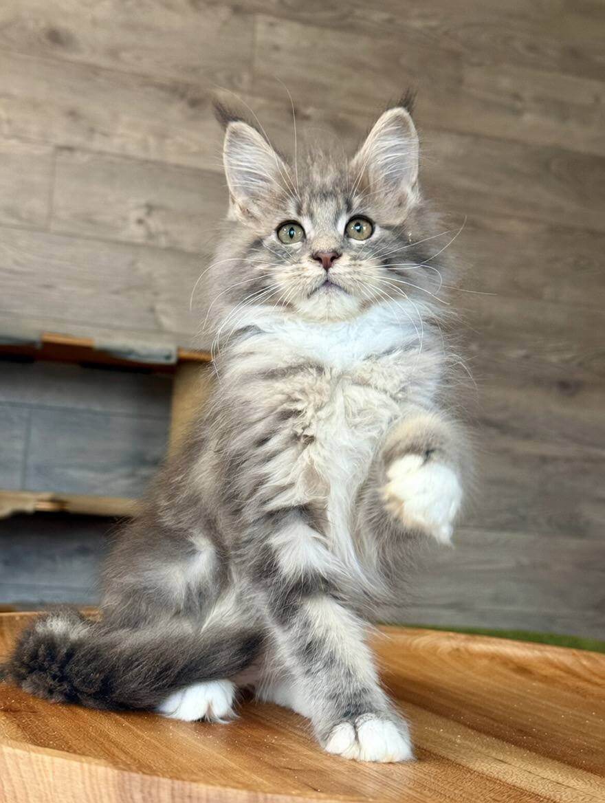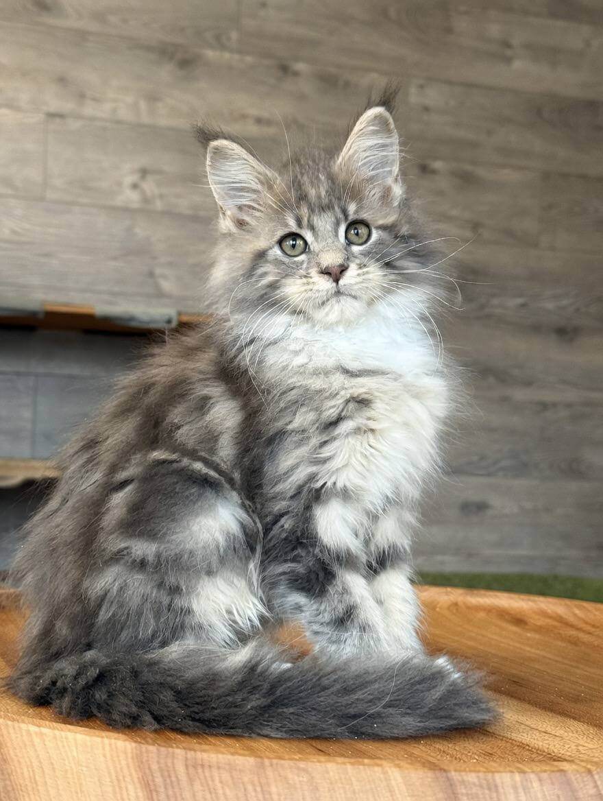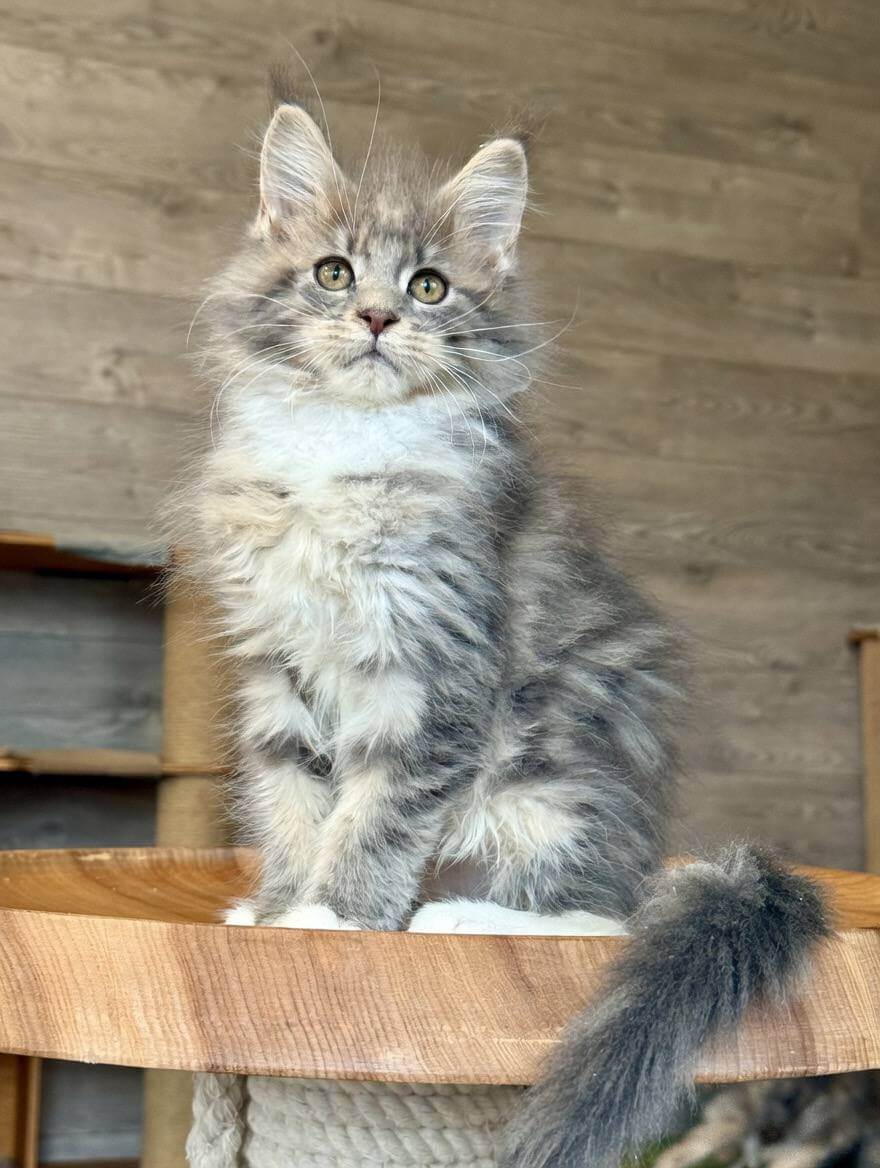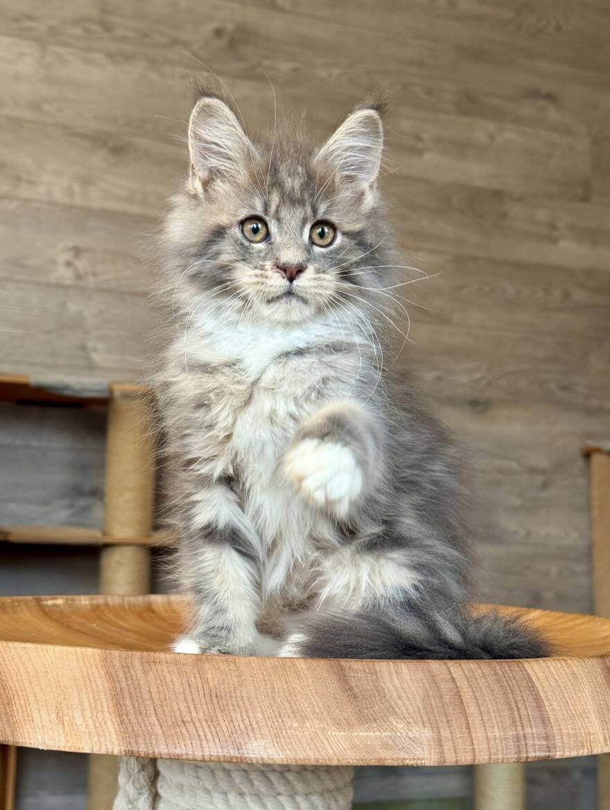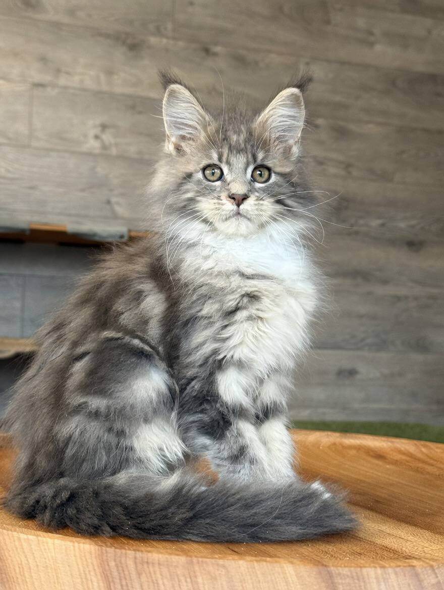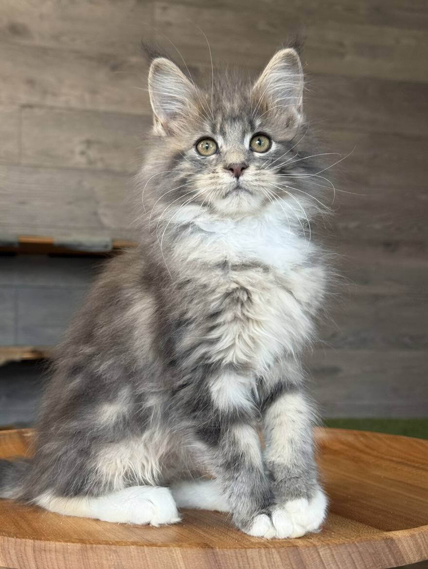 Elina is a Blue Tabby Blotched Maine Coon kitten whose silky, luxuriously thick coat feels like a cloud in your hands. Her yellow eyes radiate warmth and curiosity, drawing you in with every glance. She’s substantial and gentle—a living work of art with striking blue markings that shimmer in the afternoon light.