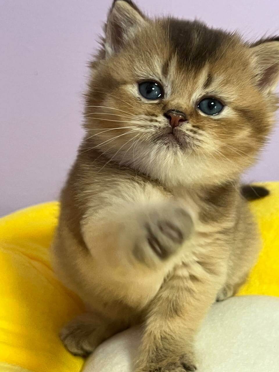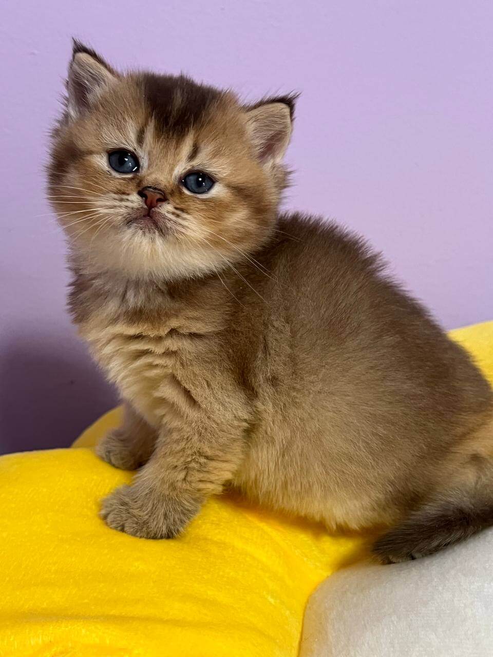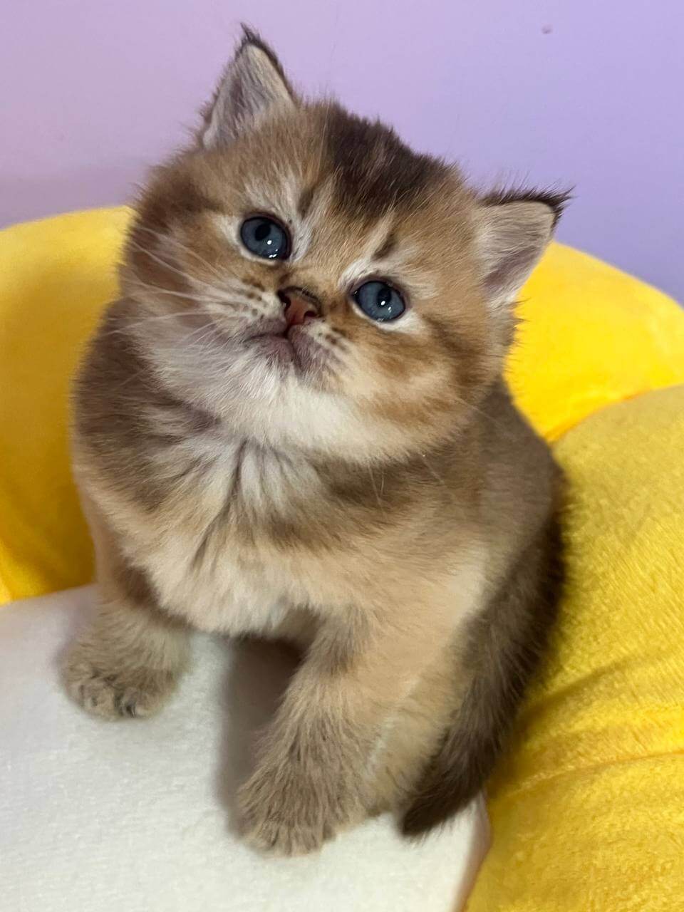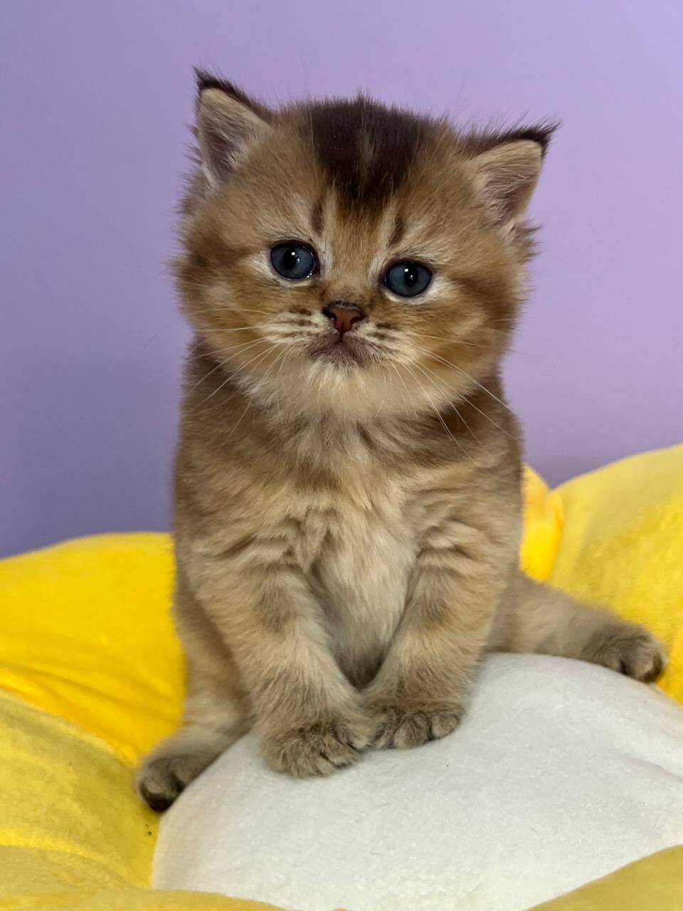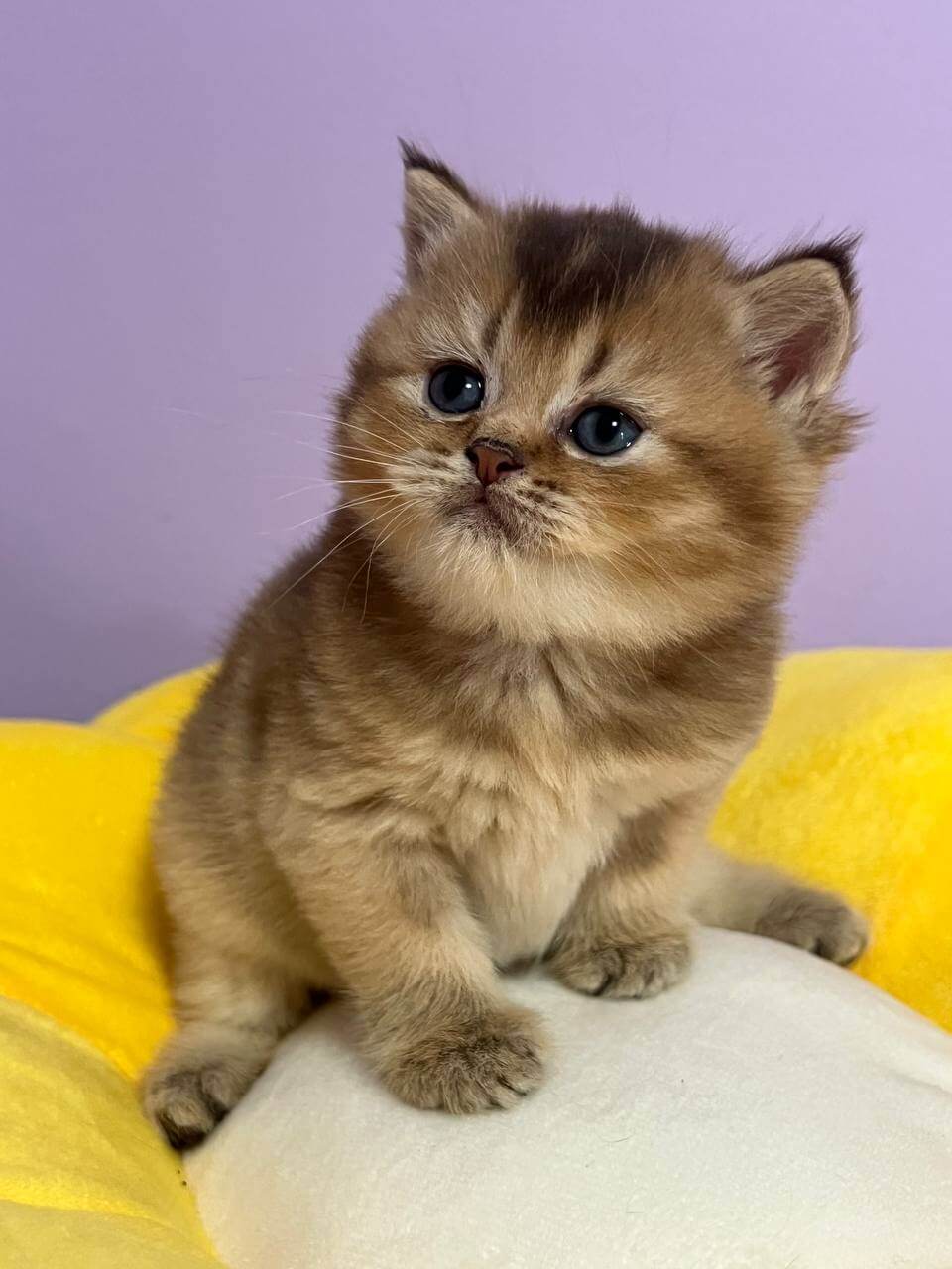 As soon as your fingers touch Elvis’s plush coat, you’ll notice the unique, dense silk of this Chocolate Golden Tabby Ticked Scottish Straight kitten. His shimmering striped fur contrasts beautifully with alert, clear green eyes, meeting your gaze with a quiet warmth. Lifting him reveals a gentle but irresistible weight, instantly soothing, as if he’s meant to be held.