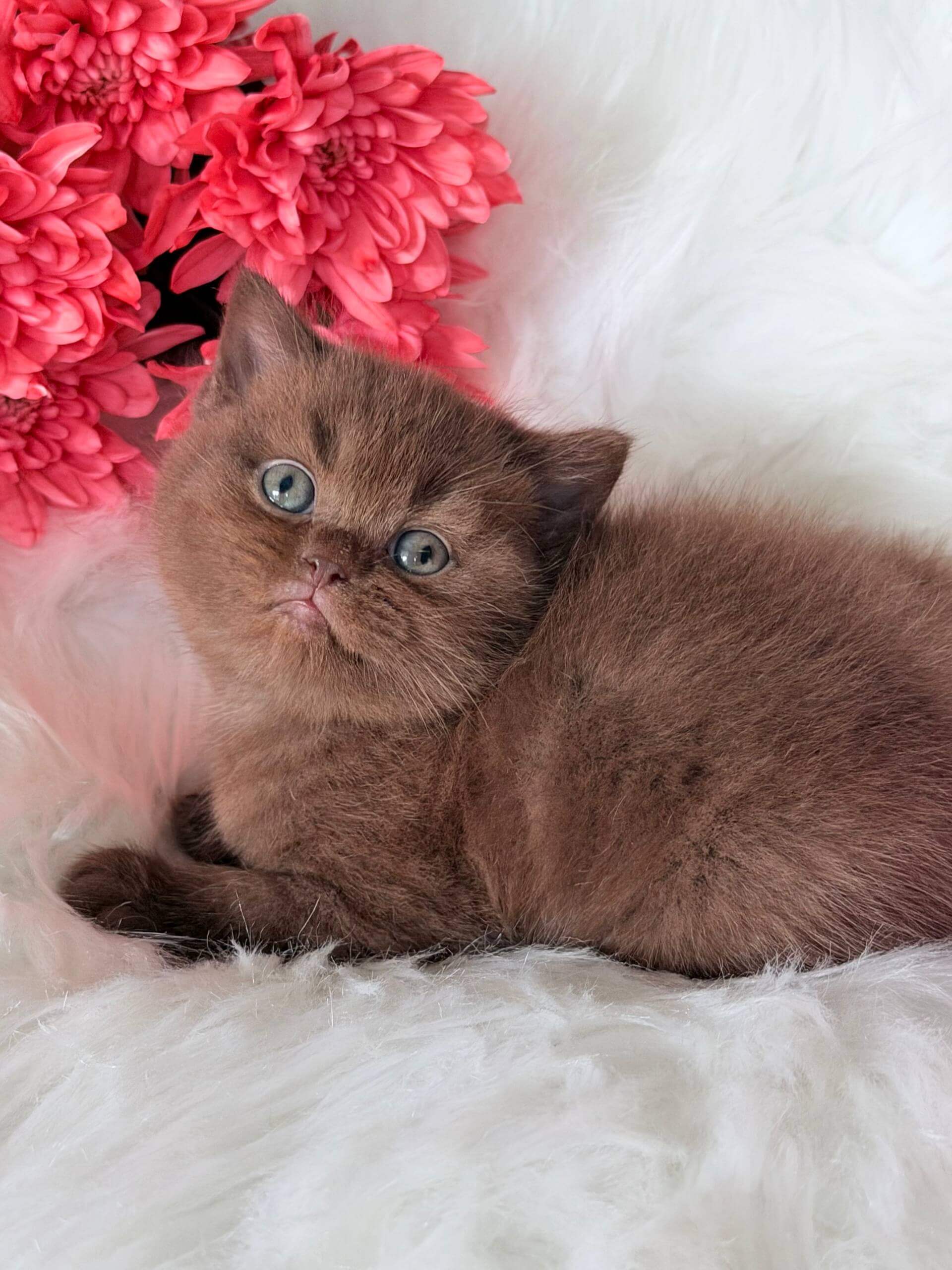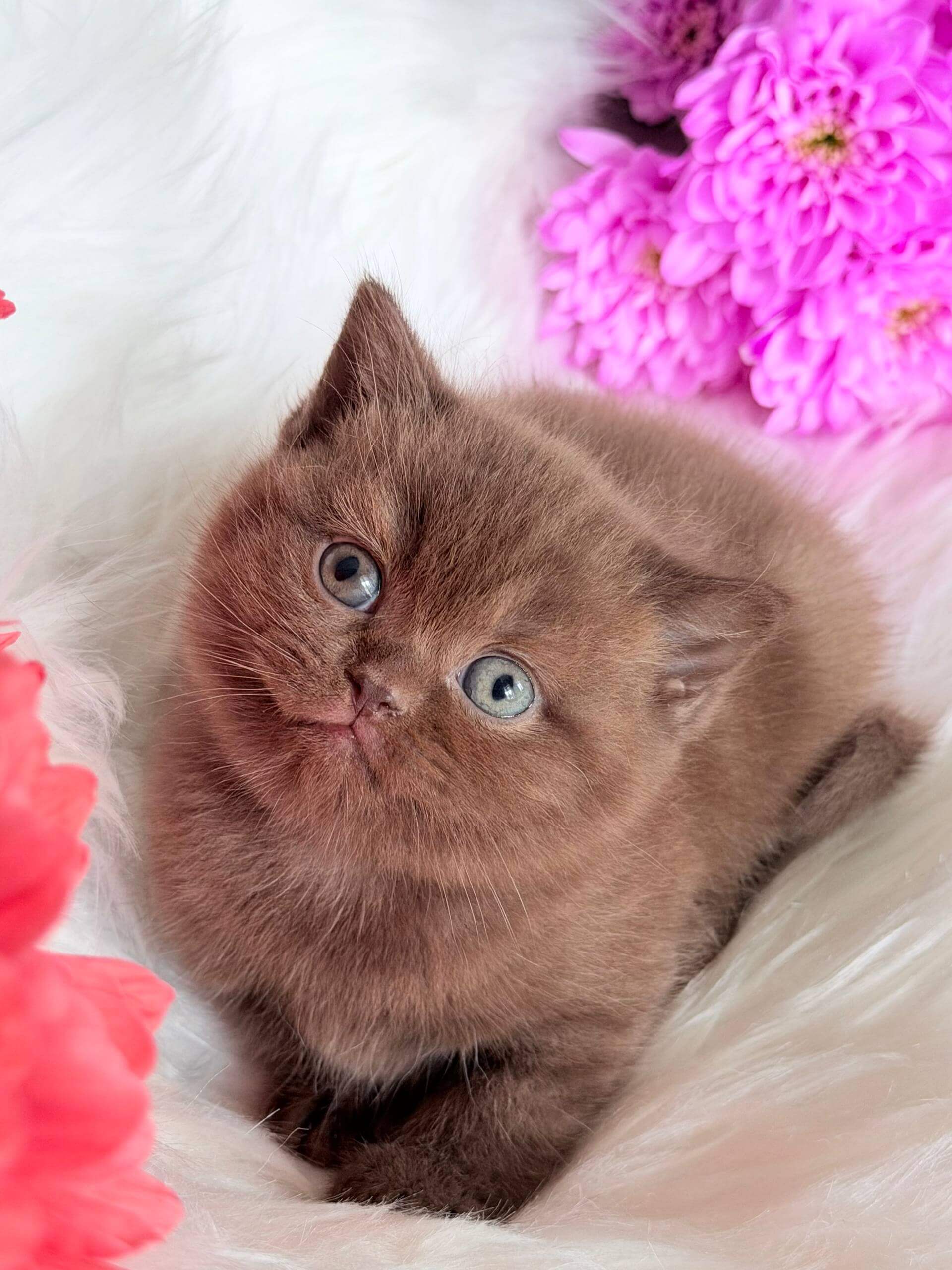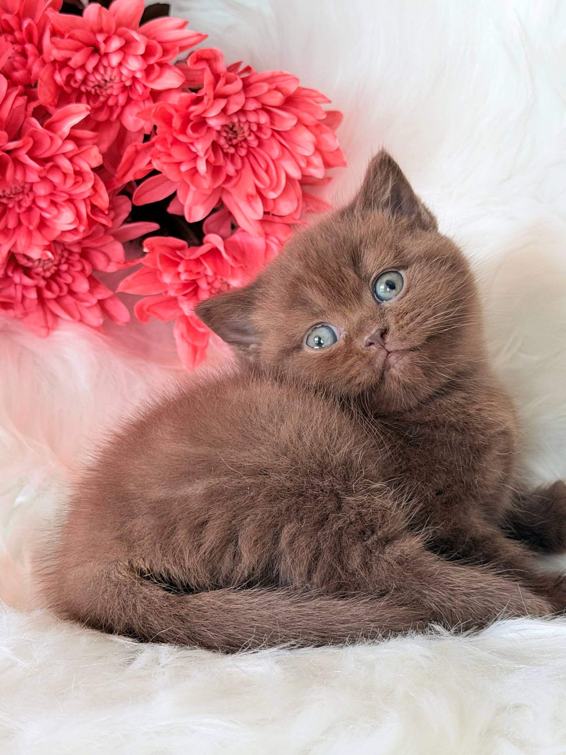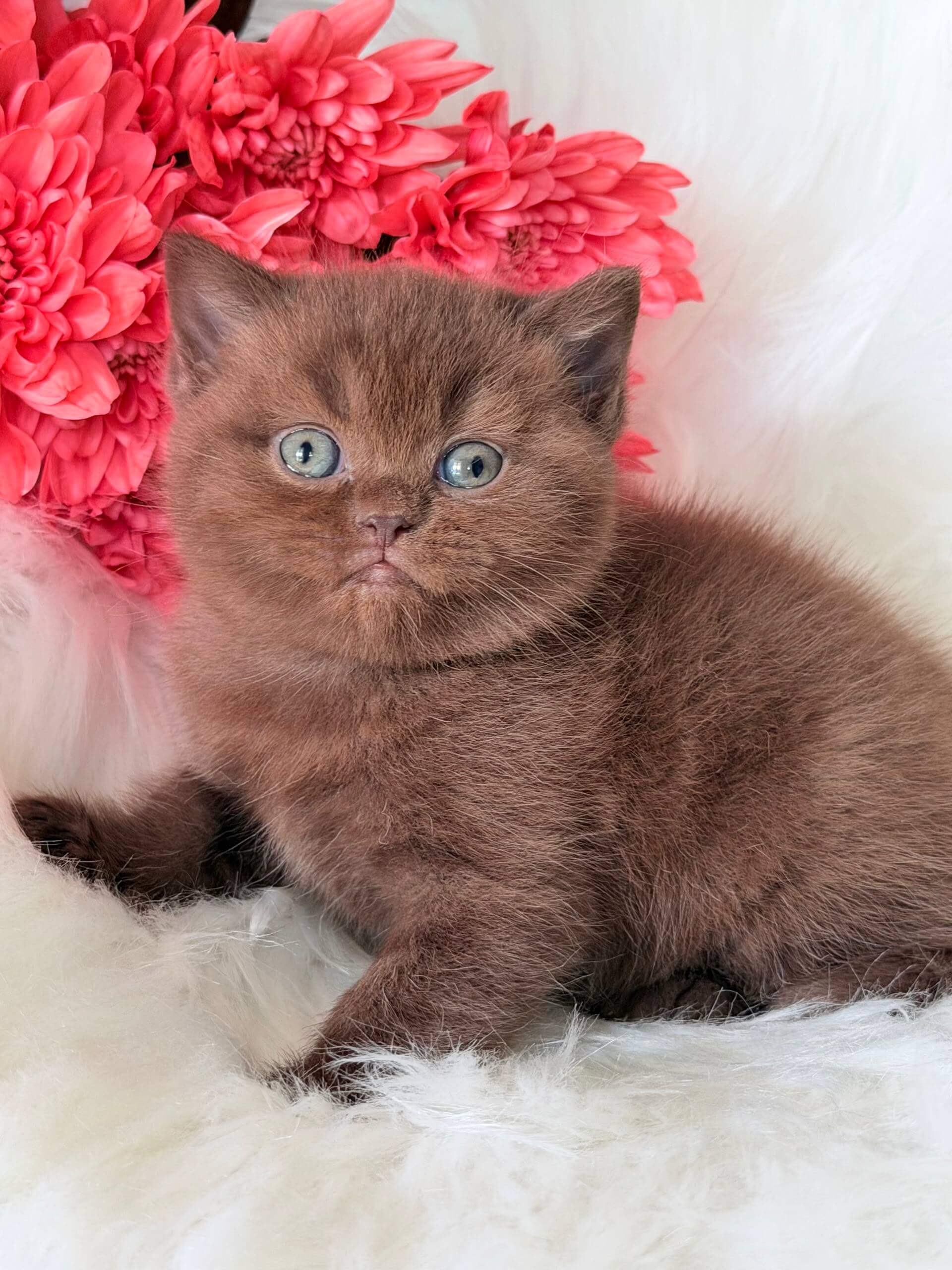 Run your fingers along Emma’s silken coat and you’ll discover just how luxuriant a Chocolate British Shorthair kitten can be. Her deep green eyes shimmer with mischief, catching flecks of honey gold in the light, and her plush, chocolate-colored fur feels soft and substantial, inviting you to lift her warm, compact form into your arms.