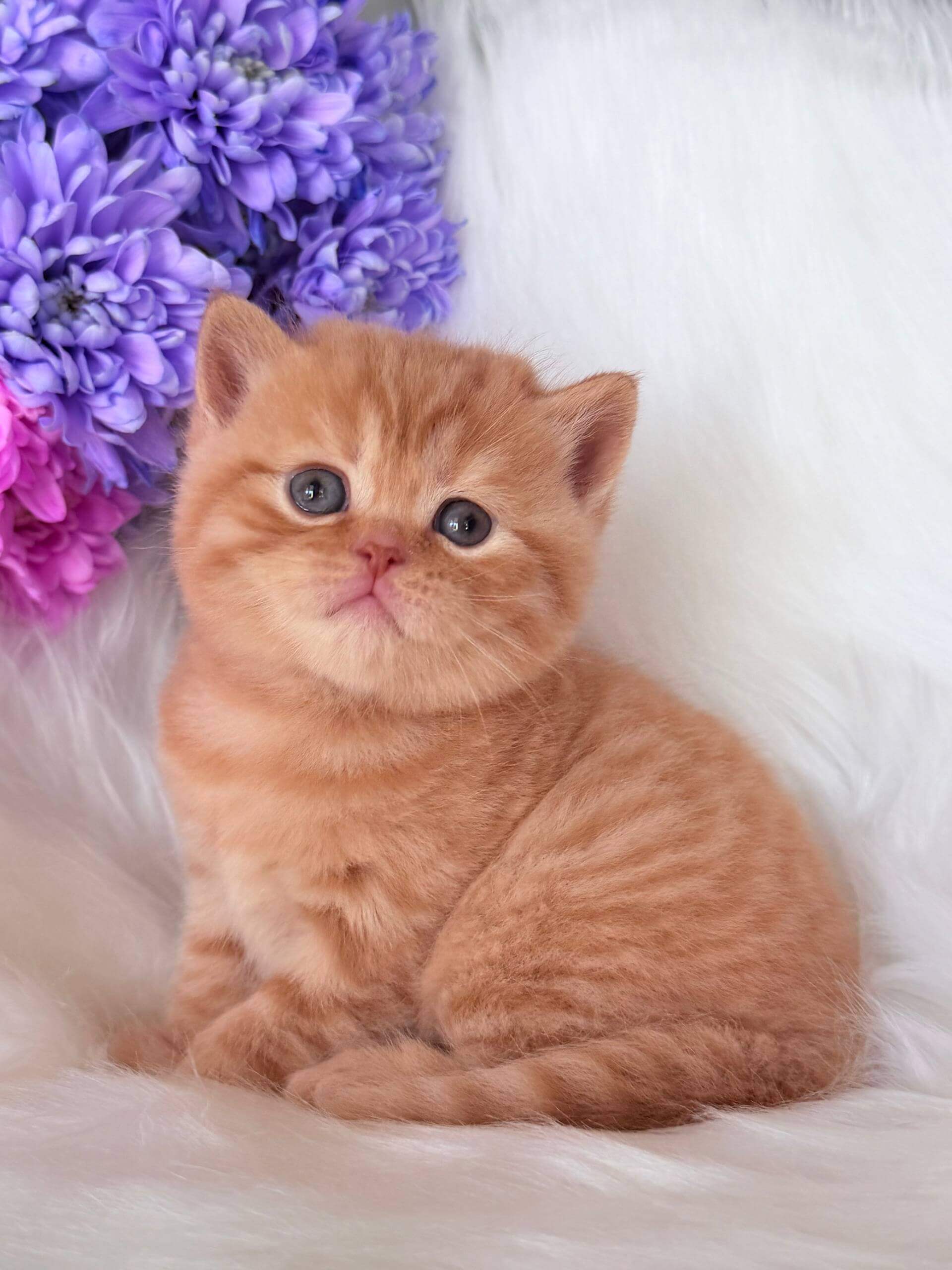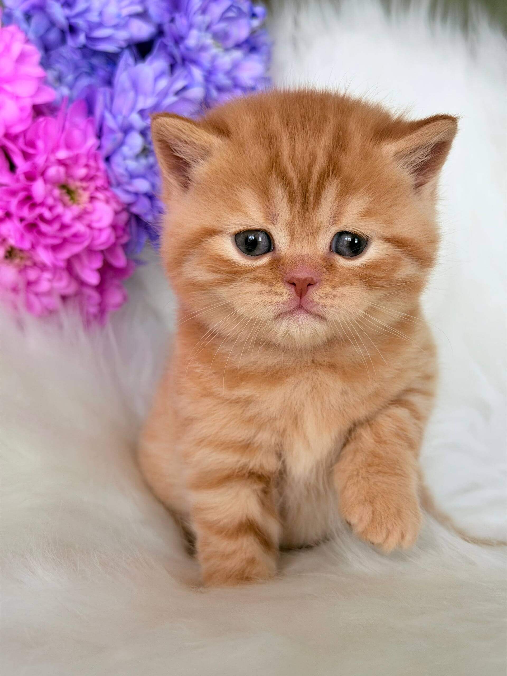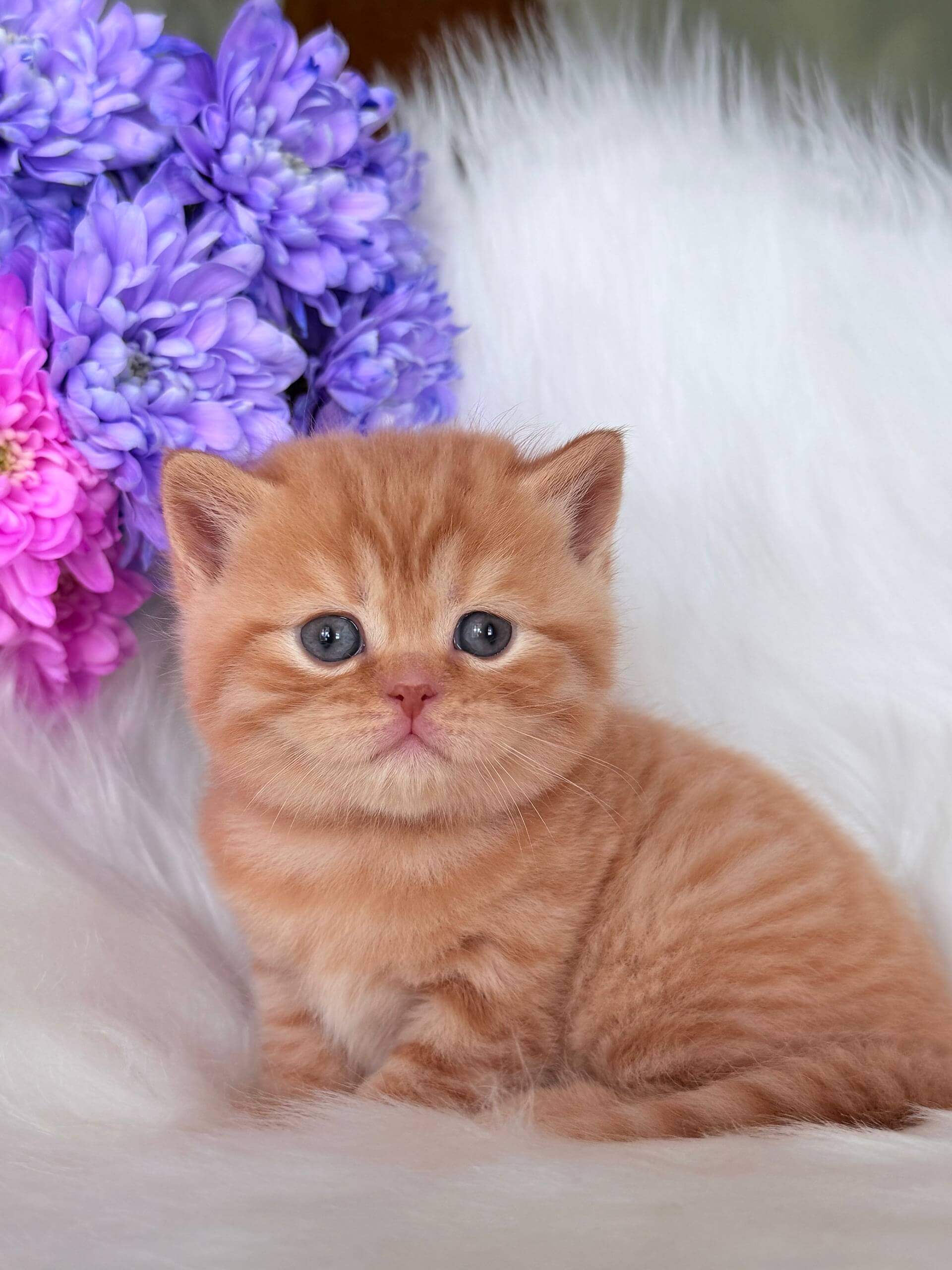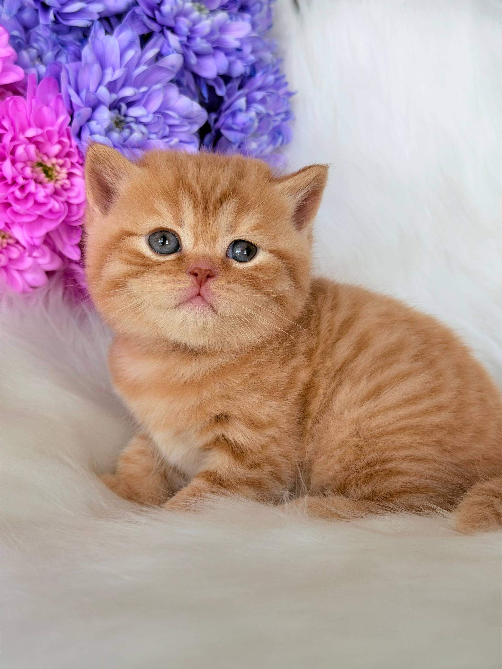 Enzo, our captivating Red British Shorthair kitten, greets you with luminous orange eyes that glow like embers in evening light. His dense, plush coat invites your hands—soft as velvet and tinged with a sunset hue unique to his rare coloring. There’s a gentle heft to Enzo when you lift him, comforting and perfectly proportioned for long, purring cuddles.