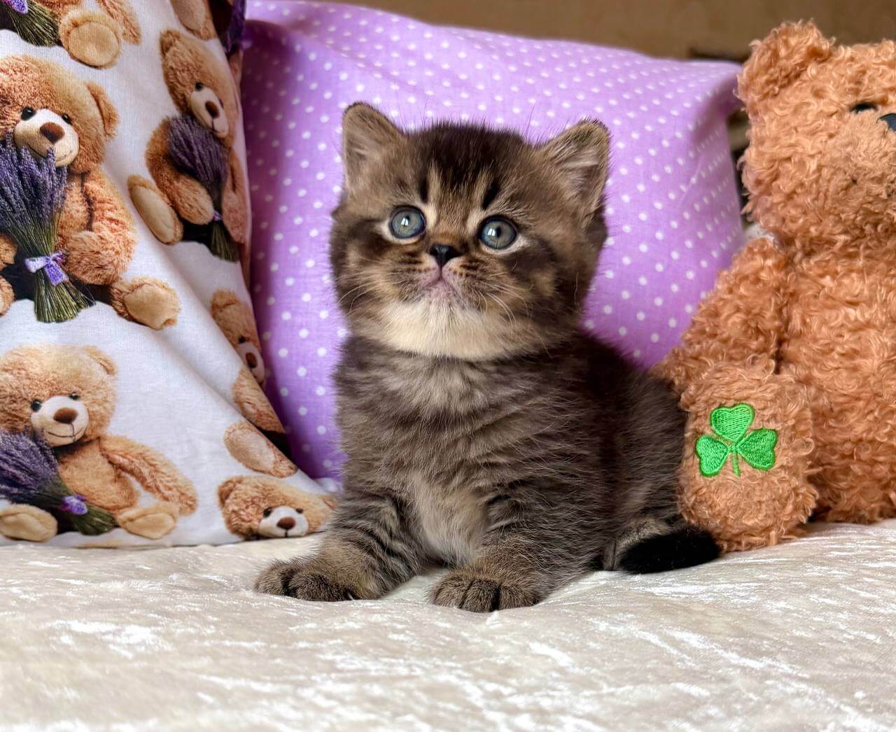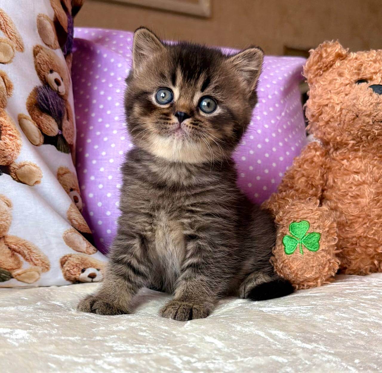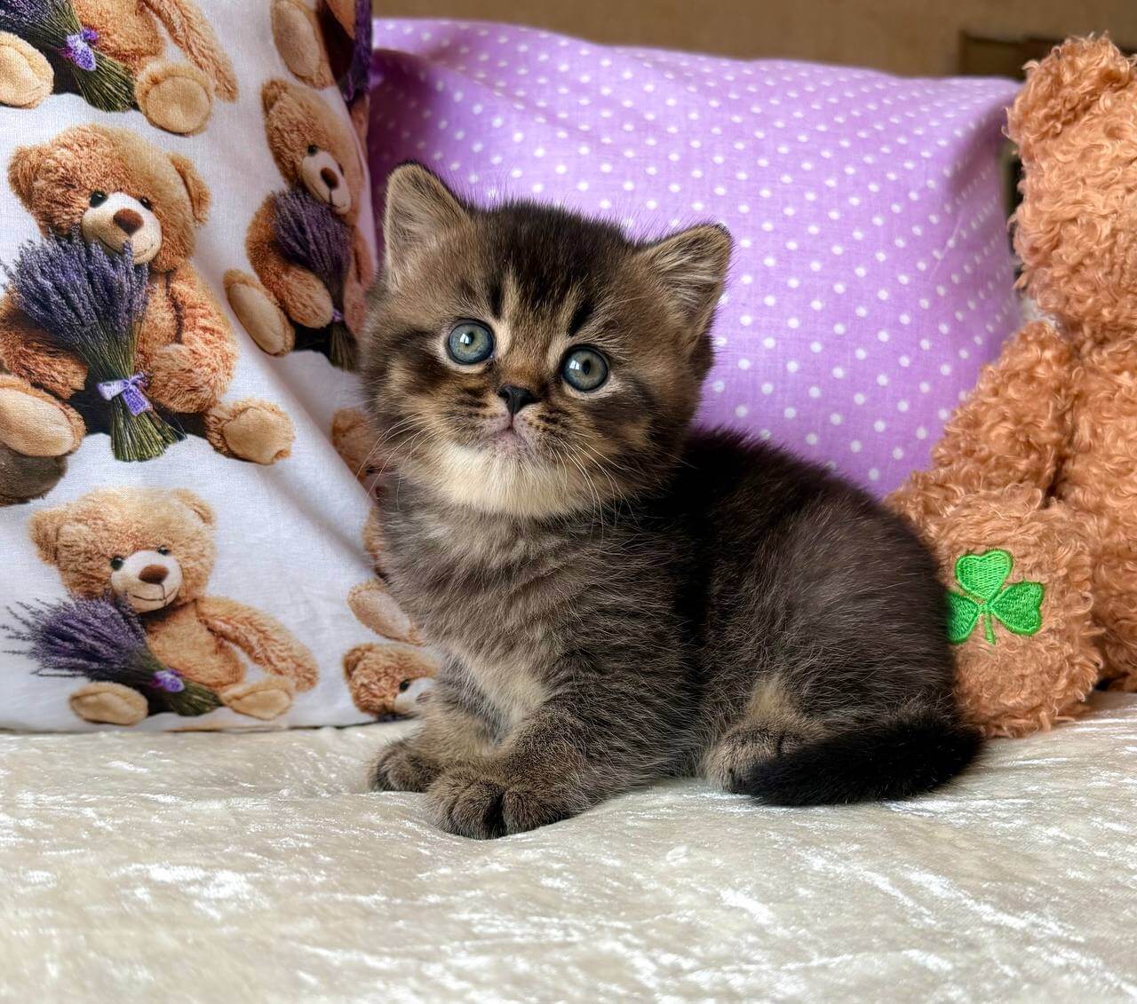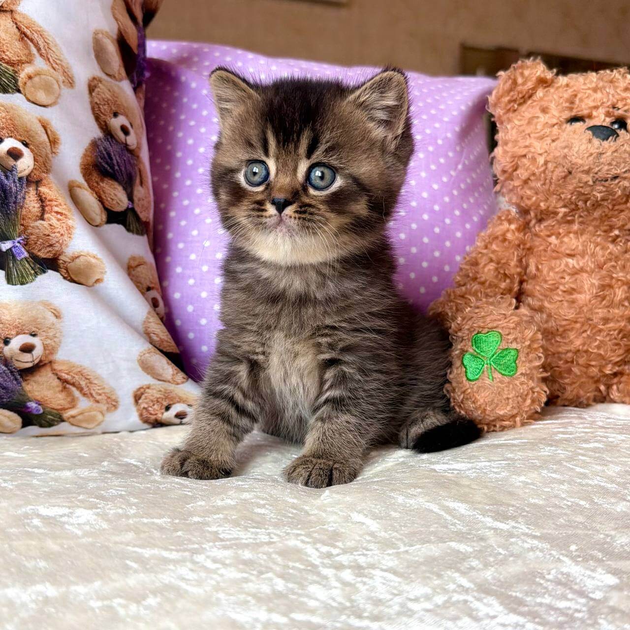 Erik, a Black Tabby Ticked British Shorthair kitten with mesmerizing yellow eyes, feels like midnight silk in your arms. His coat glimmers with rich ticking, warm to the touch and plush beneath your hand. The gentle weight of his compact frame and the soft rumble of his purr create an instant sense of comfort and belonging.