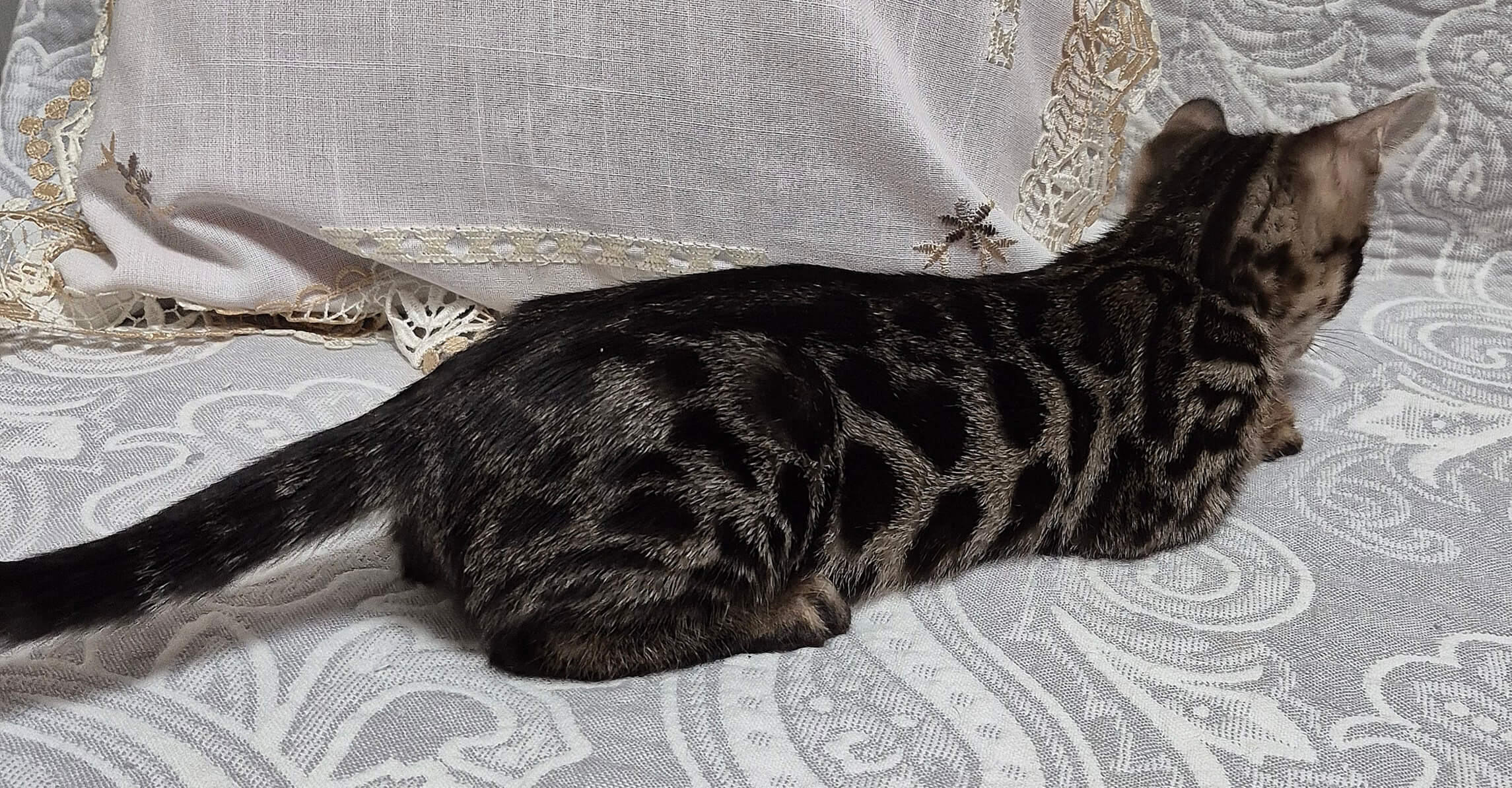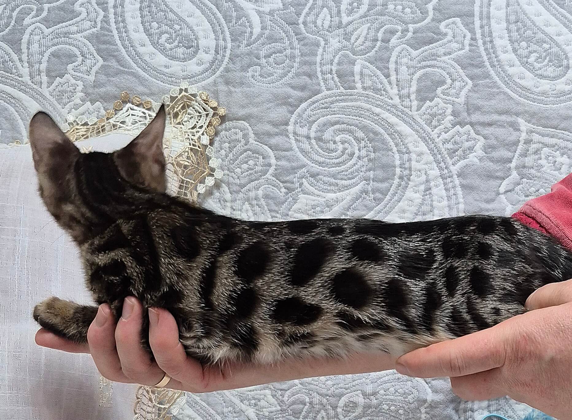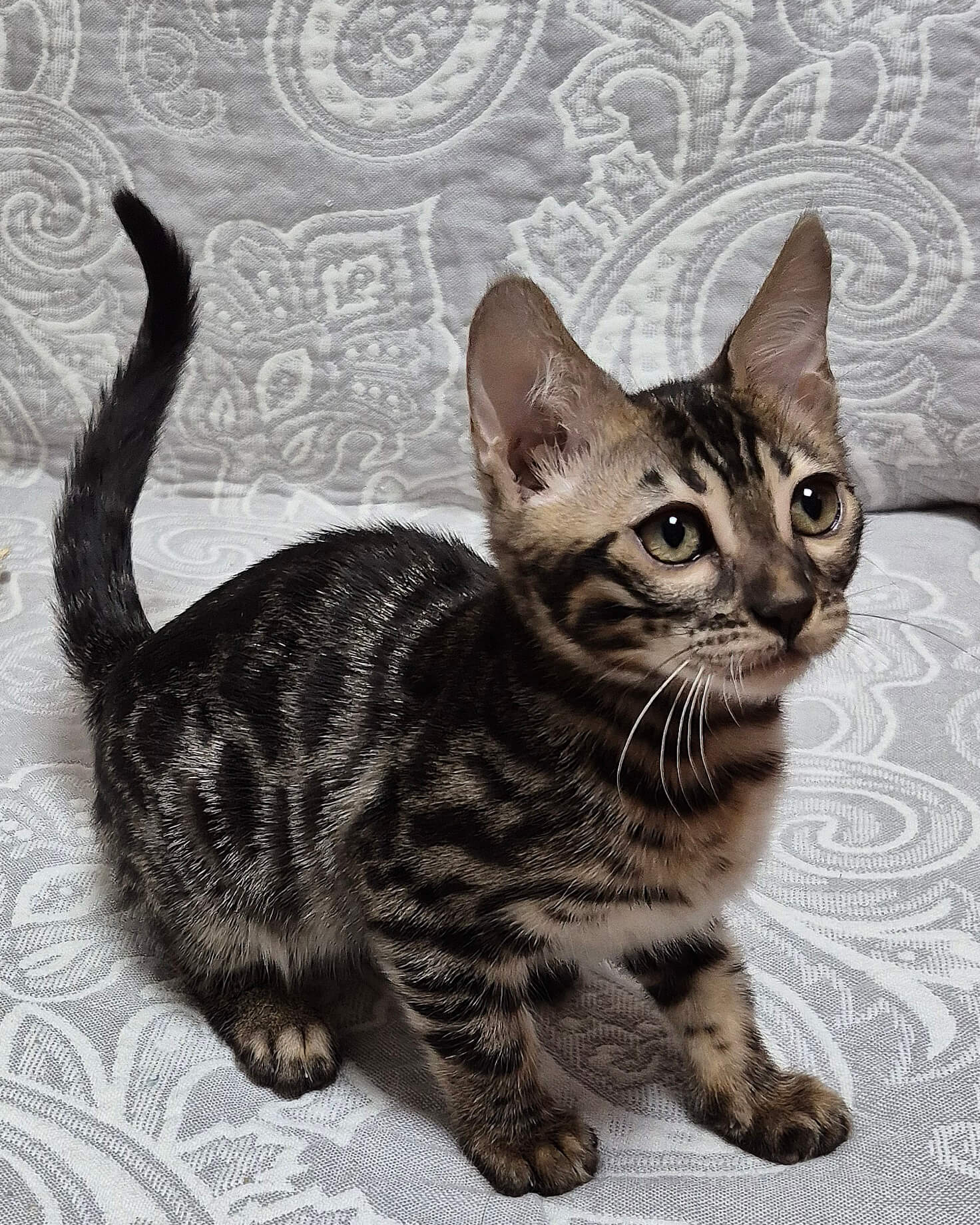 From the first gentle touch, Eva will capture your heart—her silky black tabby-spotted coat sparkles with playful stripes, while her golden-yellow eyes glow with quiet curiosity and warmth. She’s a sweetheart who purrs at the softest affection, loves cozying up for cuddles, and will greet you every morning with bright-eyed wonder.