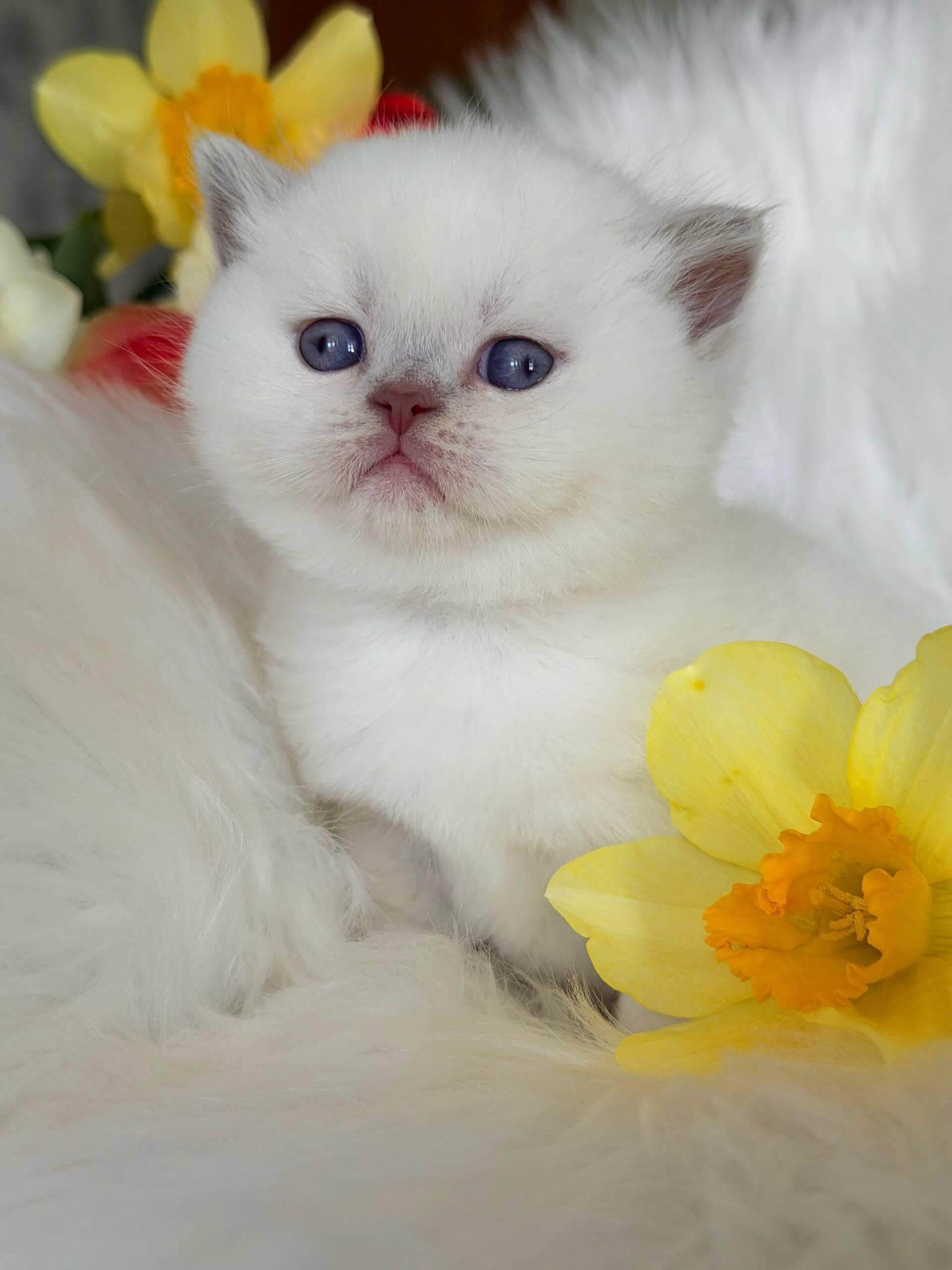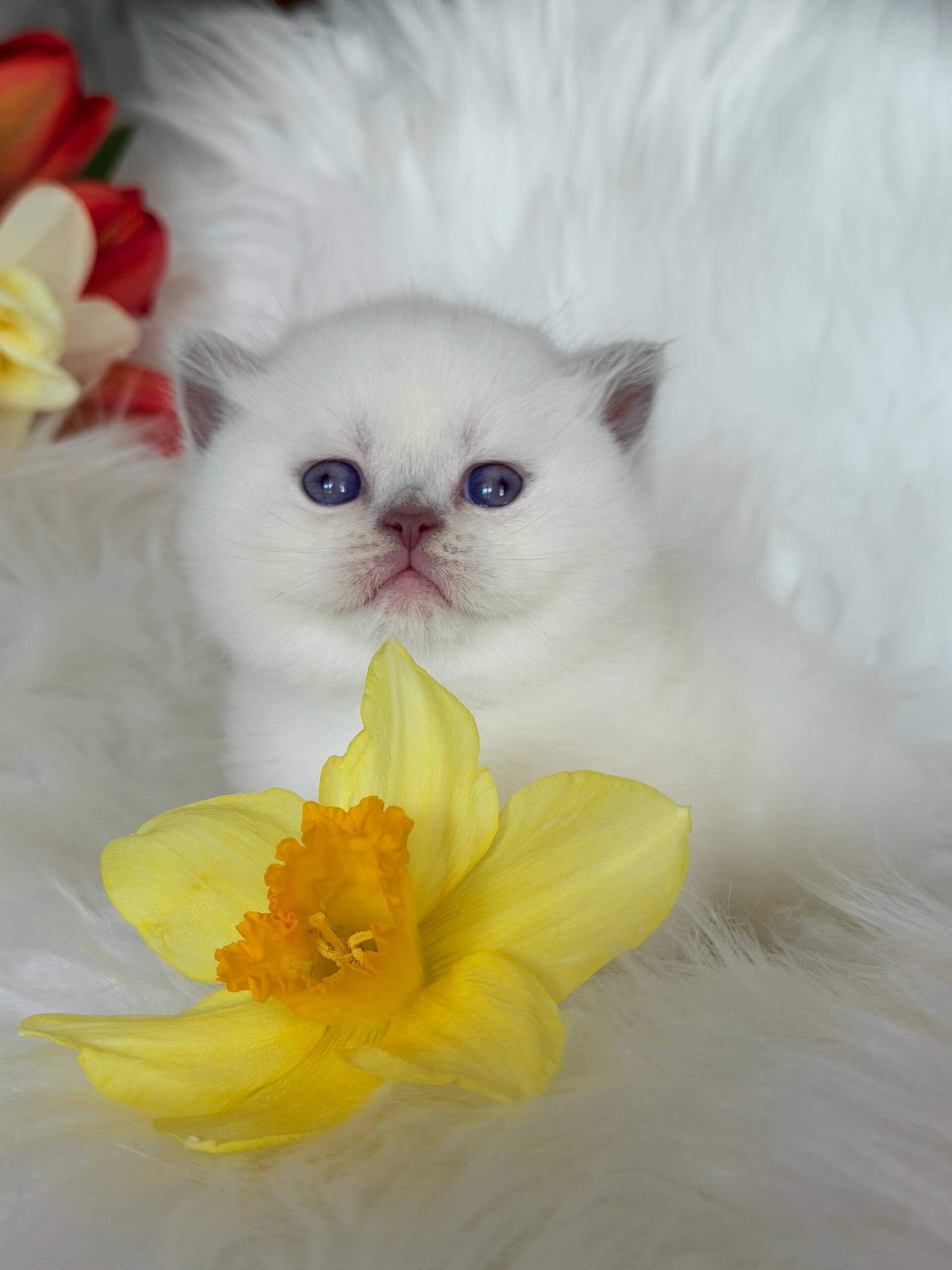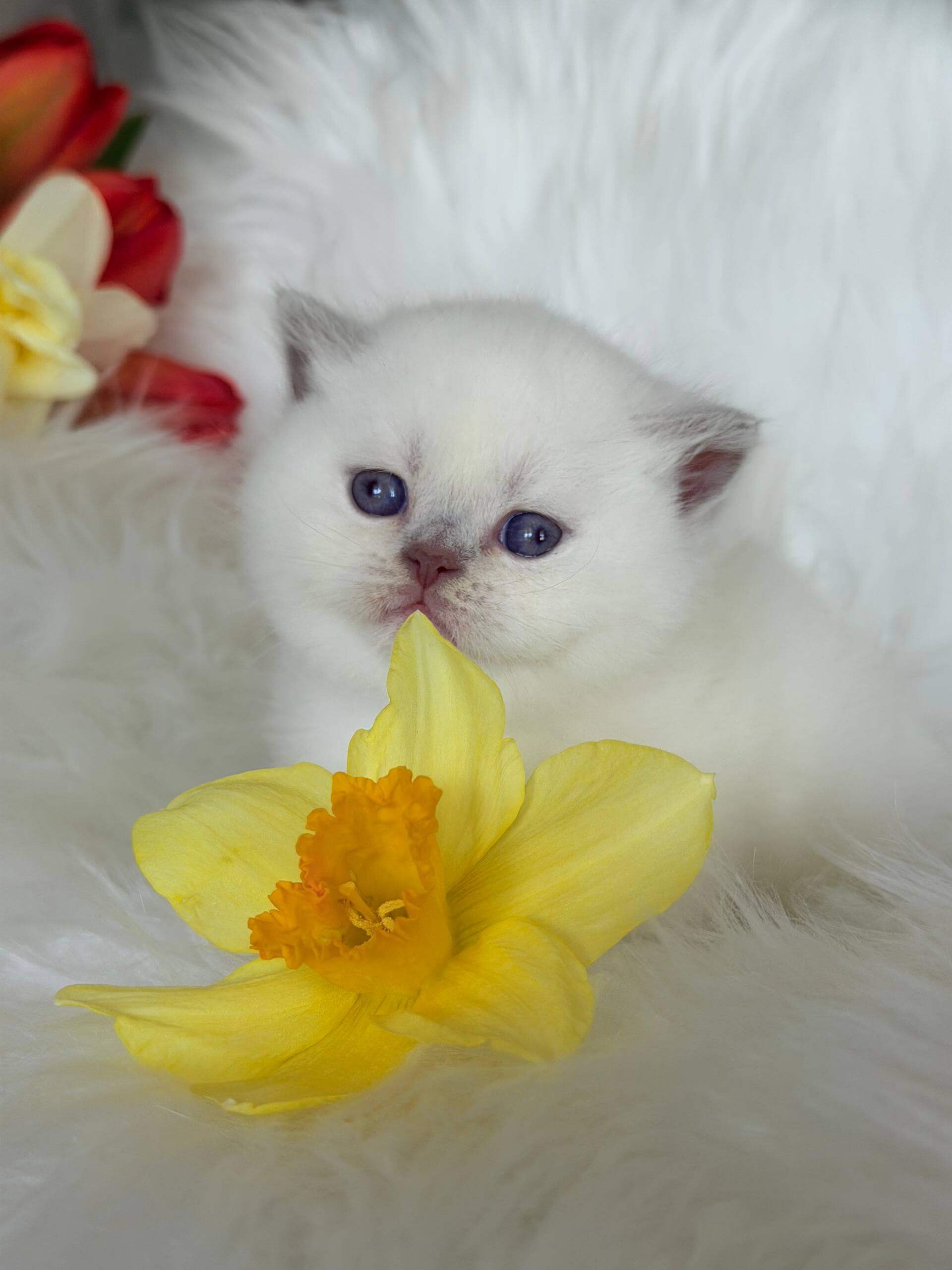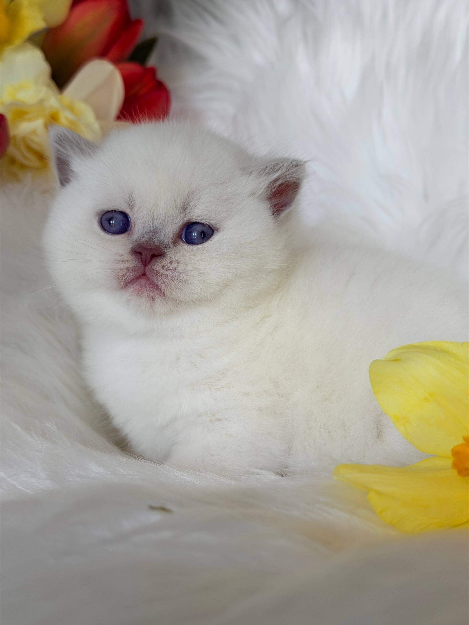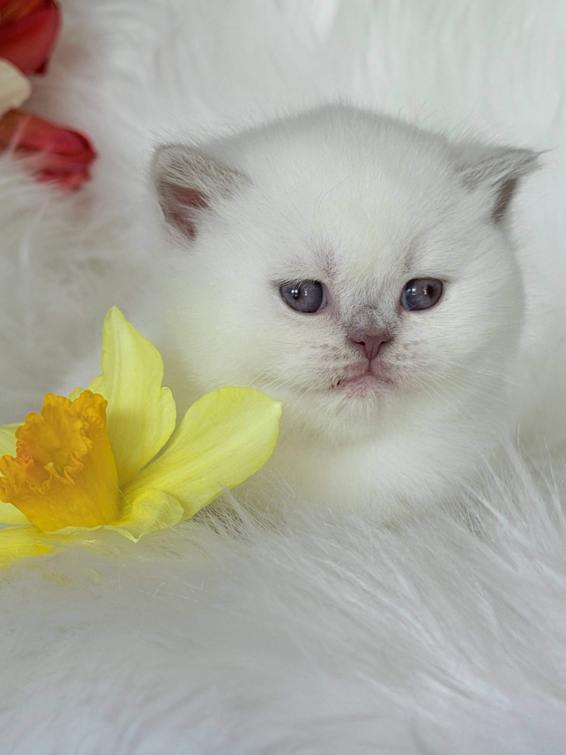 Evelyn, a Fawn Point British Shorthair kitten with luminous blue eyes, has a softness that begs for your touch. Her downy coat feels like spun cashmere as she melts into the warmth of your hands, purring steadily with gentle contentment. Her delicate points blend into her creamy coloring, making every cuddle feel like a rare treasure.