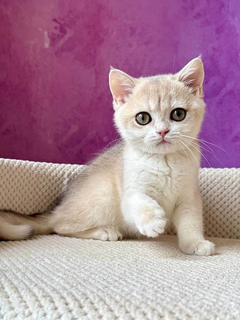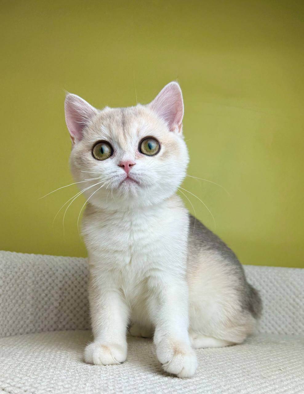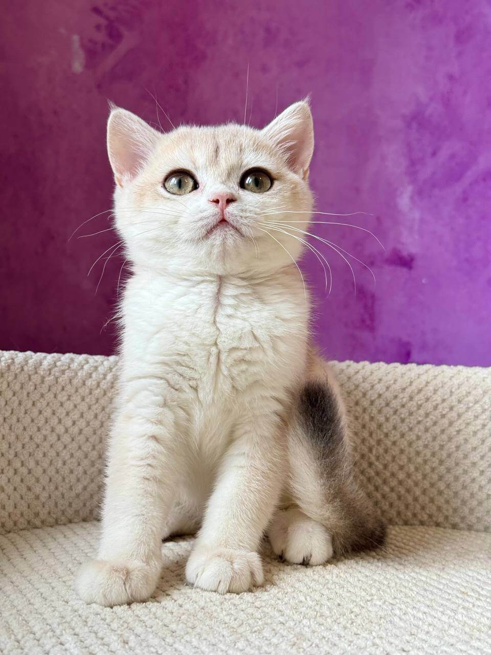 Meet Fabbi, a charming female British Shorthair with an exquisite blue golden shell coat and striking green eyes. Born on April 13, 2025, Fabbi boasts champion bloodlines and is of show quality, making her a perfect addition for those seeking a top-notch feline companion. She will be ready to leave her breeder’s care by August 13, 2025, and is located in Europe, with availability in the USA through reservation on our website.