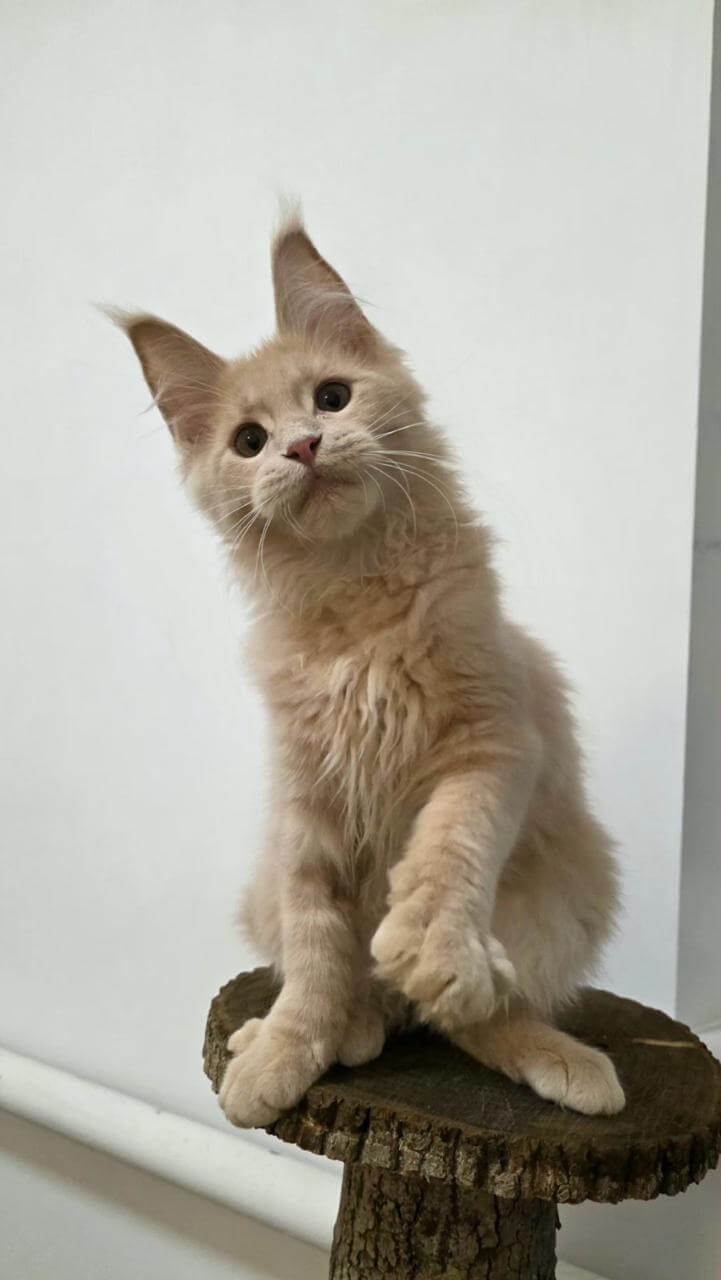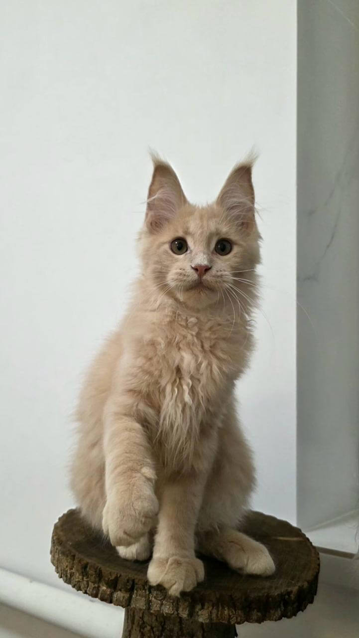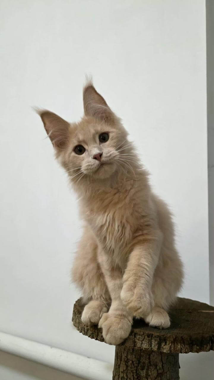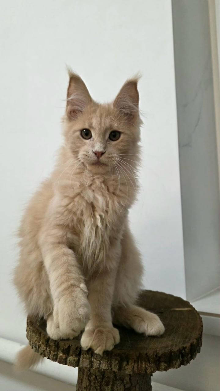 Fred, our Cream Maine Coon kitten, welcomes your touch with his impossibly soft, cloud-like coat—each strand a whisper under your fingers. The way his yellow eyes blink up at you, gentle and wide, hints at all the warmth and wisdom this Maine Coon will soon fill your home with. Wrapped in cream and gold, Fred feels at once regal and inviting.