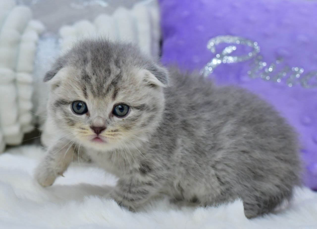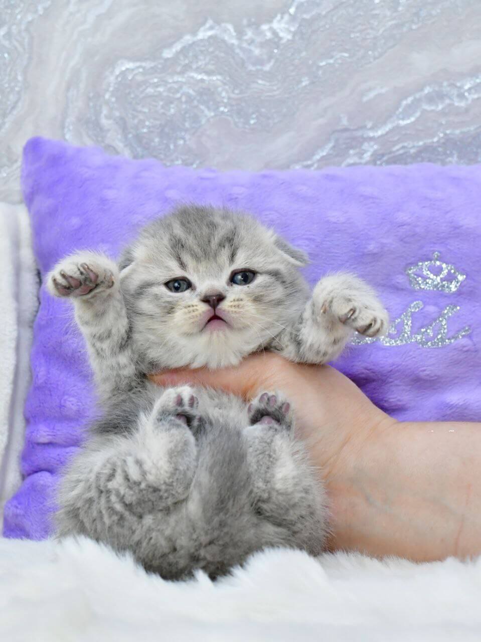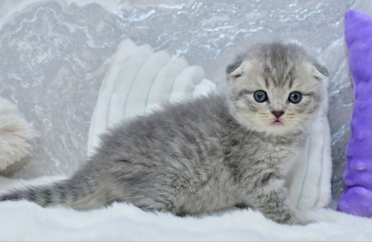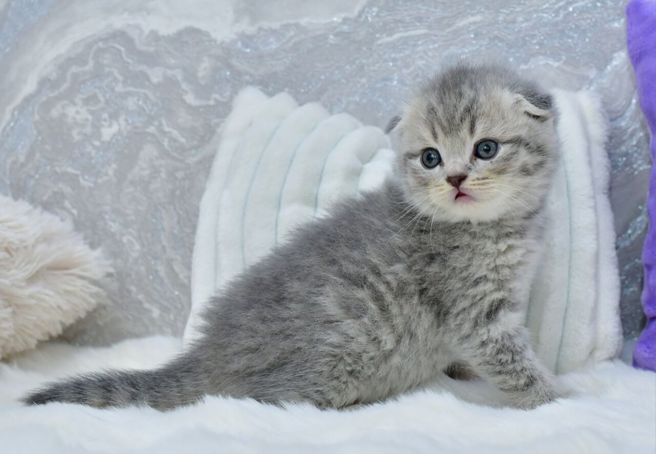 Meet Gucci, a breathtaking blue tabby spotted Scottish Fold boy whose gentle purr promises to melt your heart from the very first cuddle. With plush, cloud-soft fur and luminous golden-yellow eyes full of affection and curiosity, Gucci is the kind of kitten who’ll curl up in your arms and create instant calm and warmth.