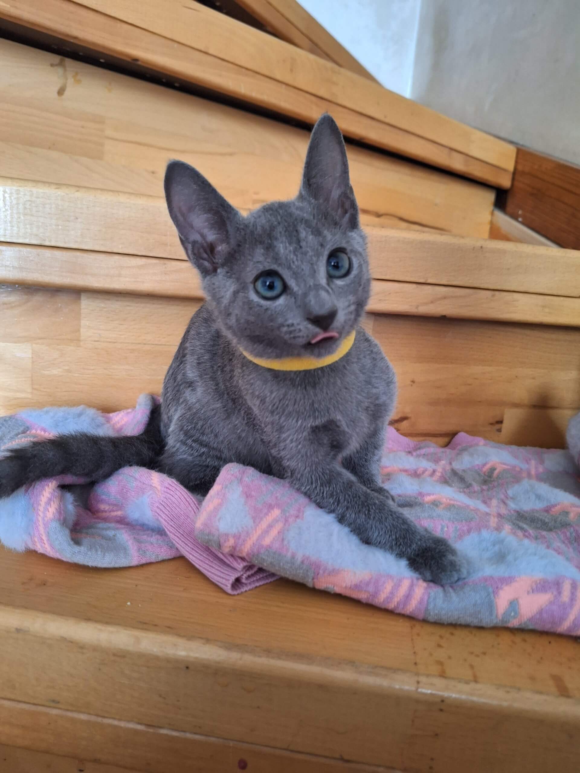 Meet Haiku, a breathtaking Russian Blue boy whose gentle emerald eyes and soft blue coat promise a lifetime of cozy cuddles and soulful companionship. When Haiku gazes at you, his sweet spirit shines—a calm, affectionate kitten who loves nestling close and purrs softly the moment you stroke his silken fur.
