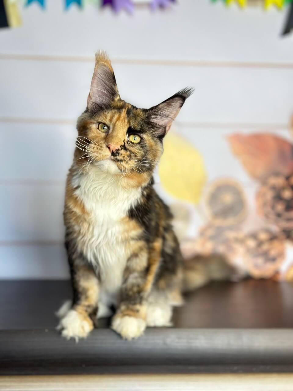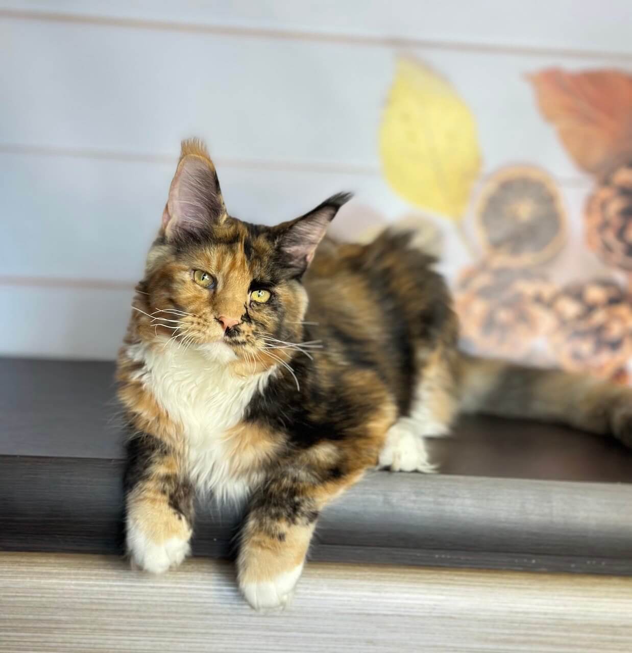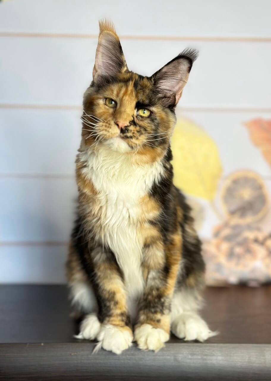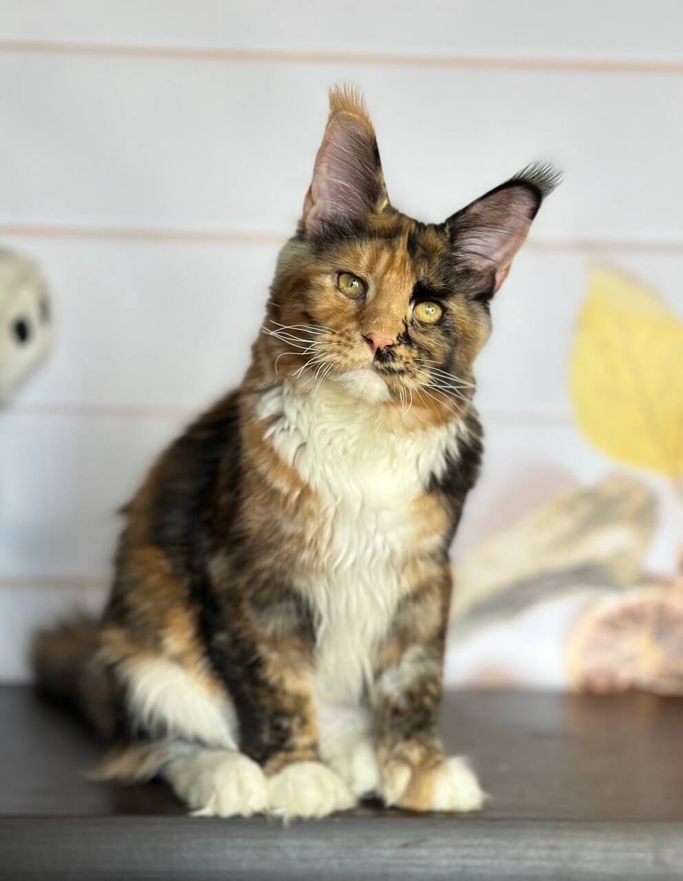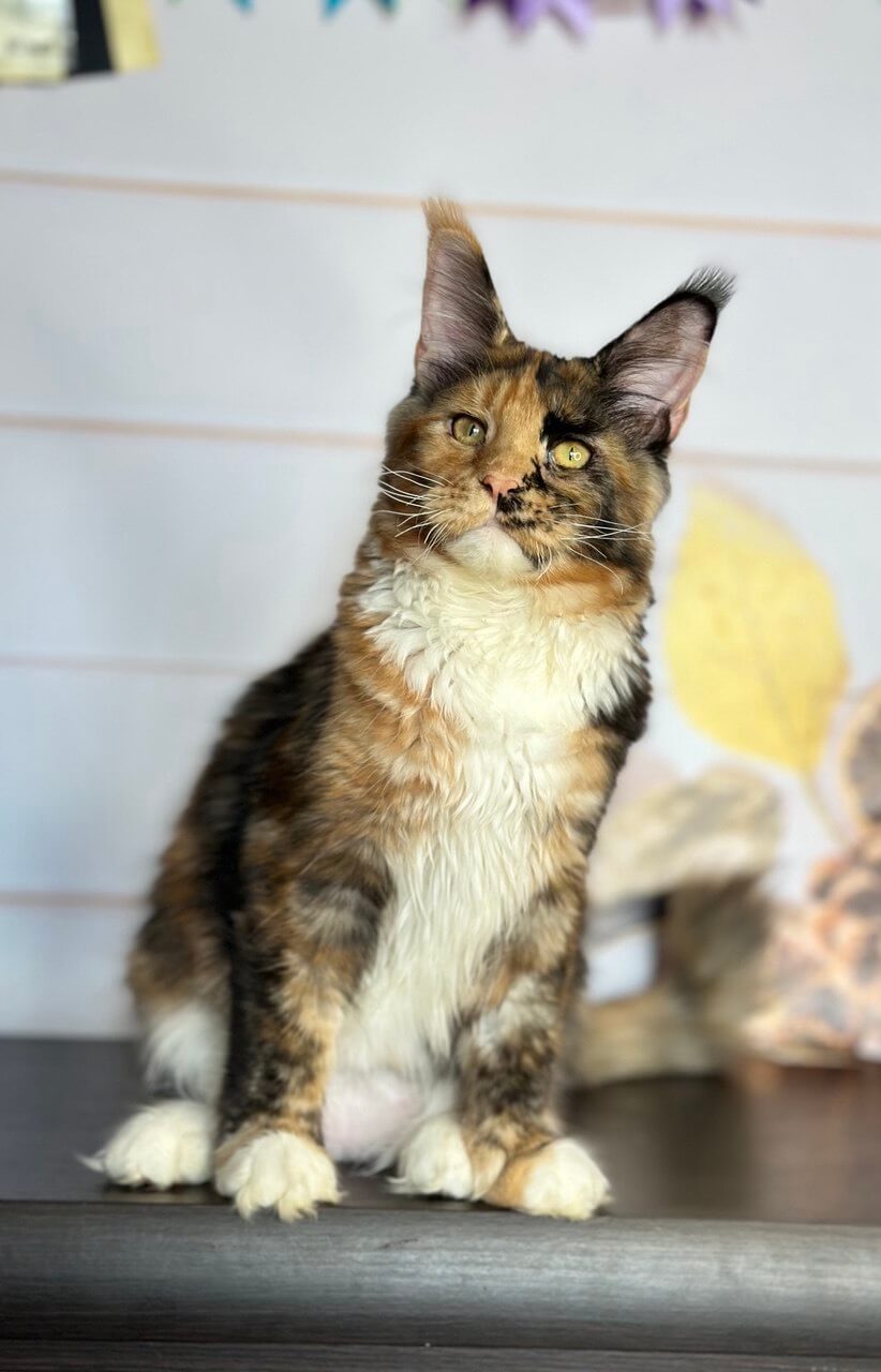 Meet Hloya, a stunning female Maine Coon kitten with a striking black tortie and white coat complemented by mesmerizing yellow eyes. Born on April 10, 2025, Hloya is anticipated to join her new family after August 10, 2025. With champion bloodlines and registered credentials, she boasts show-quality features. Hloya is available in the USA through reservation on our website and can be picked up at our location in Wood Dale, or delivered to other states from Chicago. Our dedicated 7-day support service ensures all her needs are met. She will be neutered/spayed as a pet, but can also be sold with breeding rights if requested. Secure this charming kitten with a $500 non-refundable deposit and feel free to reach out for further details. Follow us on Instagram to see more of our delightful kittens!