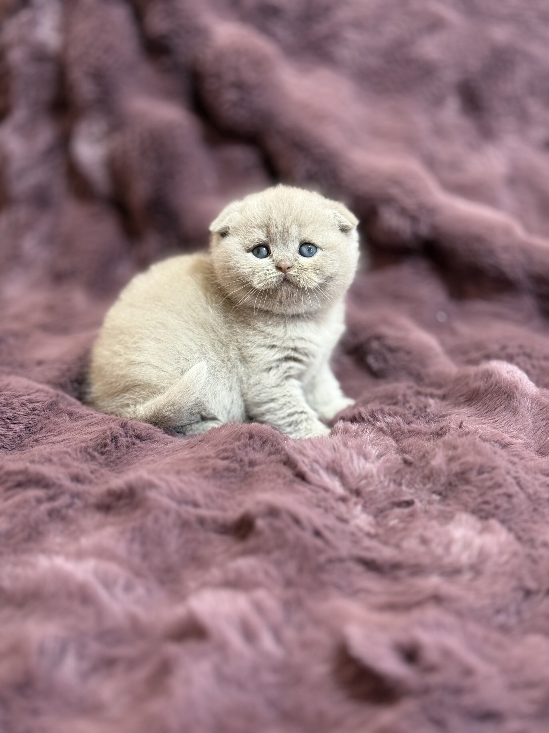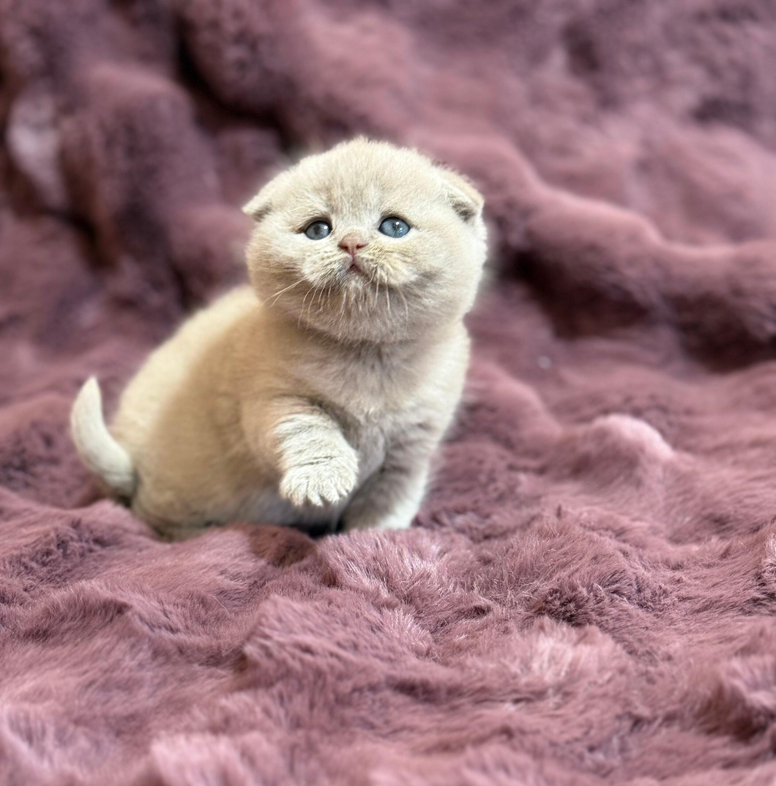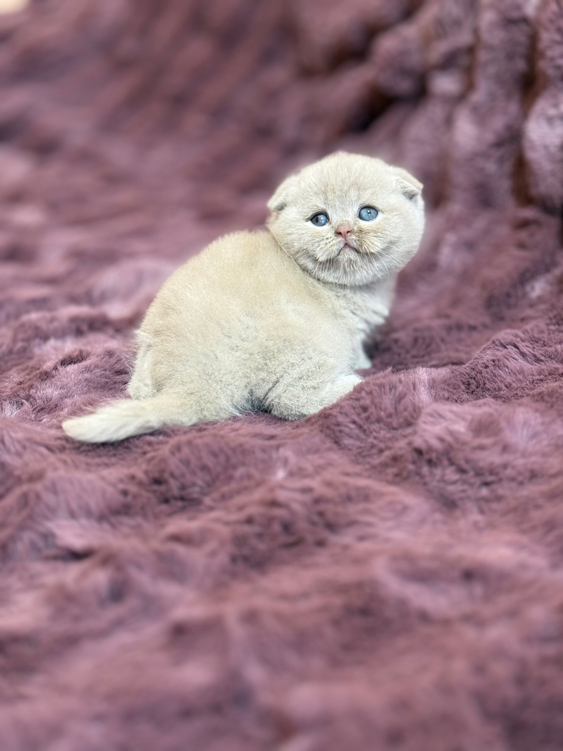 Meet Holly – a gentle fawn Scottish Fold whose golden-yellow eyes promise warmth and endless cuddles. The moment you lay eyes on her, you’ll feel your heart soften—her plush fur and darling folded ears beg to be touched, while her calm, loving spirit fills every room with quiet happiness.