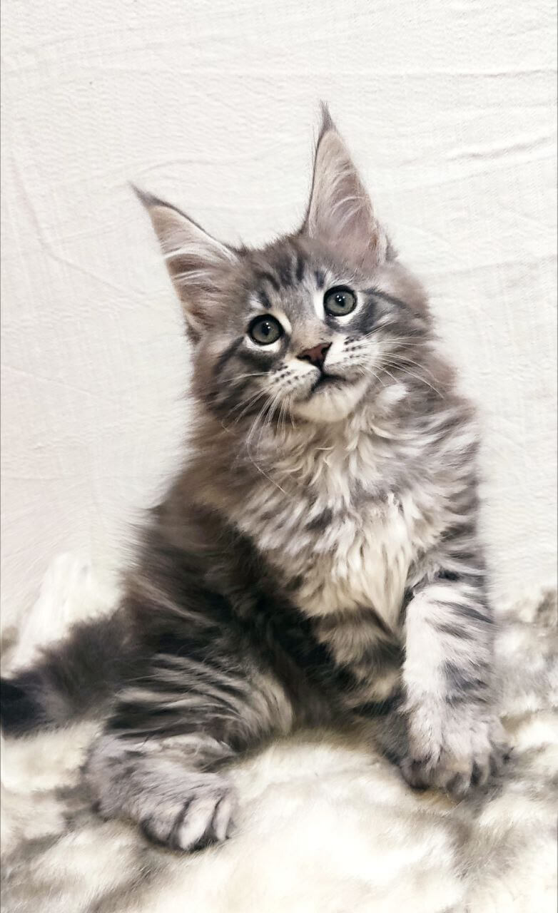 Icarus is not only stunning to look at, with his striking silver swirls and velvet-soft coat, he’s also a gentle, affectionate soul. This playful show-quality kitten loves to nuzzle, follows you like a shadow, and adores cozy cuddle sessions. With champion bloodlines and a friendly, well-socialized temperament, he’s the kind of companion who will fill your days with laughter and love.