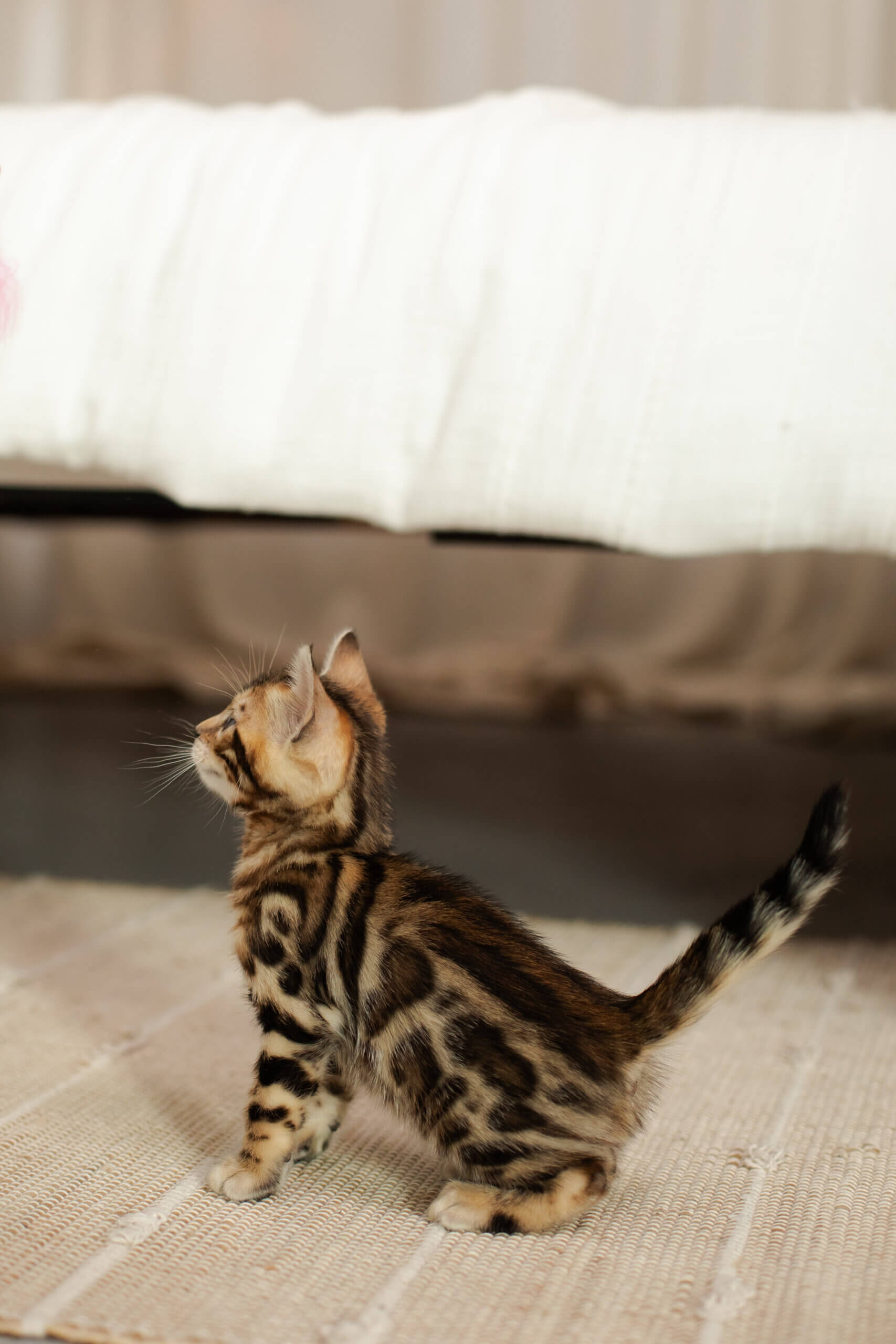 Fall in love at first touch: Jack’s velvety brown spotted coat ripples beneath your fingers, while soulful green eyes lock onto yours, exuding warmth and trust from the very first purr. He’s the kitten who meets you at the door and curls into your lap, paws outstretched for gentle hugs.