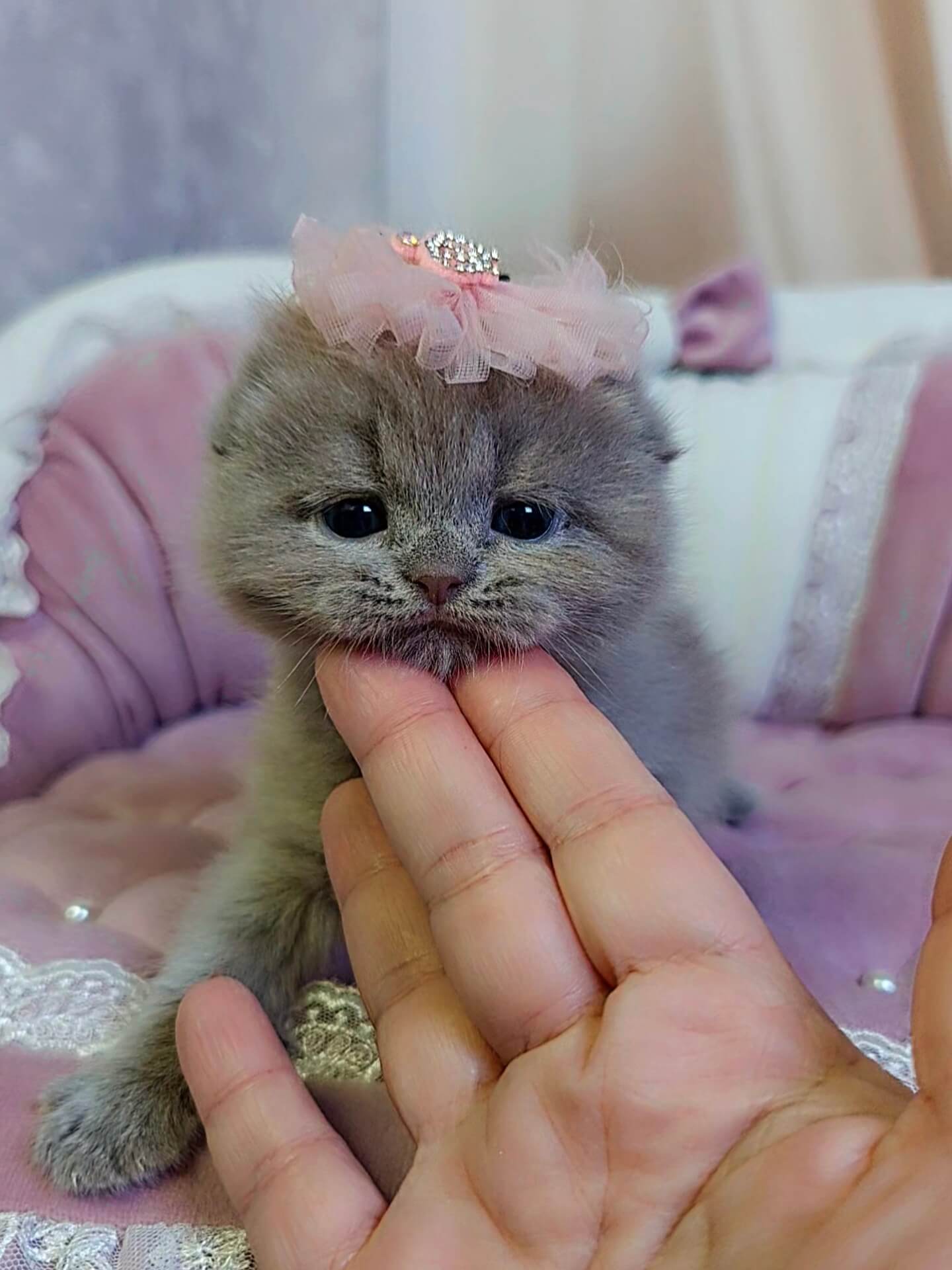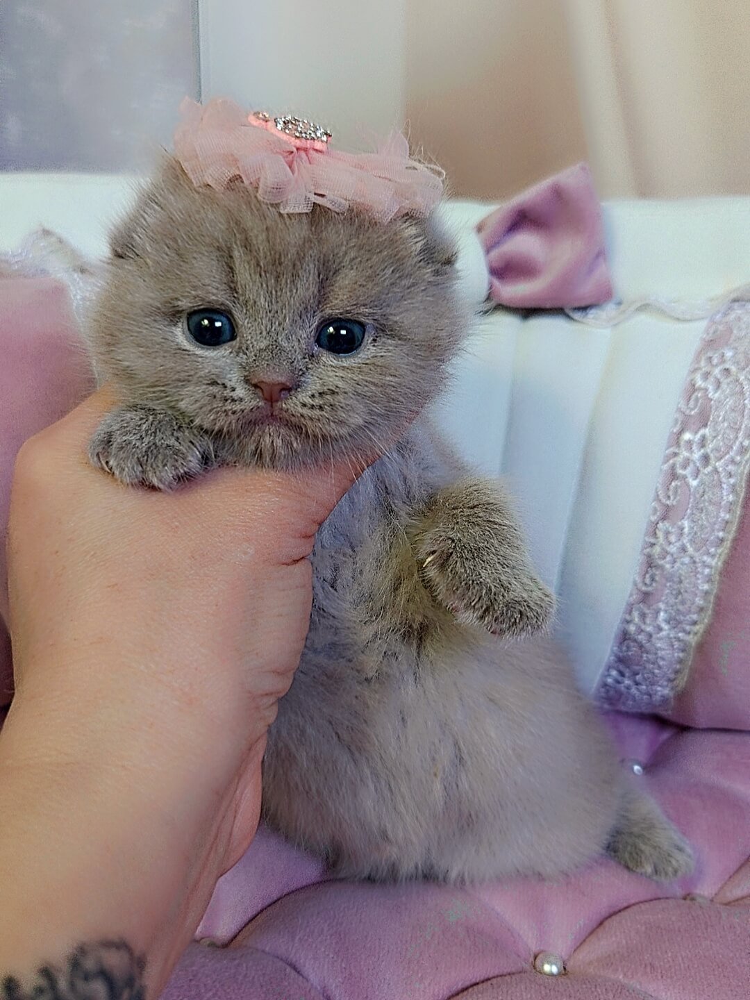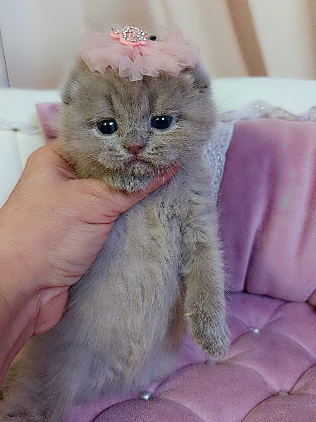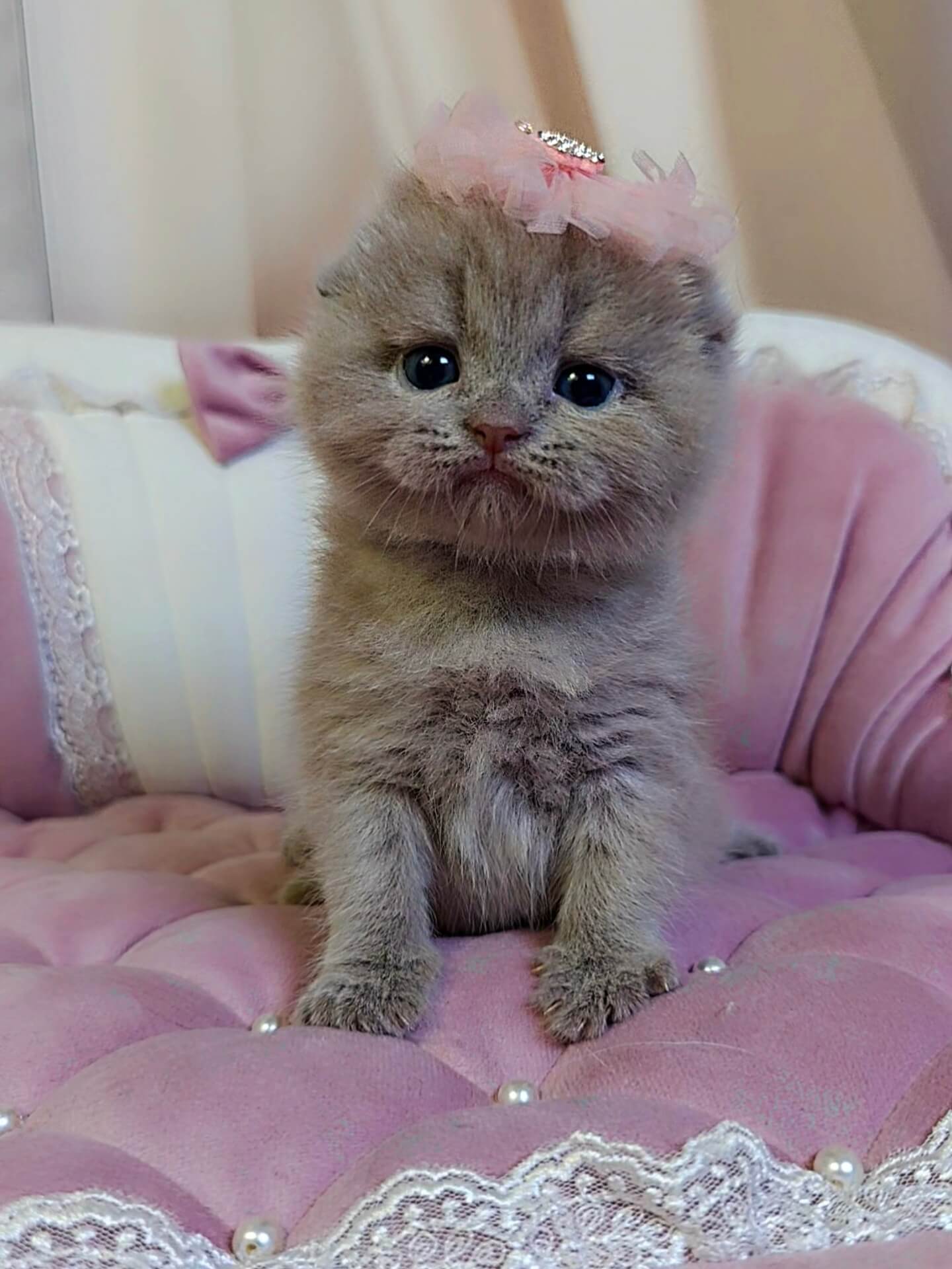 Jaffa’s plush lilac coat invites your hand, softer than velvet and warming to the touch. Her round, folded ears frame a face made unforgettable by those deep, golden-yellow eyes—the gaze is bright, gentle, and steady, drawing you in with a calm contentment unique to a Lilac Scottish Fold kitten. The lightest weight nestling into your lap, purring trustingly.