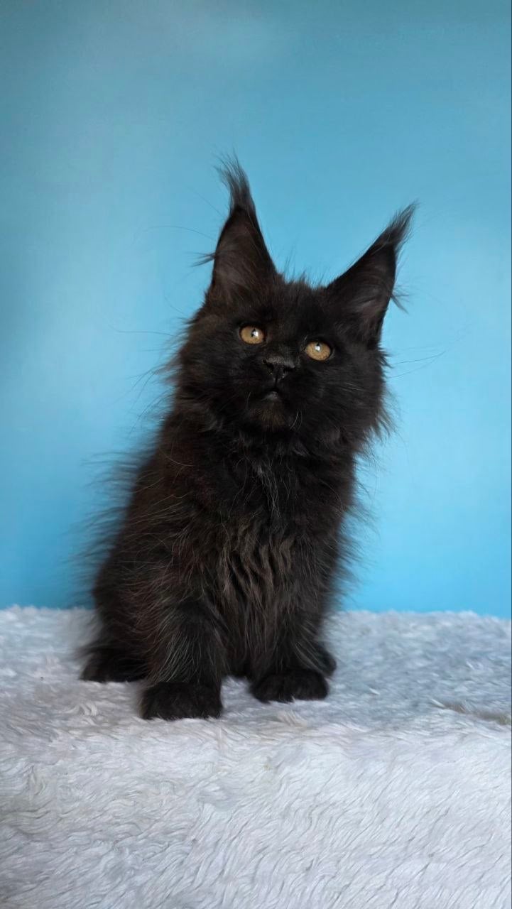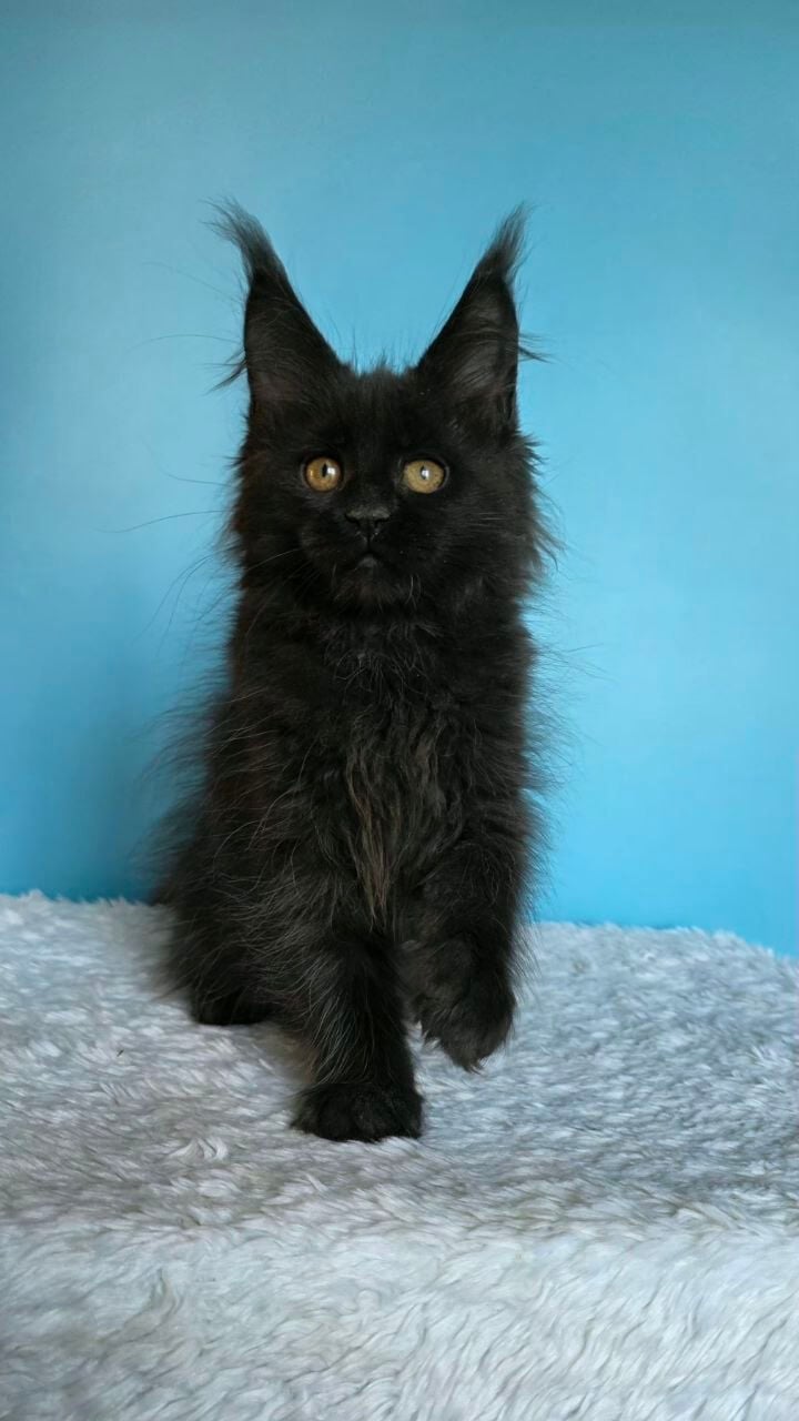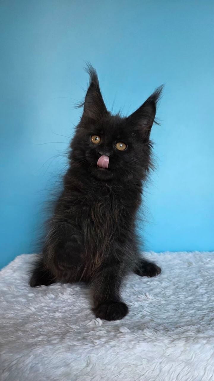 Janet’s luxurious black Maine Coon kitten coat is thick, silky, and somehow always seems to catch the light with bronze undertones. When you lift her, it’s like holding a small, warm weight that instantly relaxes in your arms. Her yellow eyes, bright and searching, fix on you with a penetrating, thoughtful gaze.
